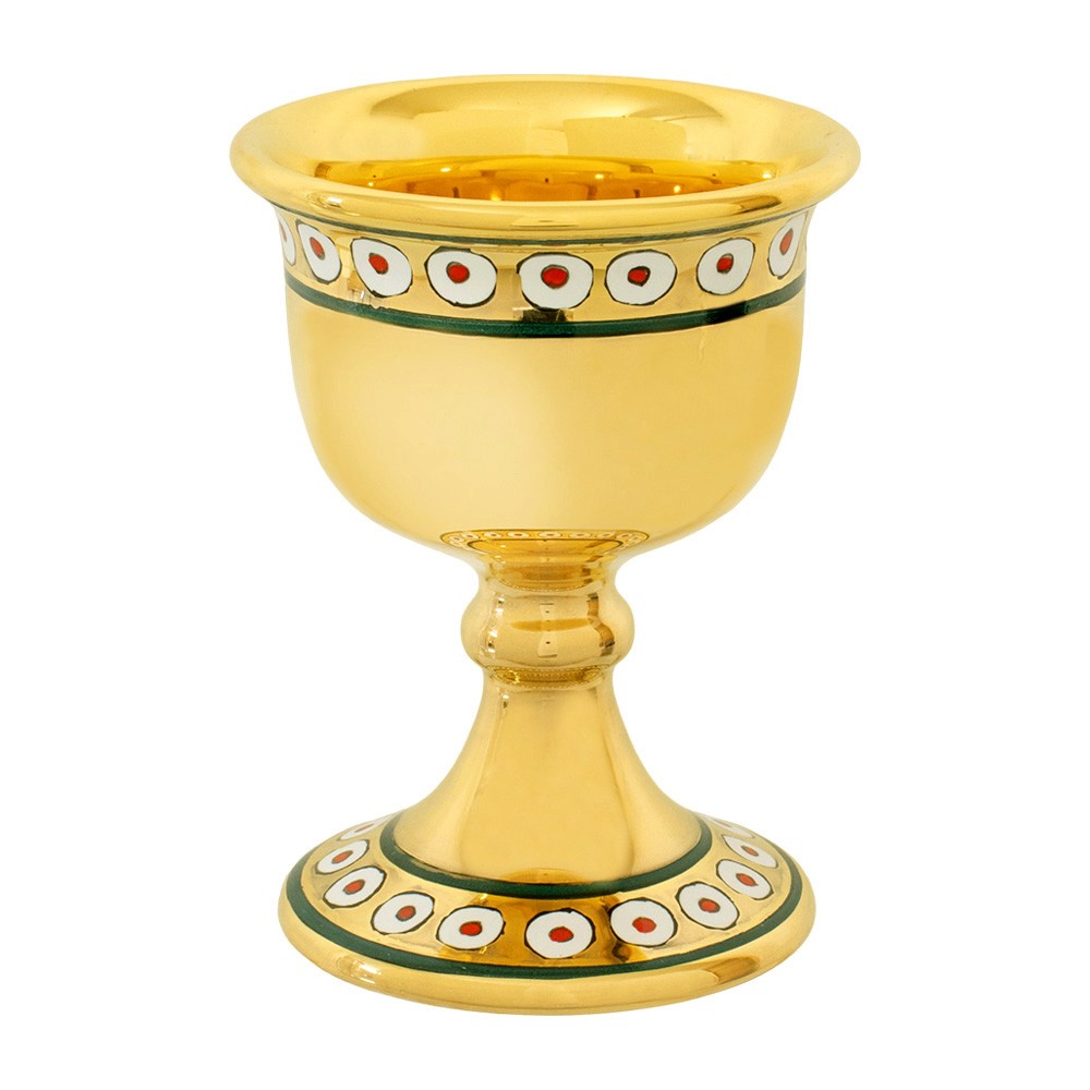 The inside of the chalice is made of gold leaf, which is suitable for contact with hosts during the mass celebration, as prescribed by liturgy.