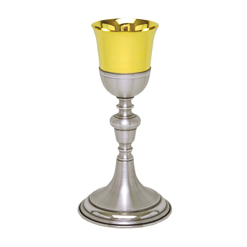 Complete set of chalice and ciborium in two-tone brass with plain node.