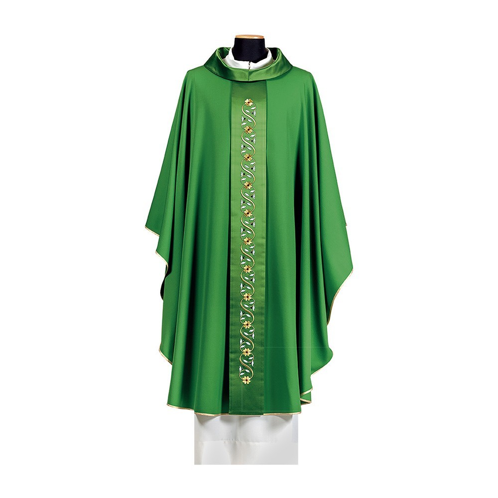 Liturgical chasuble made of 100% wool fabric with round neck. The beauty of this liturgical vestment lies in its finely embroidered orphrey. Good fit thanks to the round neck and loose fit