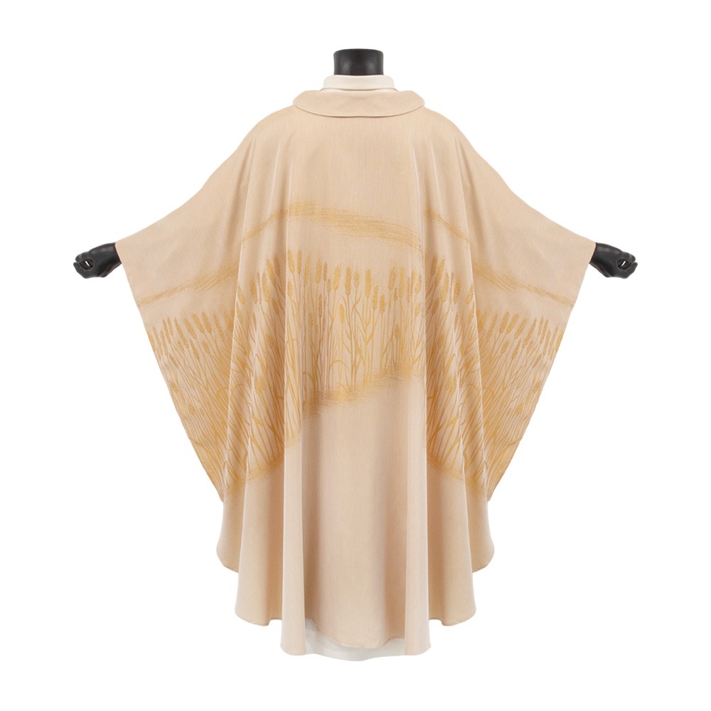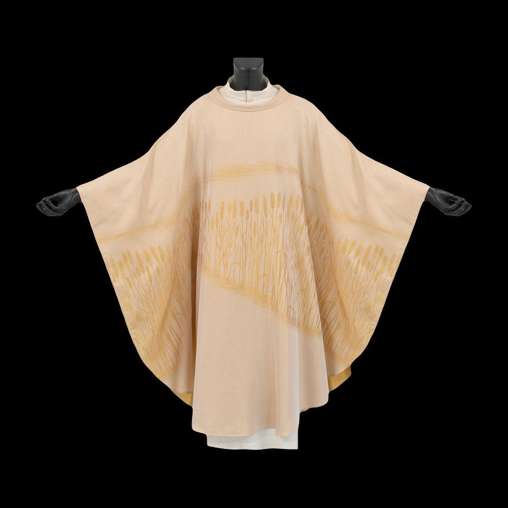 Chasuble with custom machine embroidery, made of lightweight and breathable polyester fabric.