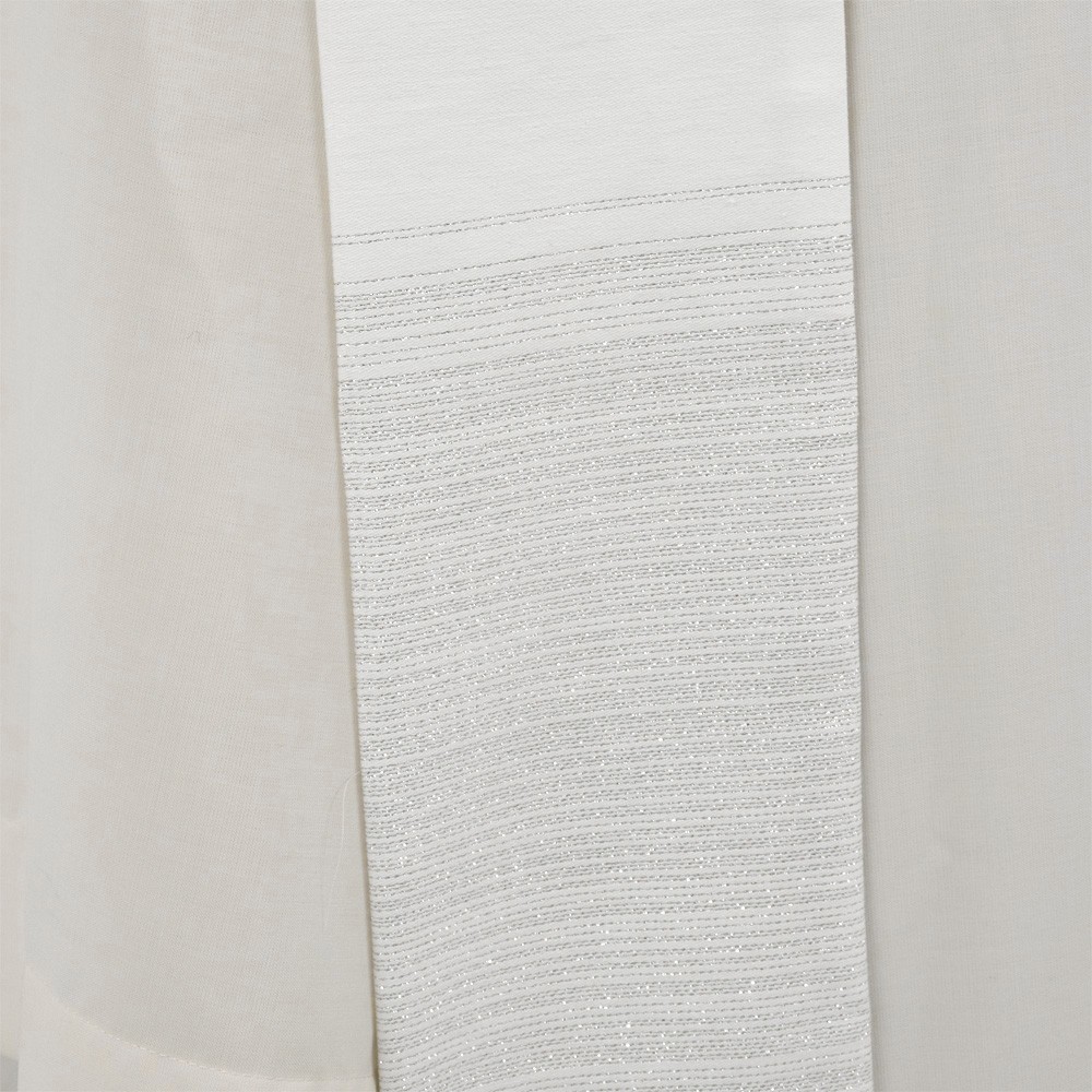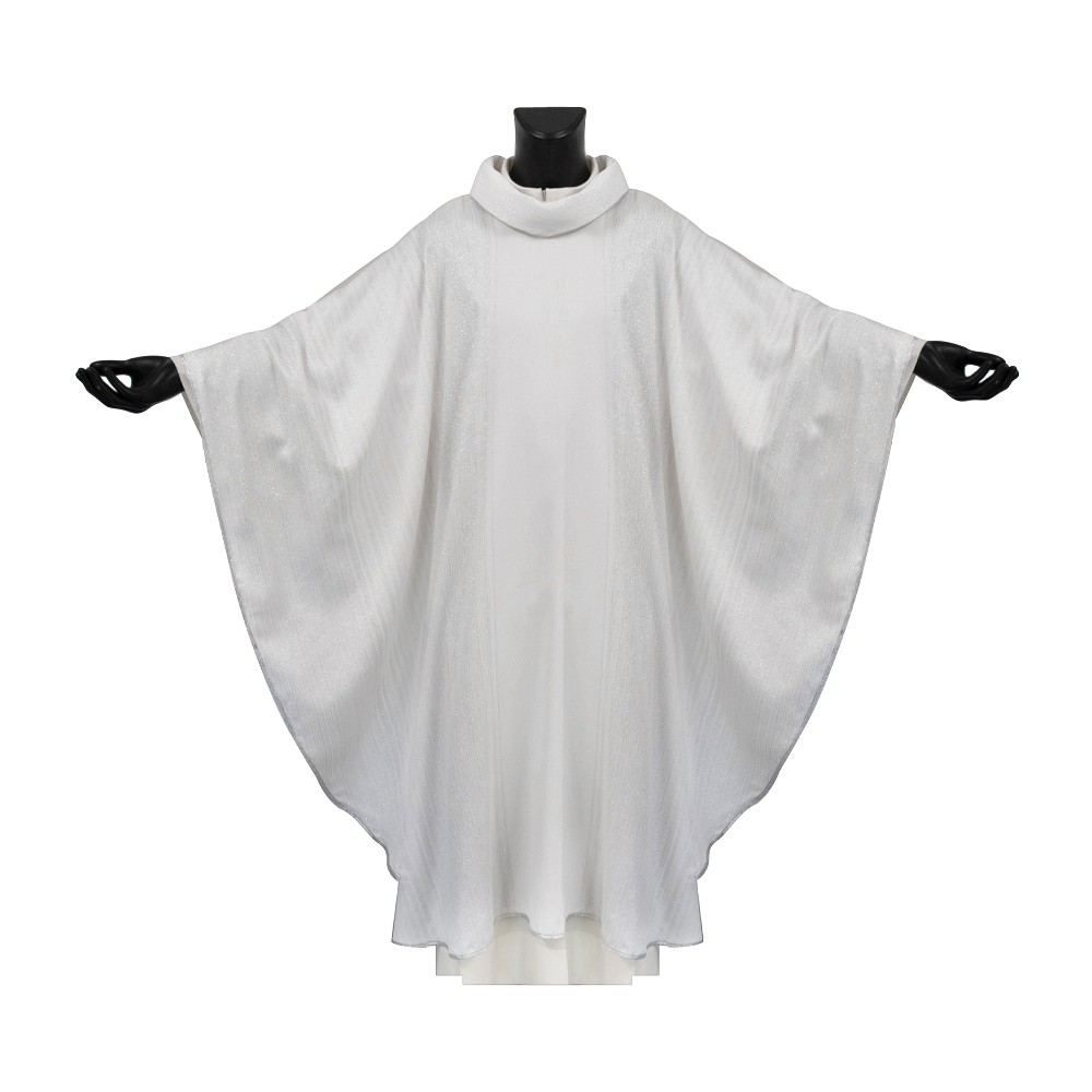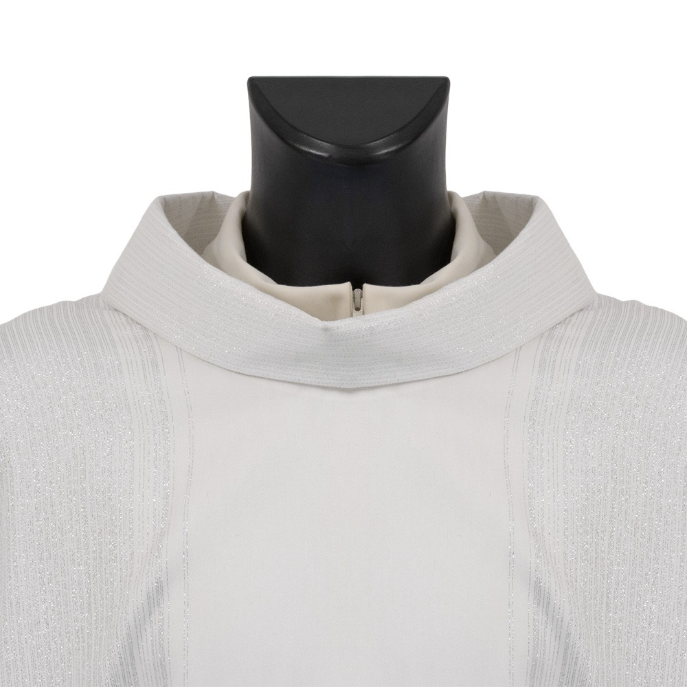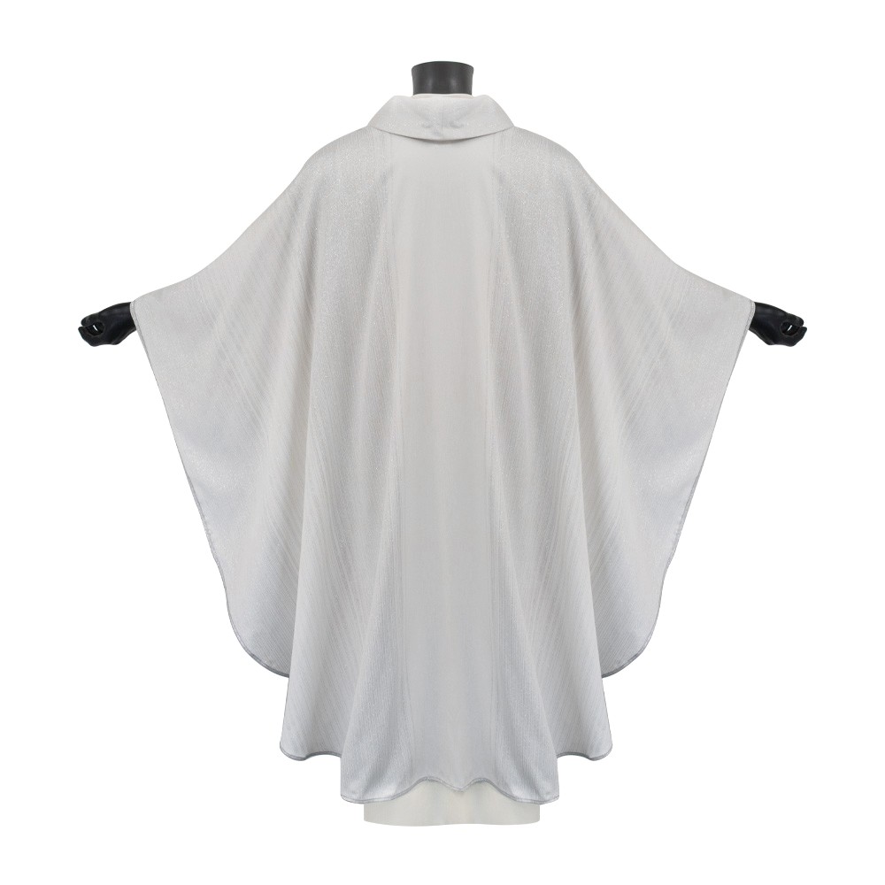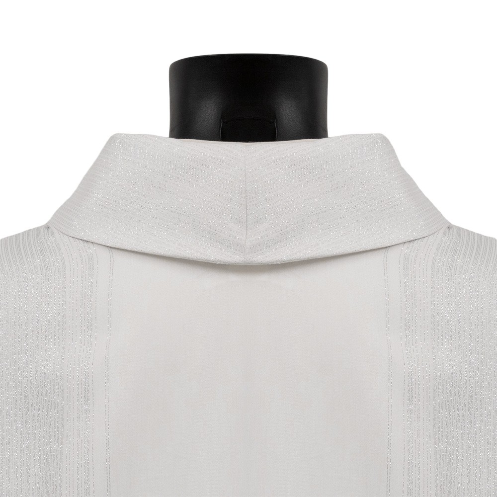 Priest chasuble of white/ivory color with round neck and stripes in lurex silver.