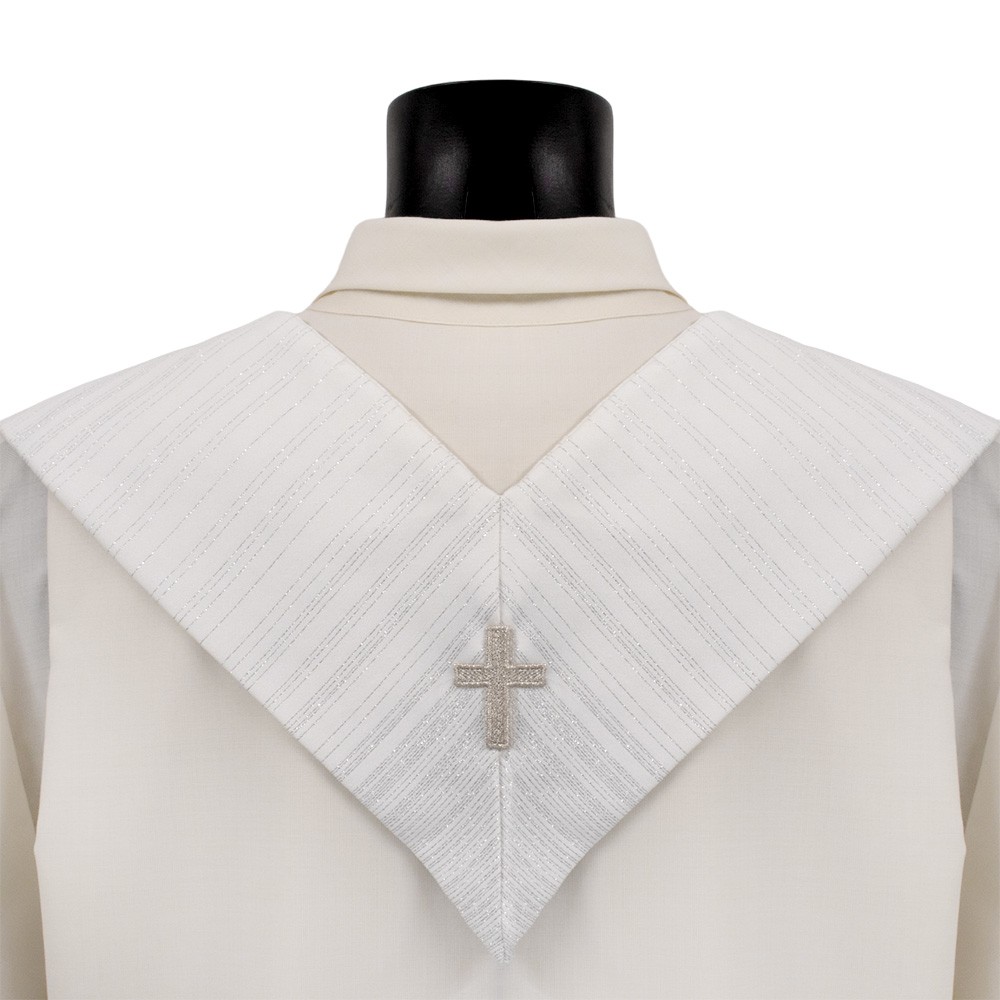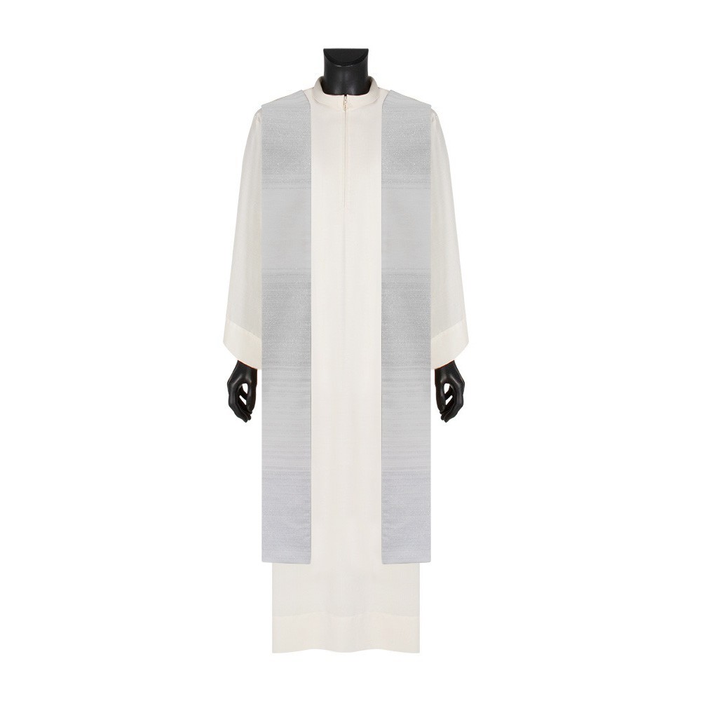 This vestment is made of fresh and lightweight blend fabric of cotton (81%) and polyester (19%). Silver stripes create a play of shades.