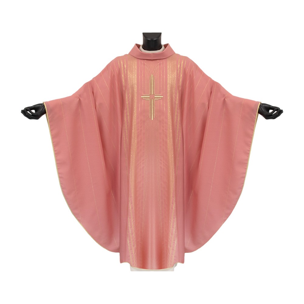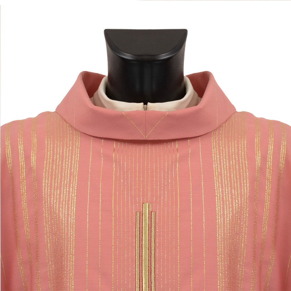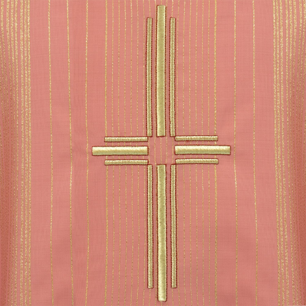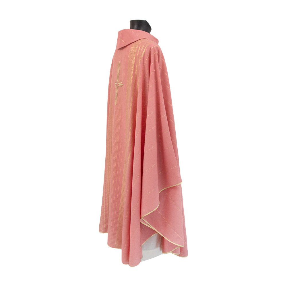 Priest chasuble of pink color in striped fabric blend of wool and lurex; lightweight and breathable.