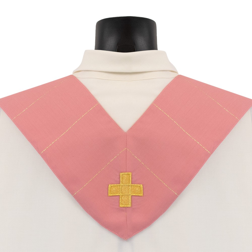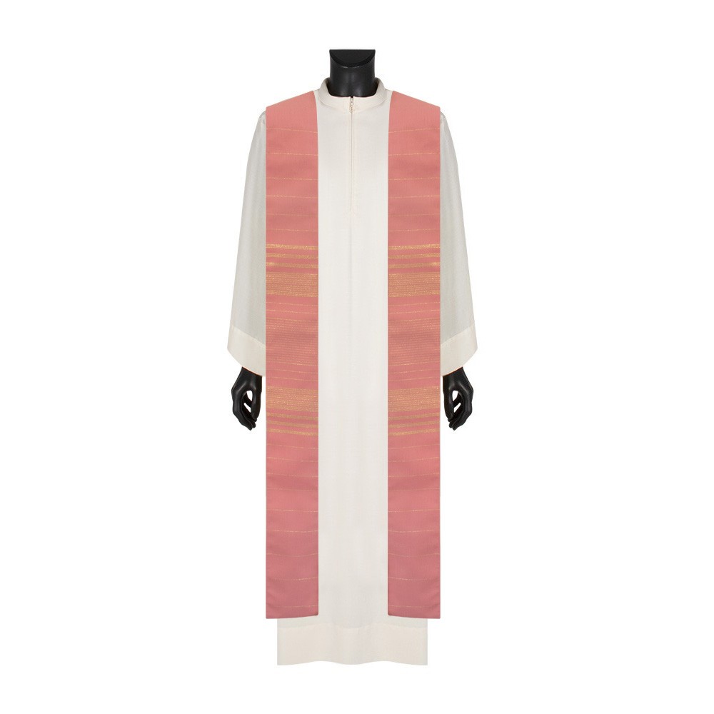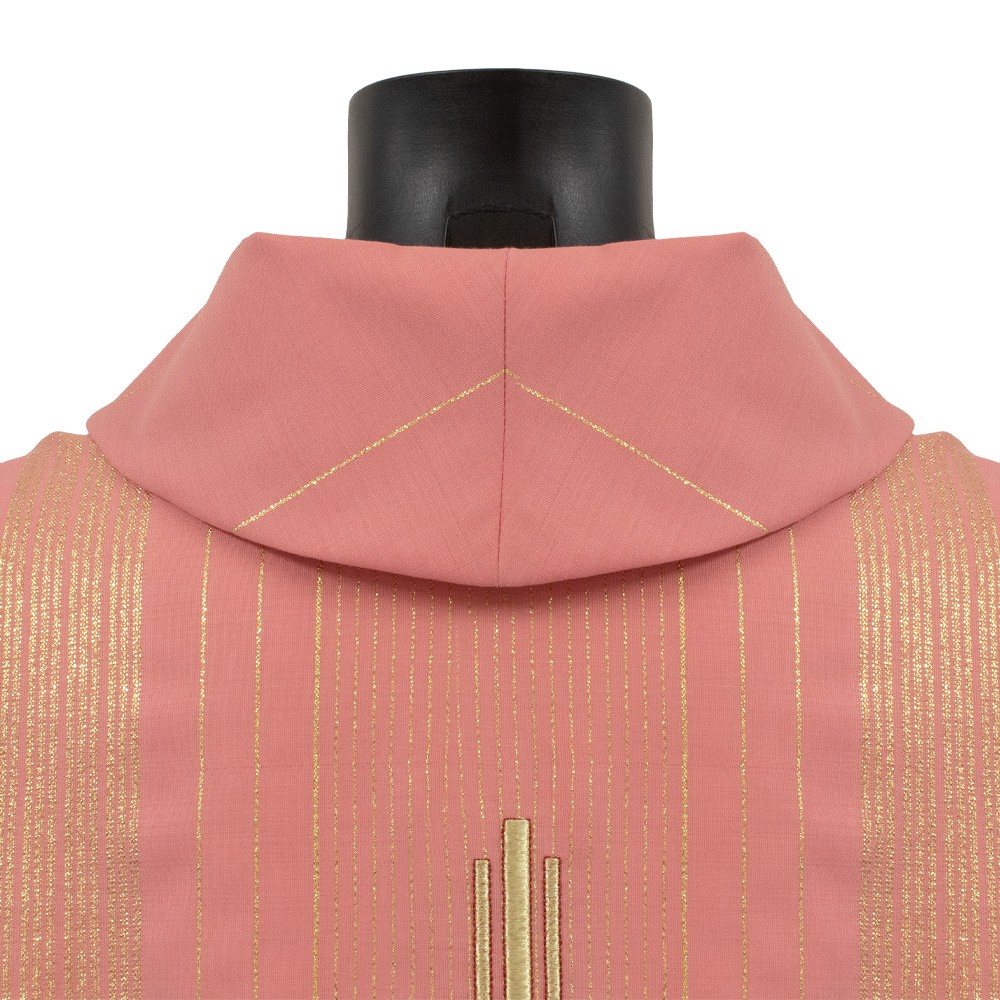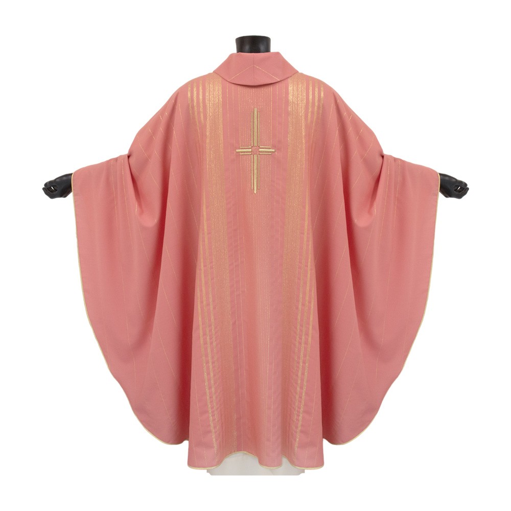 Priest chasuble of pink color in striped fabric blend of wool and lurex; lightweight and breathable.