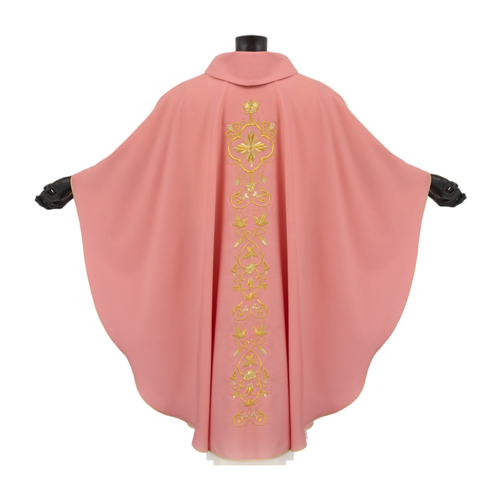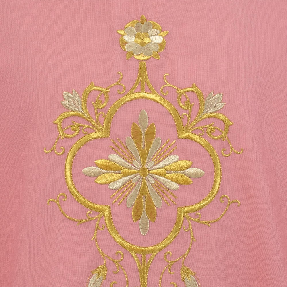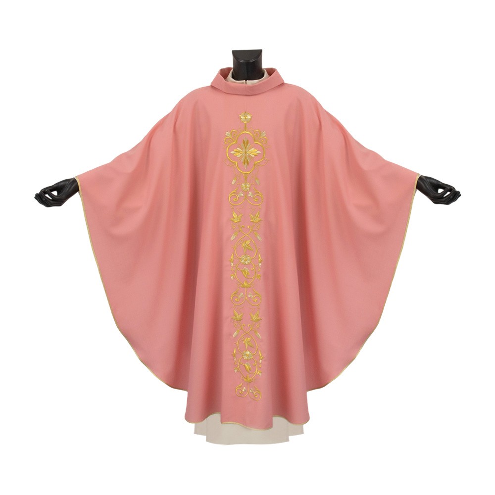 Pink chasuble for priest, made of pure wool fabric and finished with golden bias tape along the edges.