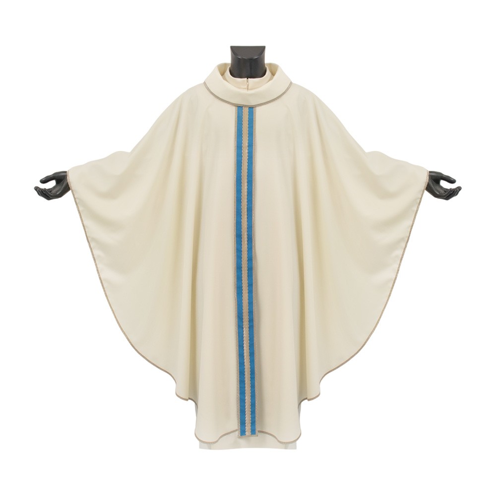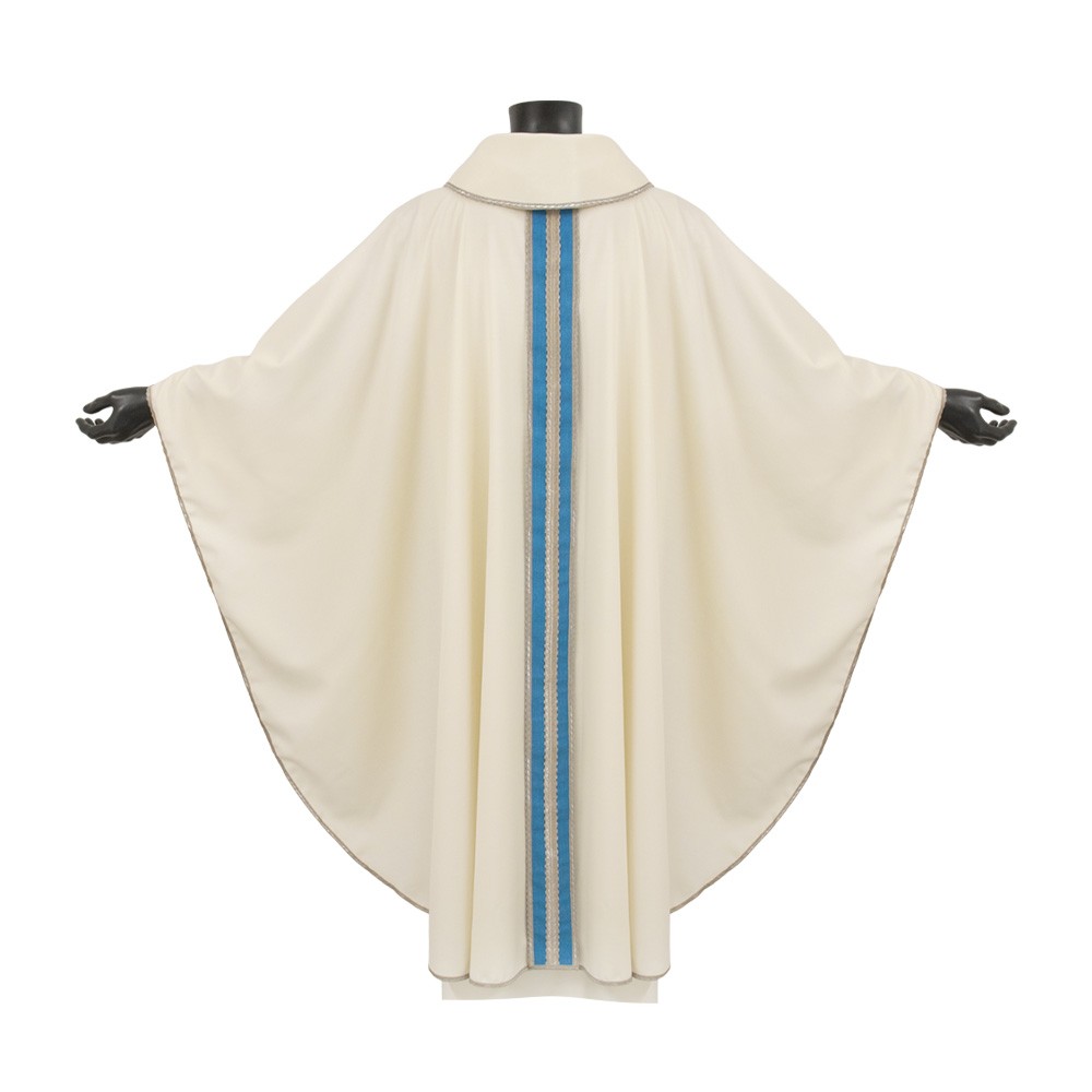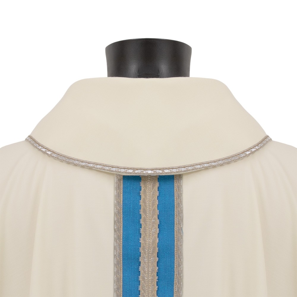 Marian chasuble for priest with comfortable round neck, classic cut and orphrey with “Palmette” border trim.