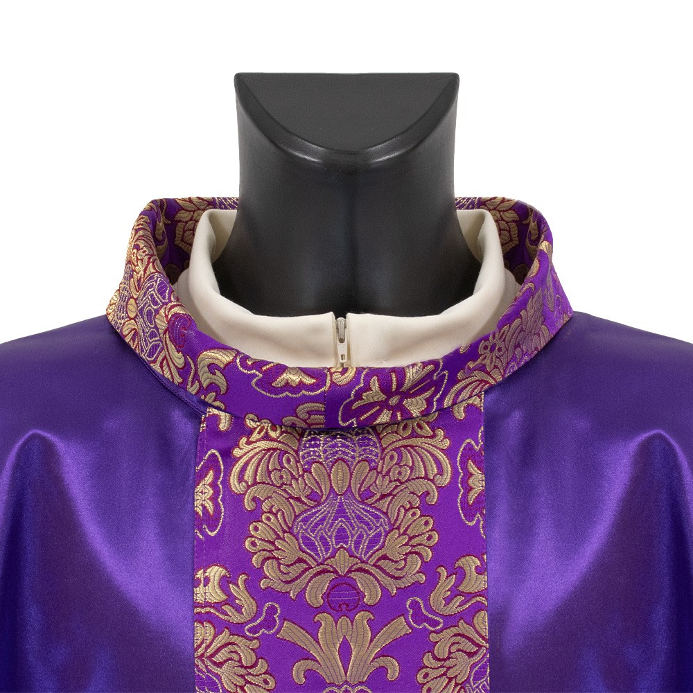 Priest chasuble in lightweight polyester with orphrey in brocade satin fabric.