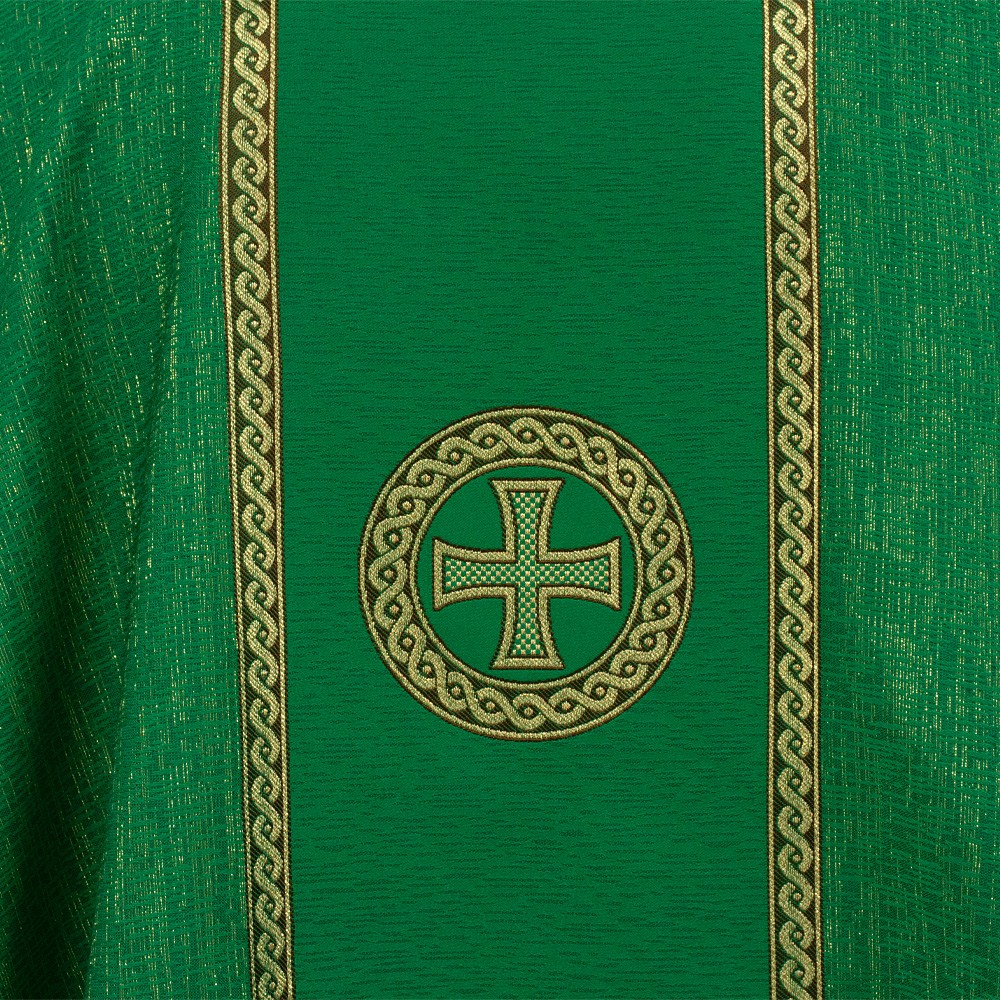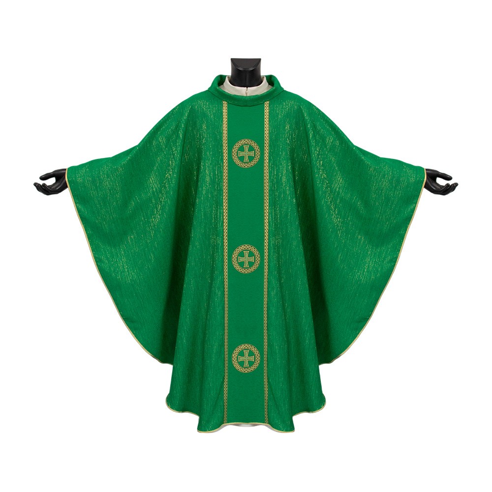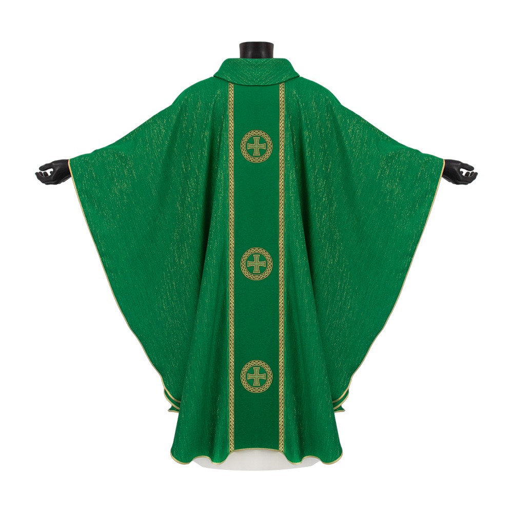 This vestment is made of fabric blend of wool and polyester, with practical cowl neck and decorated orphrey with three mosaic crosses on both the front and back. The fine embroidery is accurately made by machine using excellent quality yarn.