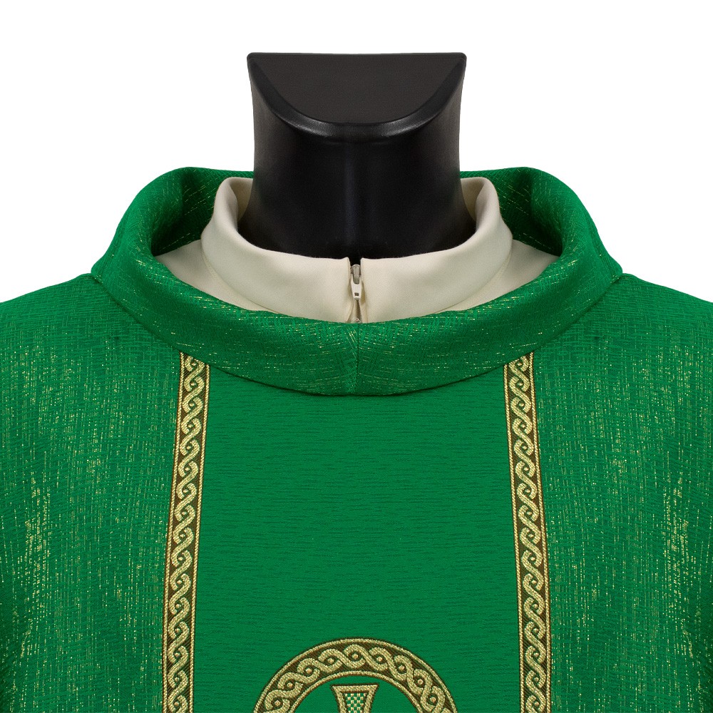 Liturgical chasuble with embroidered orphrey and cowl neck.