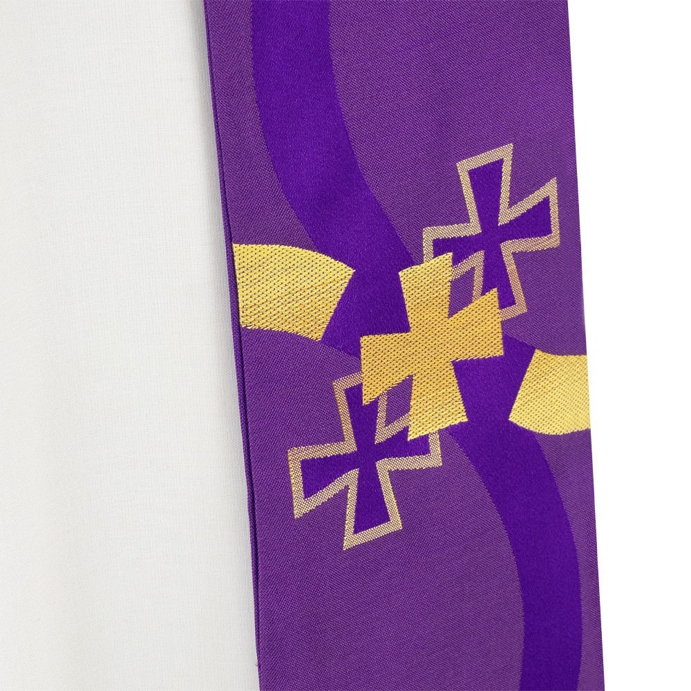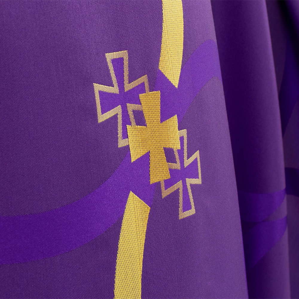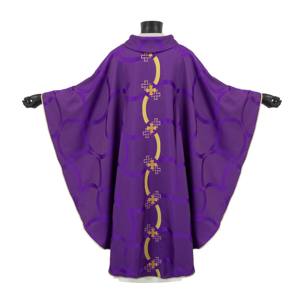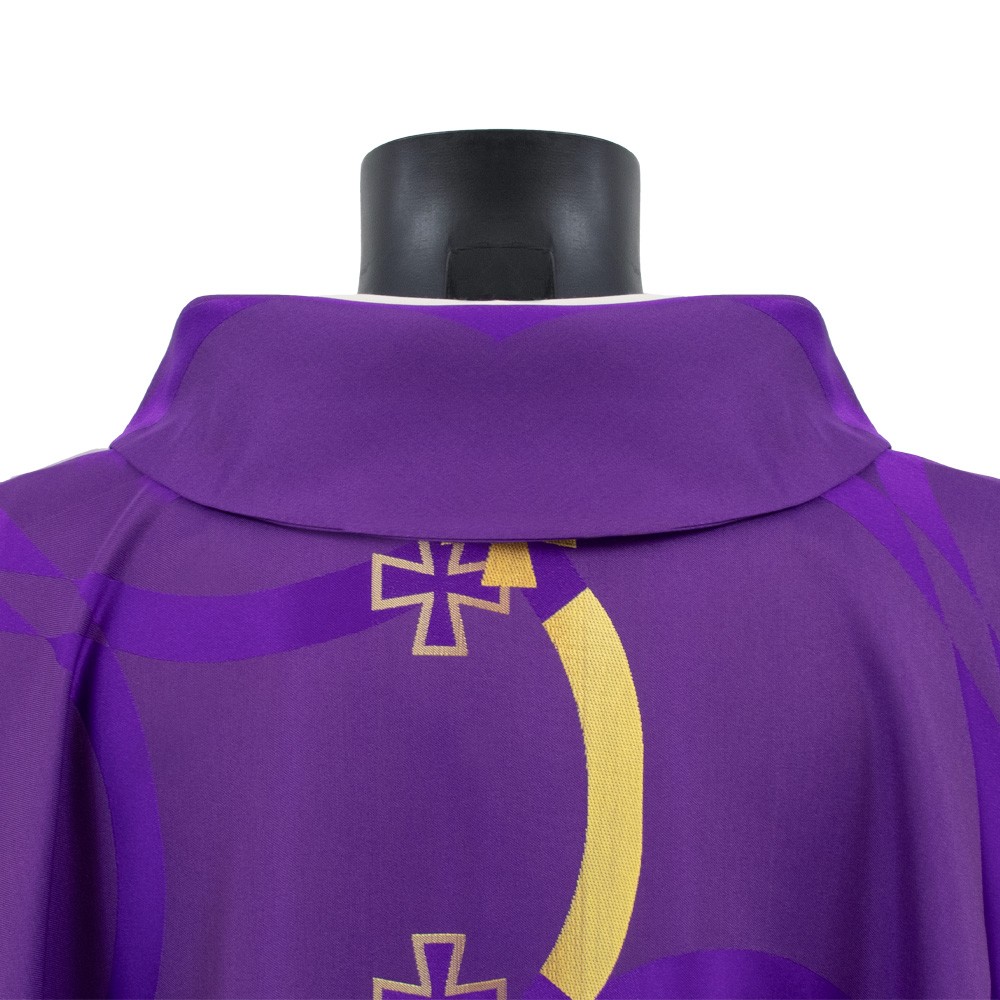 Purple liturgical chasuble with a ring collar and decorative column crosses.