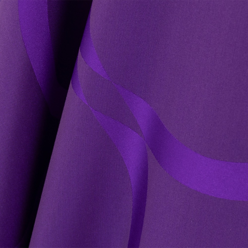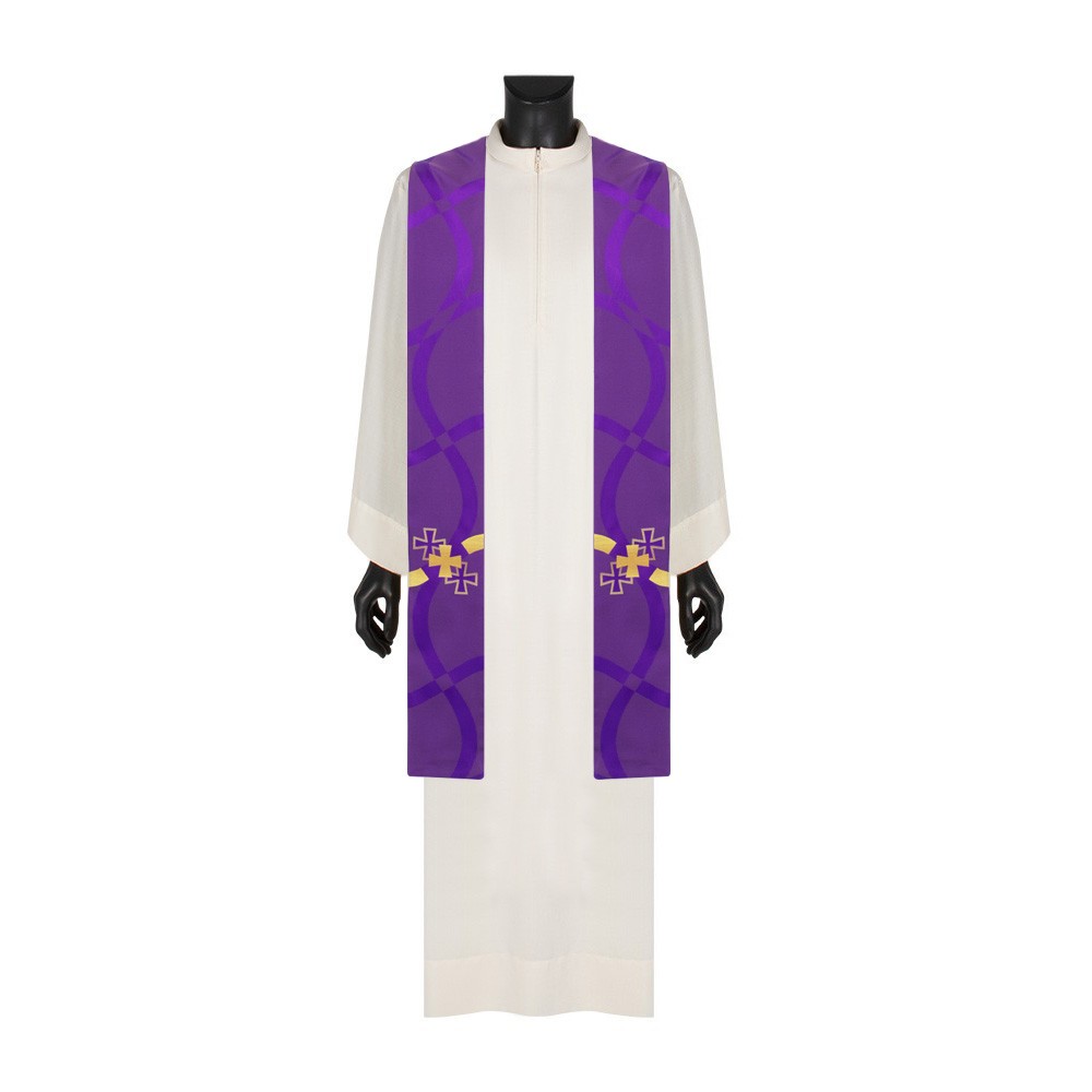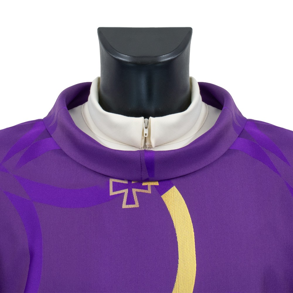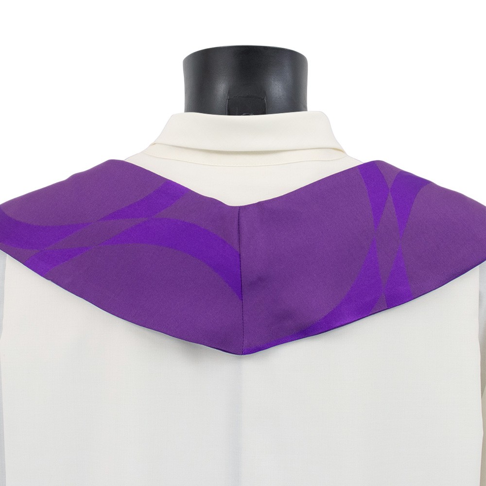 Purple liturgical chasuble with a ring collar and decorative column crosses.