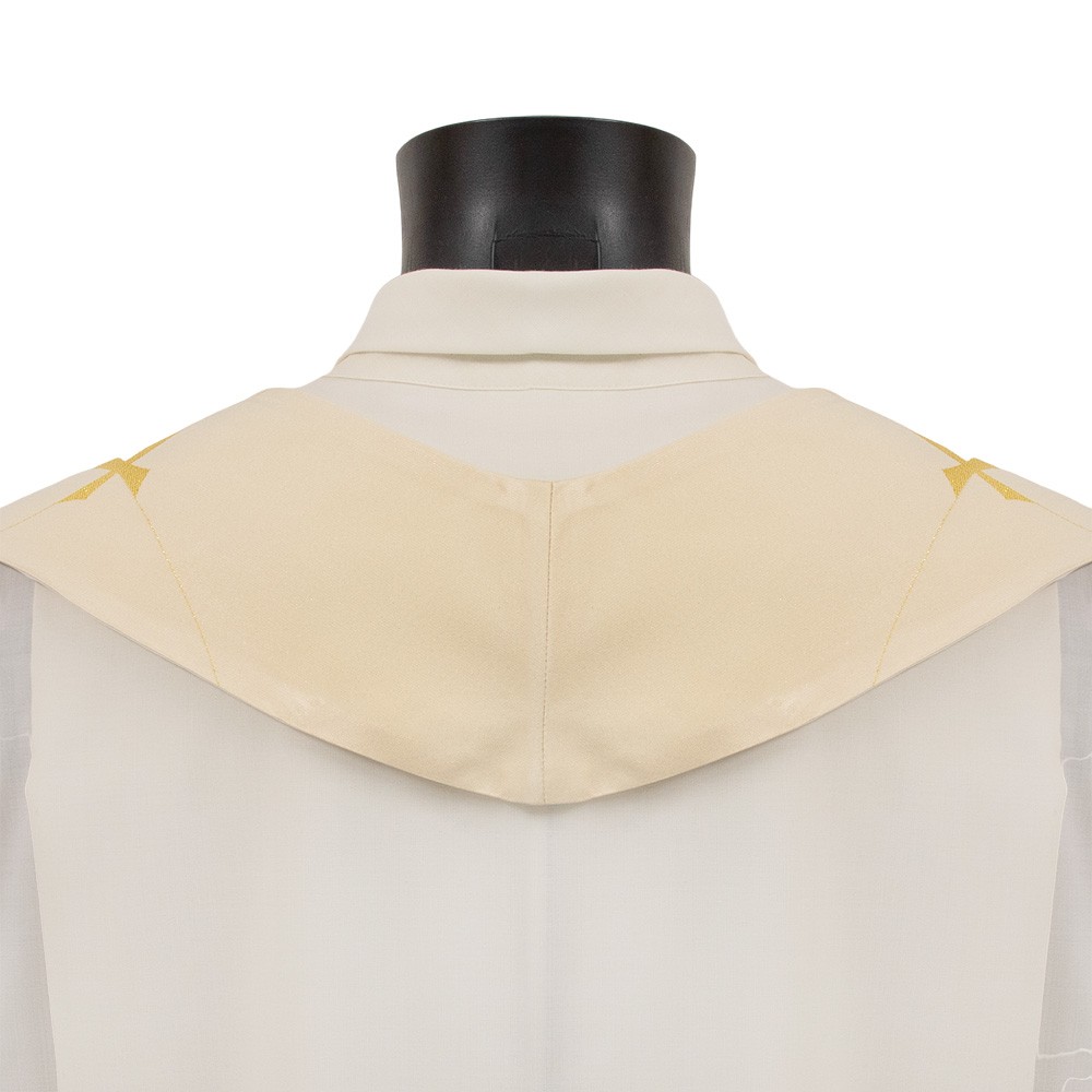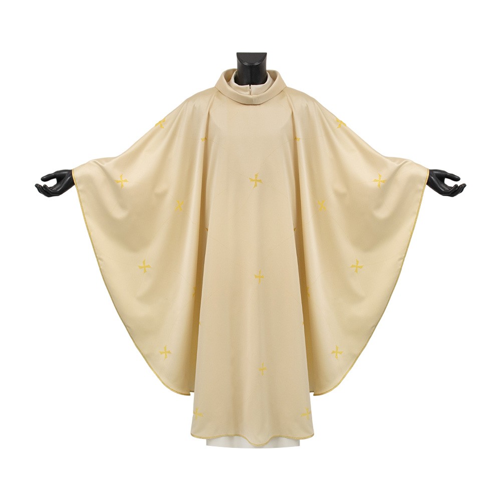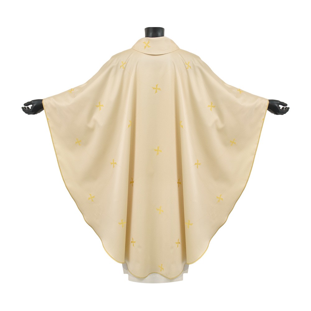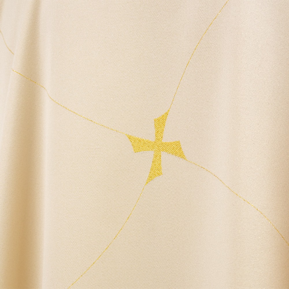 Liturgical chasuble of ivory color with golden decorations; made of lightweight polyester fabric.