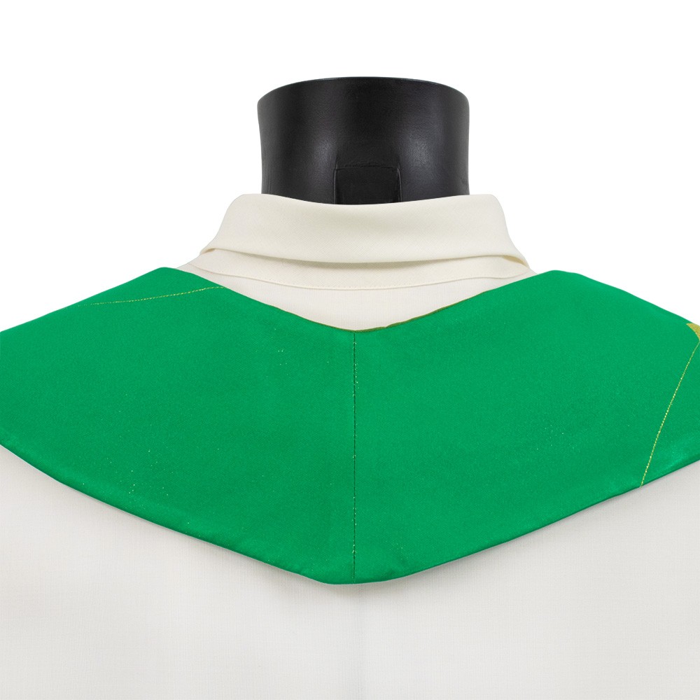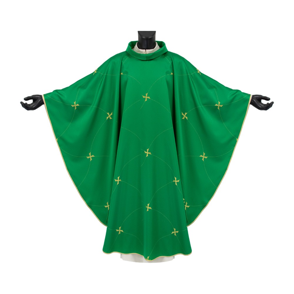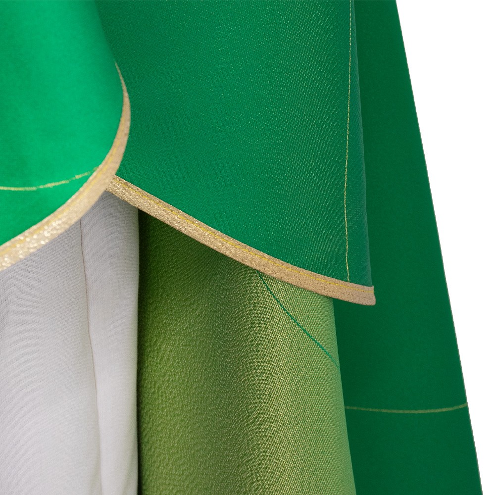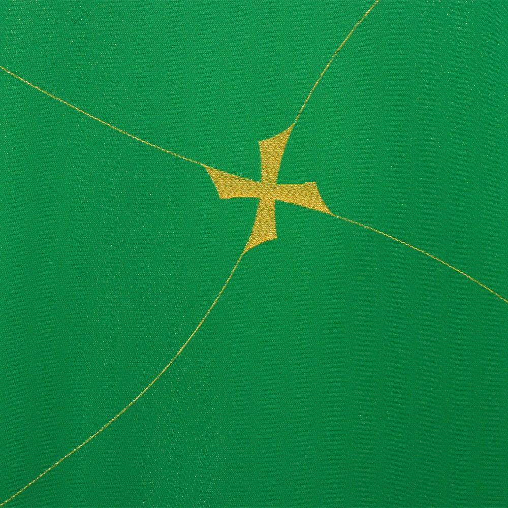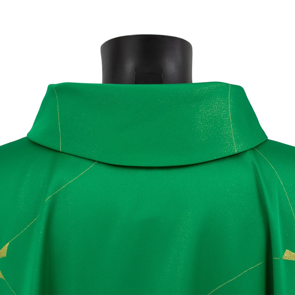 Green liturgical chasuble with gold decorations, crafted in lightweight polyester fabric.