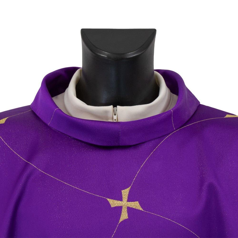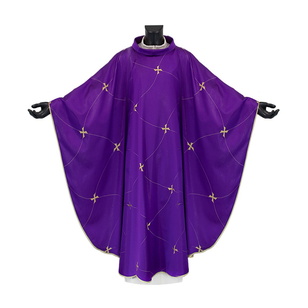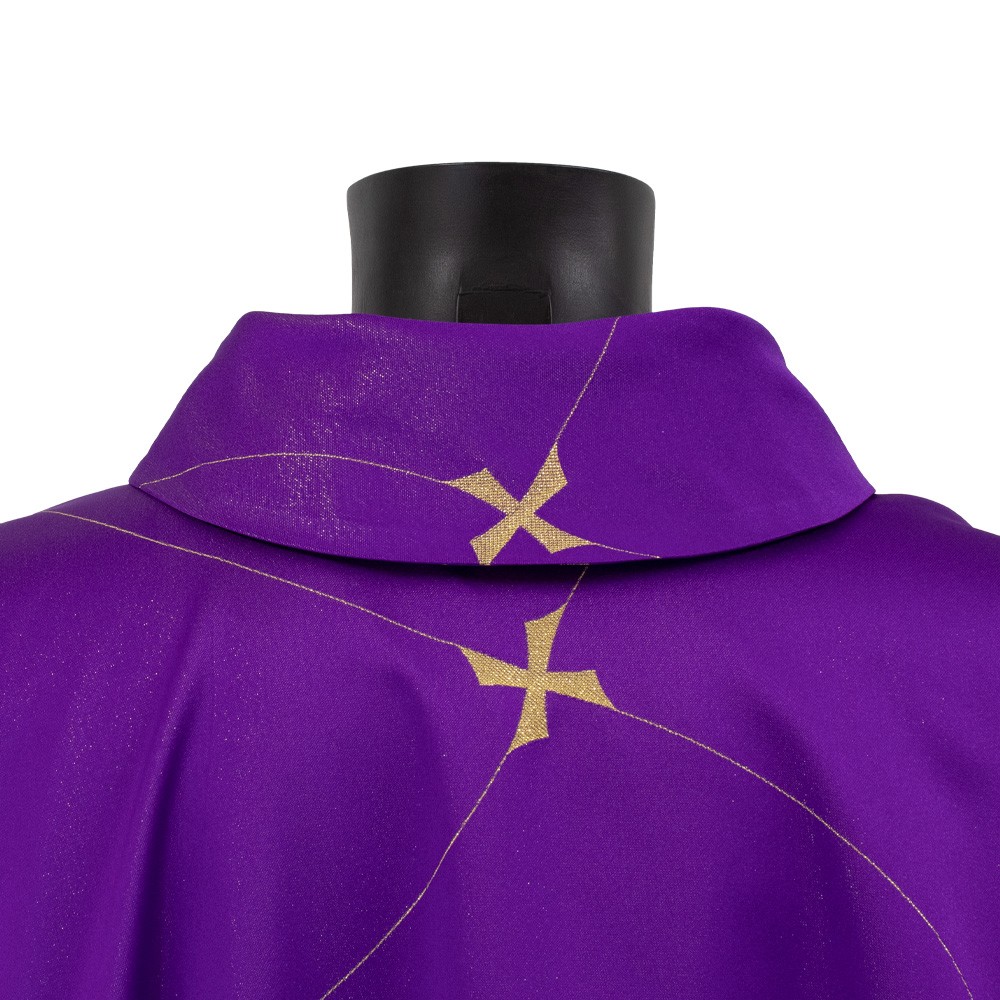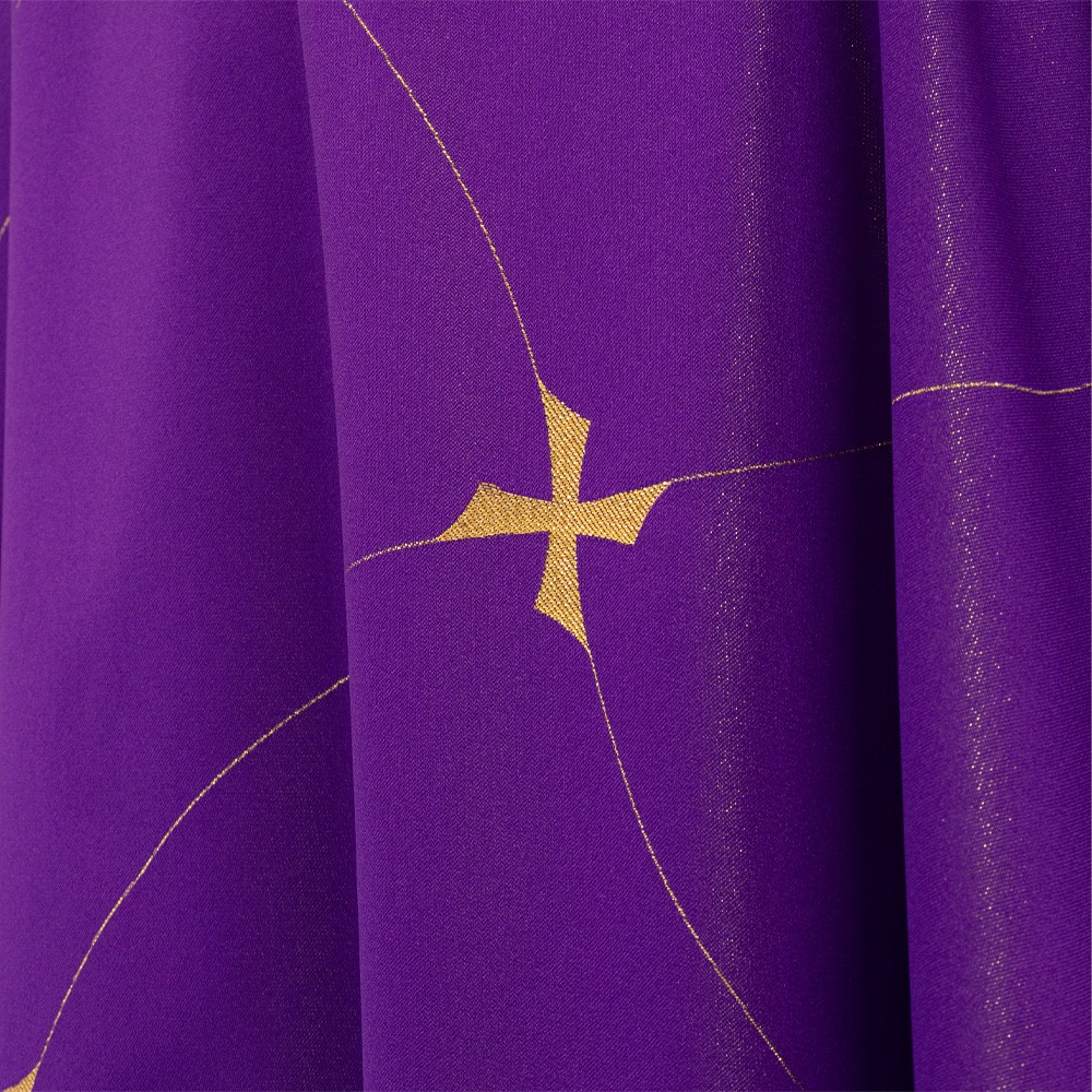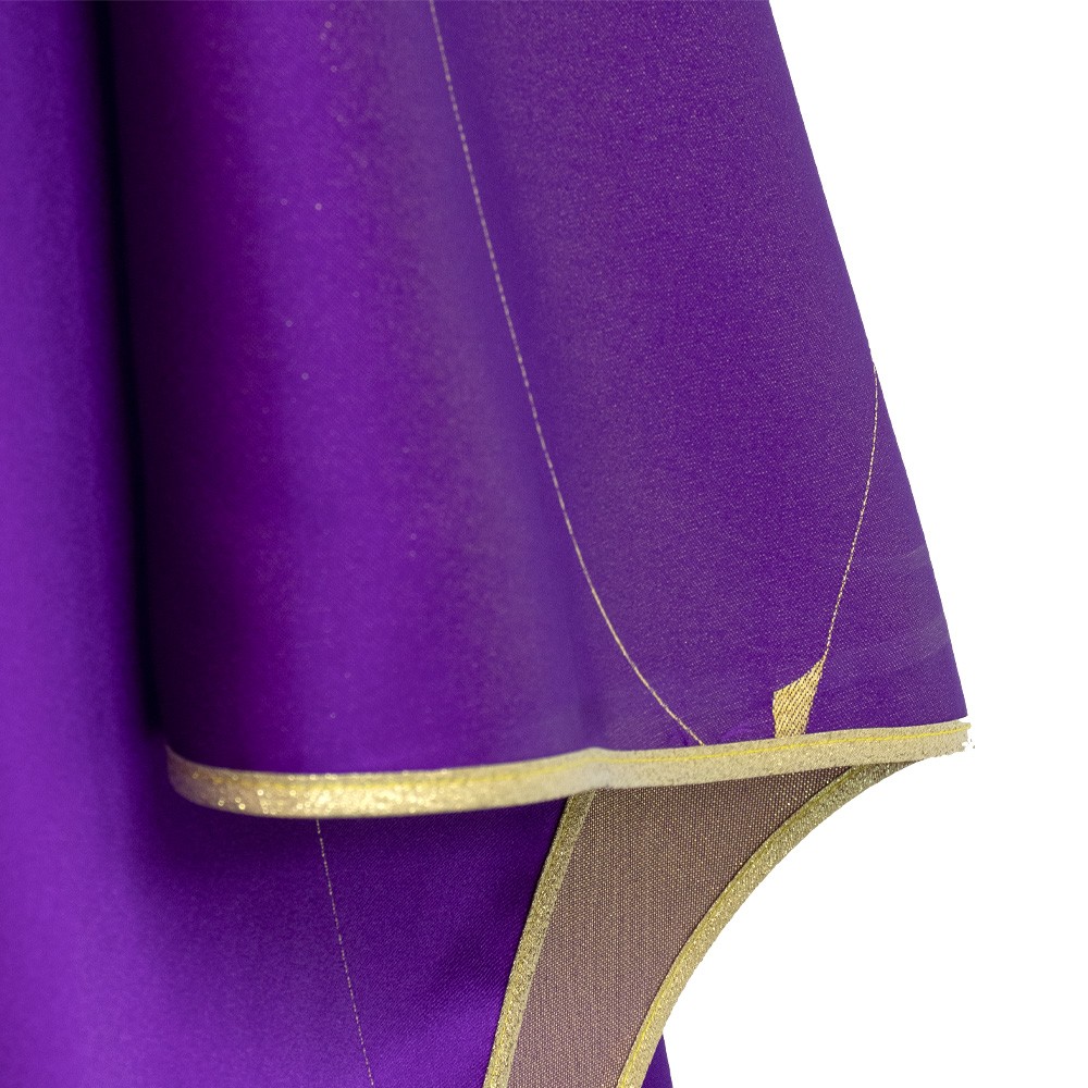Priest chasuble of purple color with golden embroidery; made of light polyester fabric.