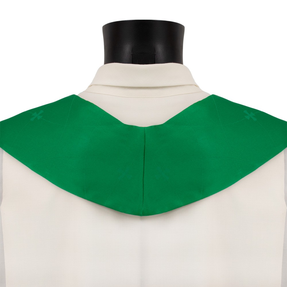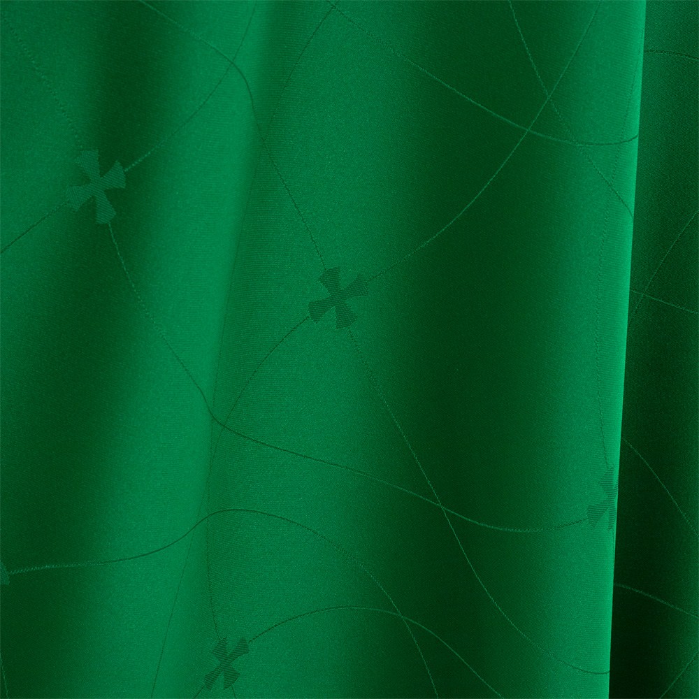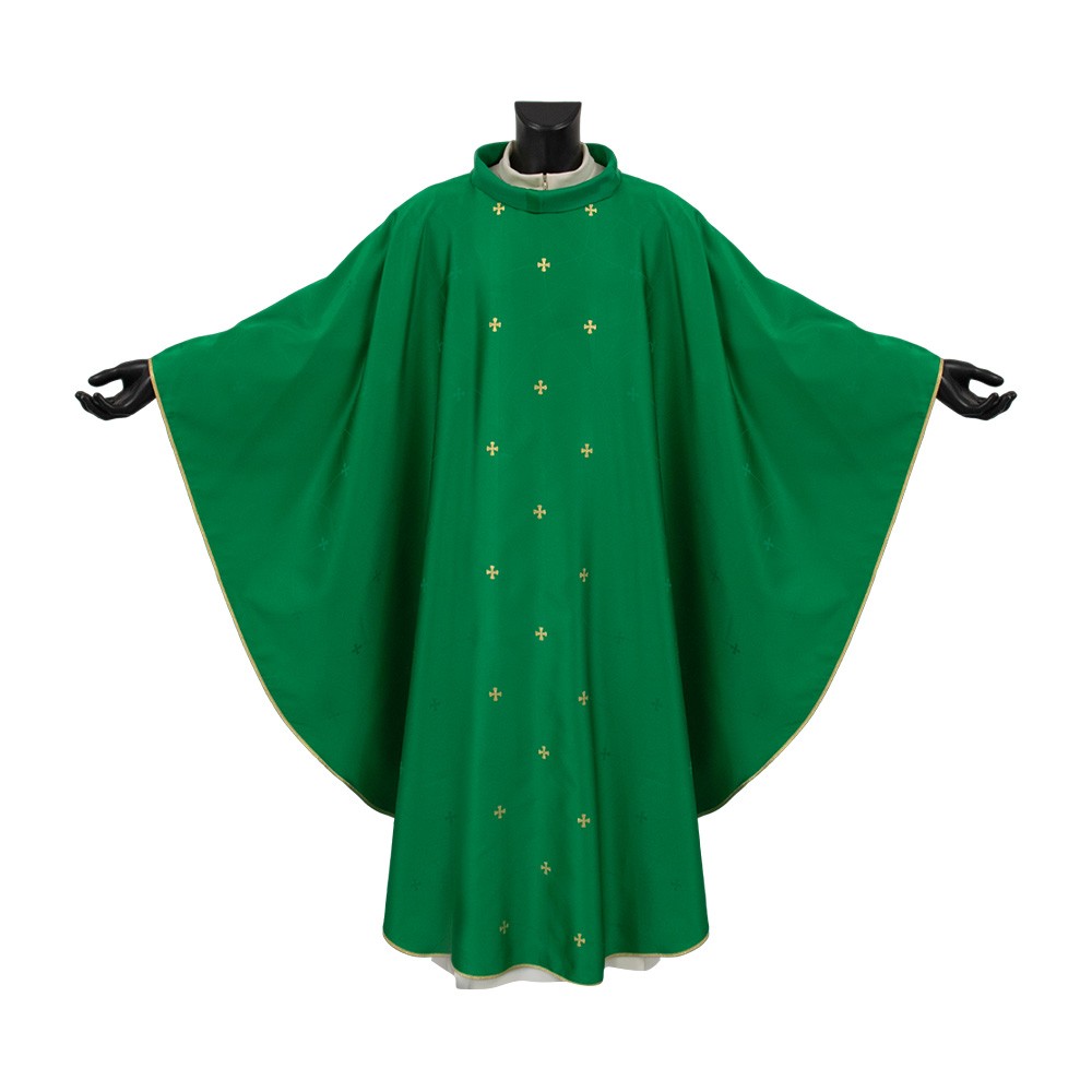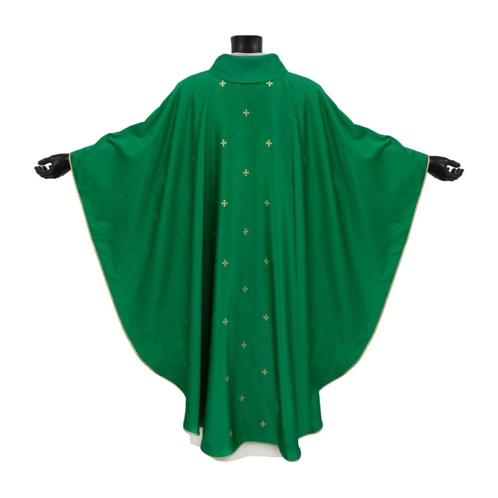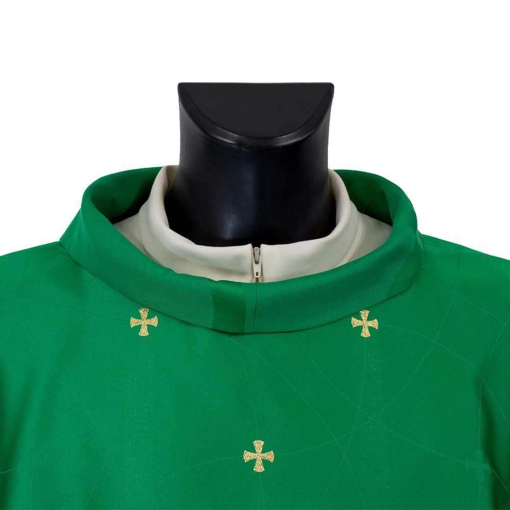 Green chasuble made of lightweight polyester with embroidery of golden cross.