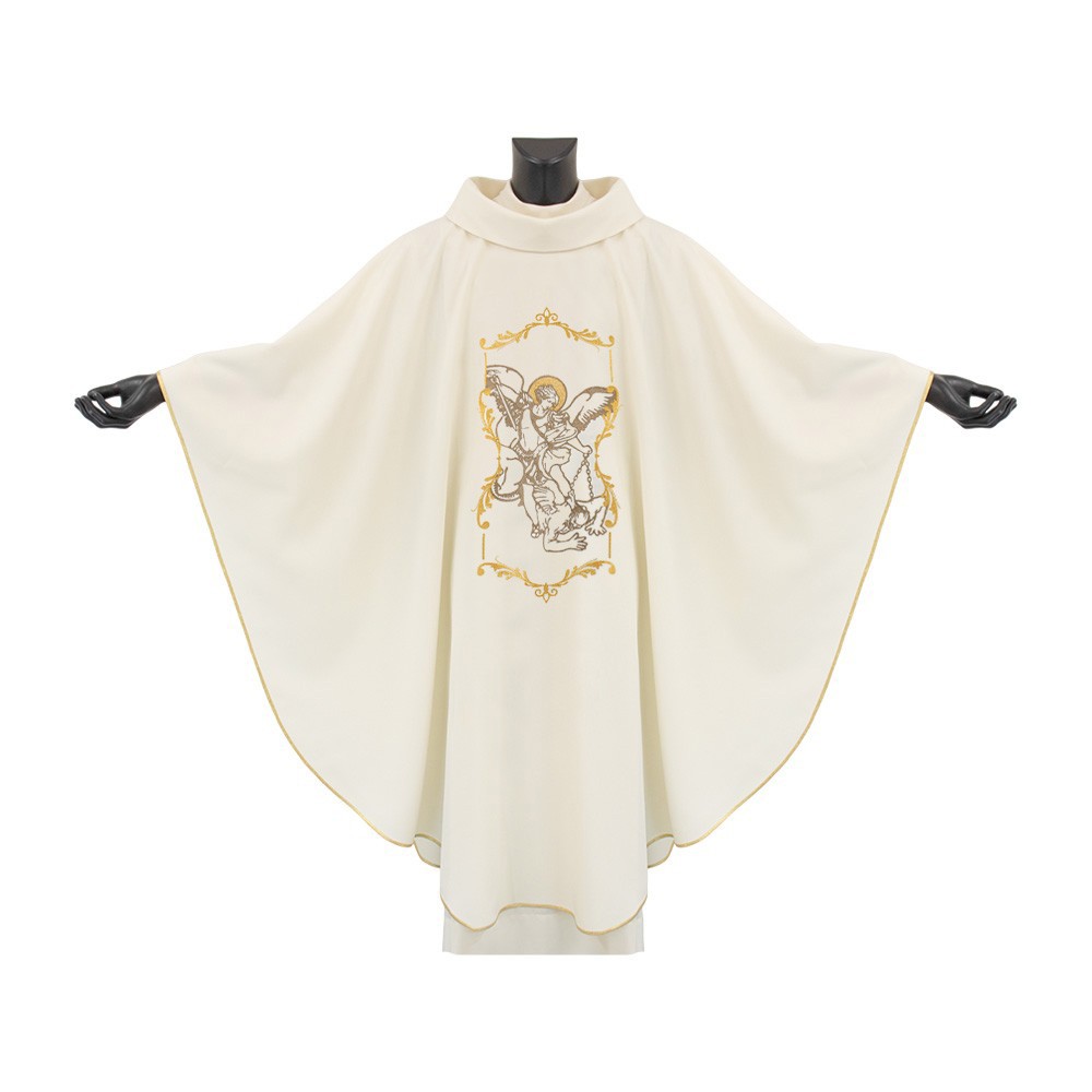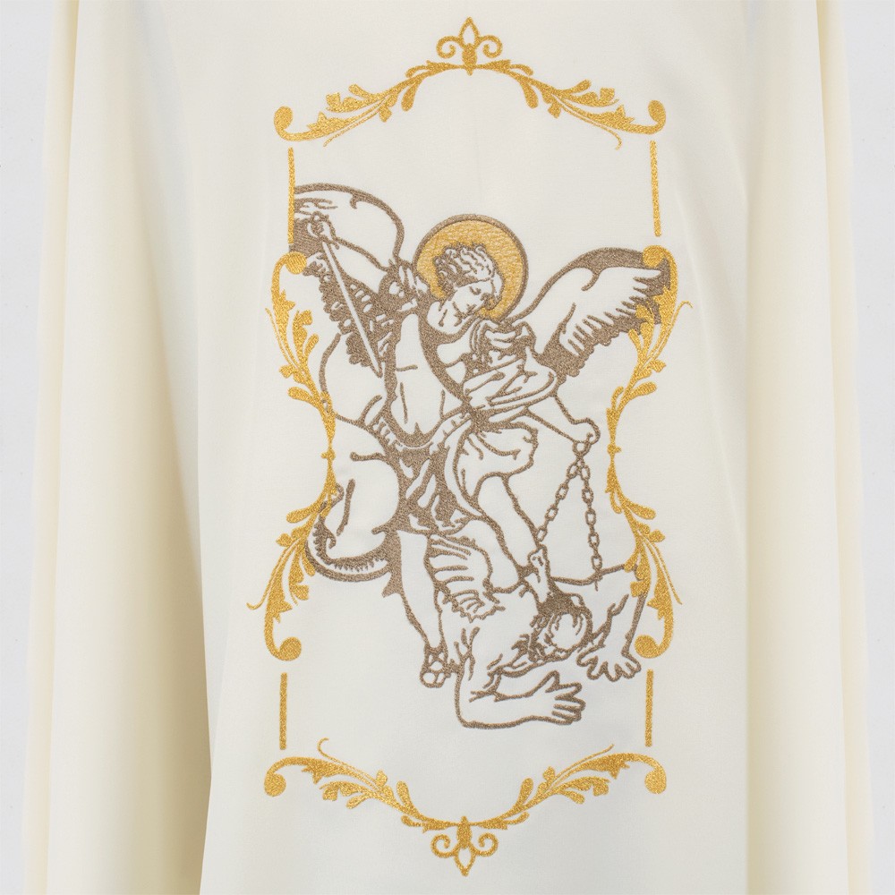 Ivory chasuble with embroidered image of Saint Michael The Archangel surrounded by a lovely frame of golden color.