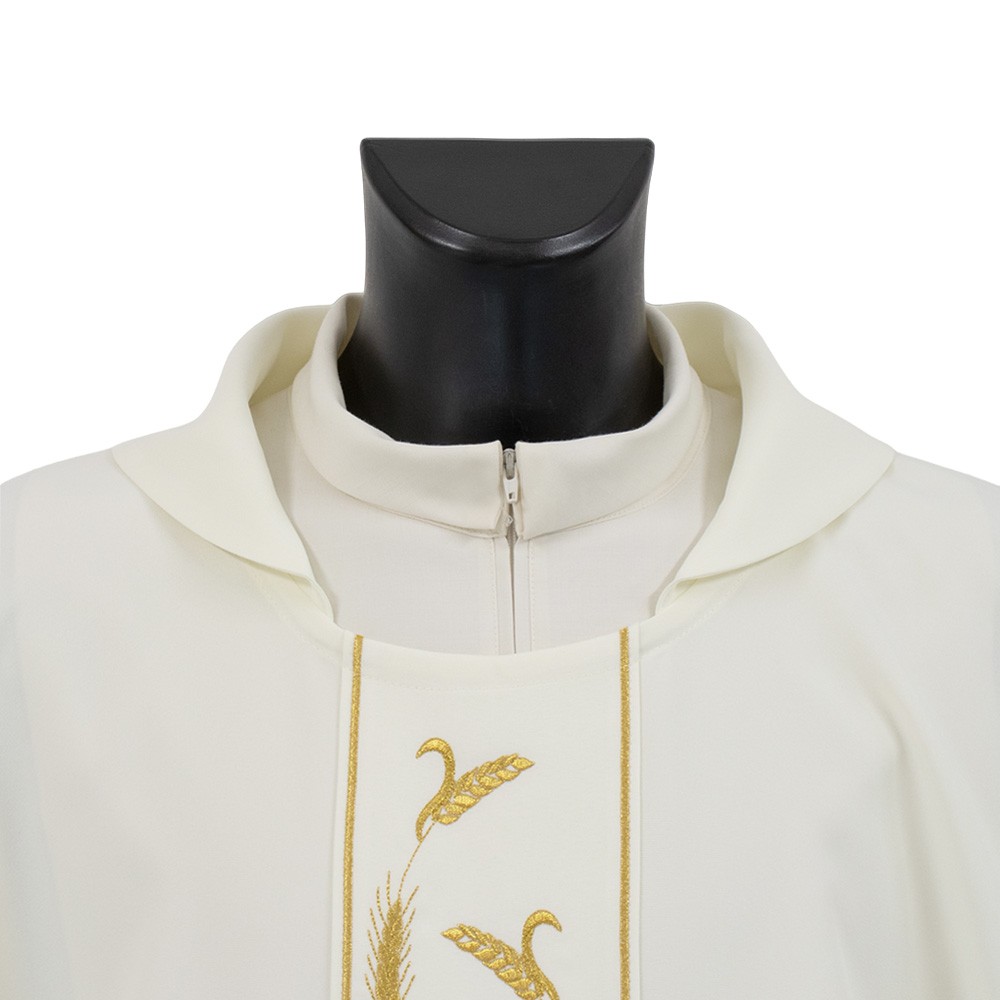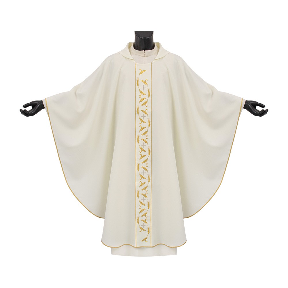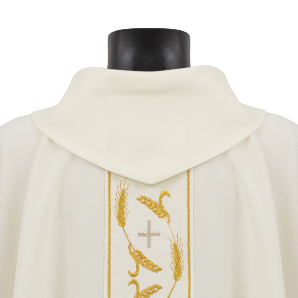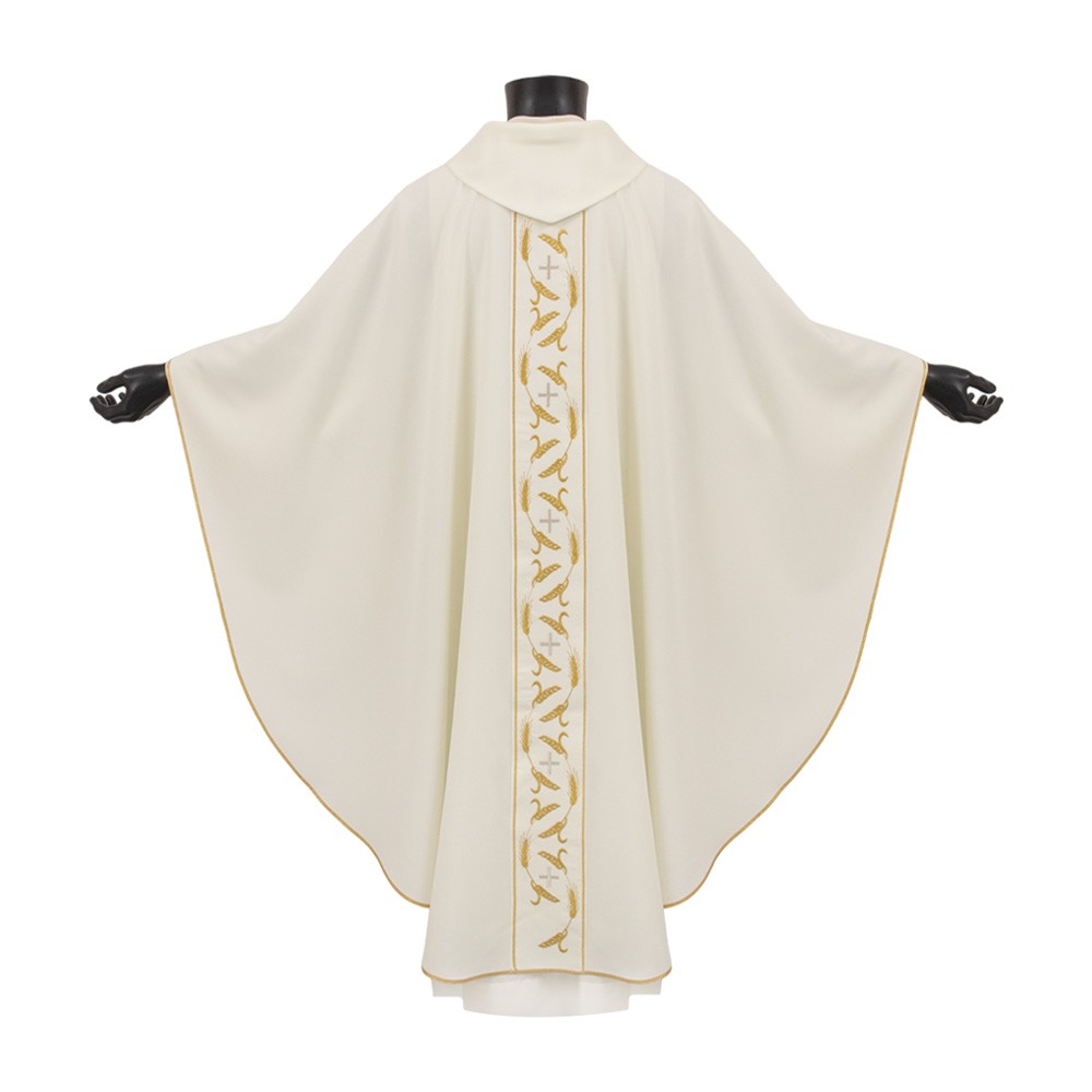 Chasuble in lightweight polyester fabric with orphrey finely embroidered by machine.