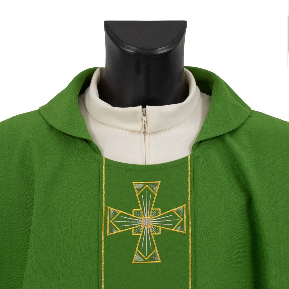 Priest chasuble in polyester fabric with embroidered orphrey.