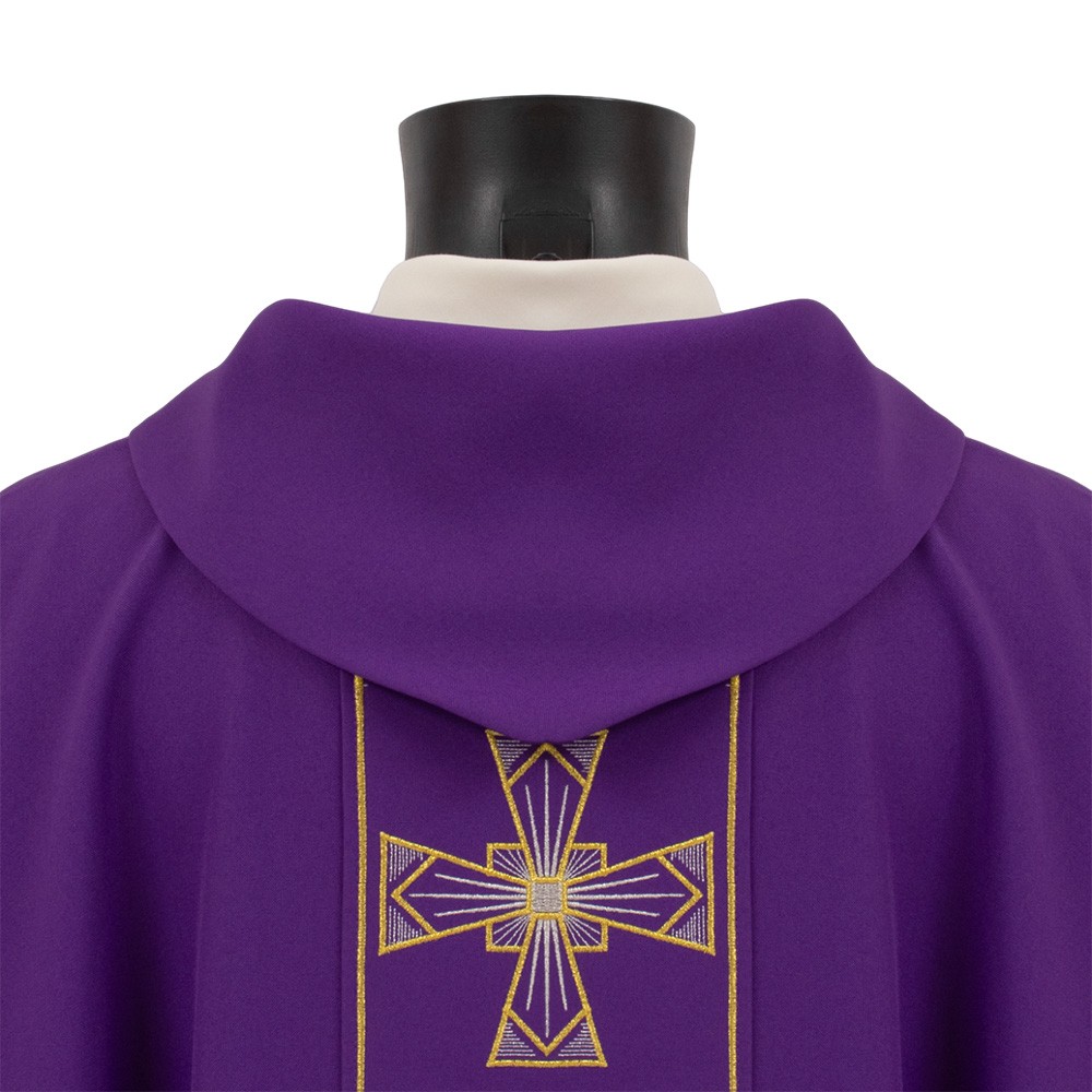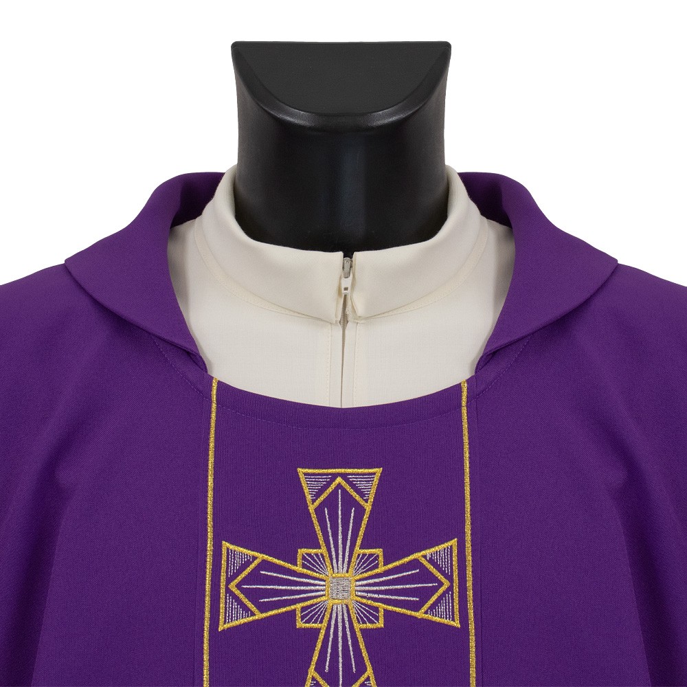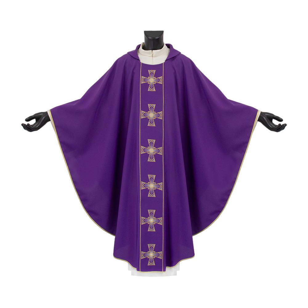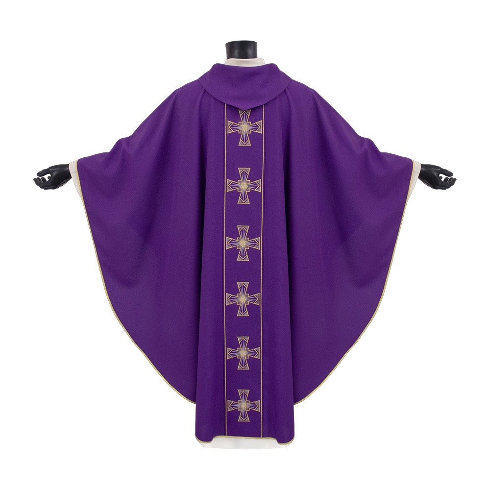 Purple priest chasuble with decorated orphrey, enriched with golden bias binding along the edges.