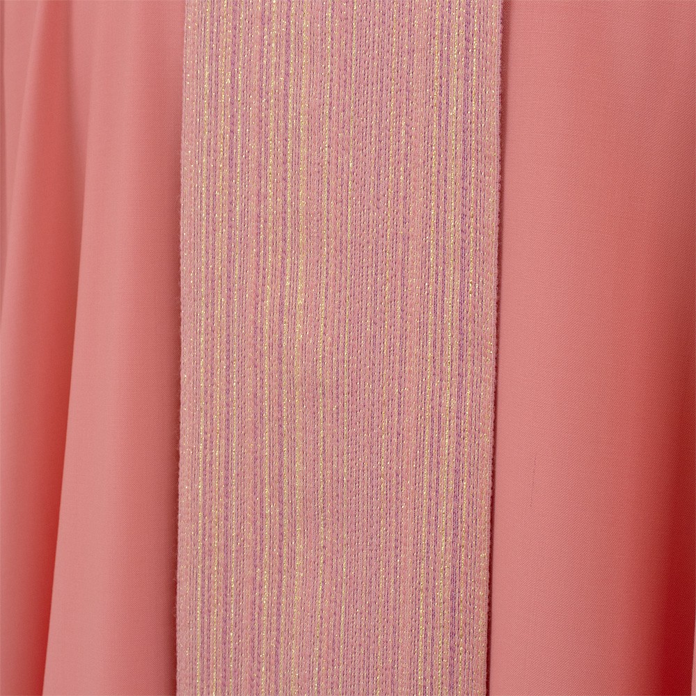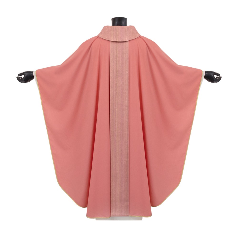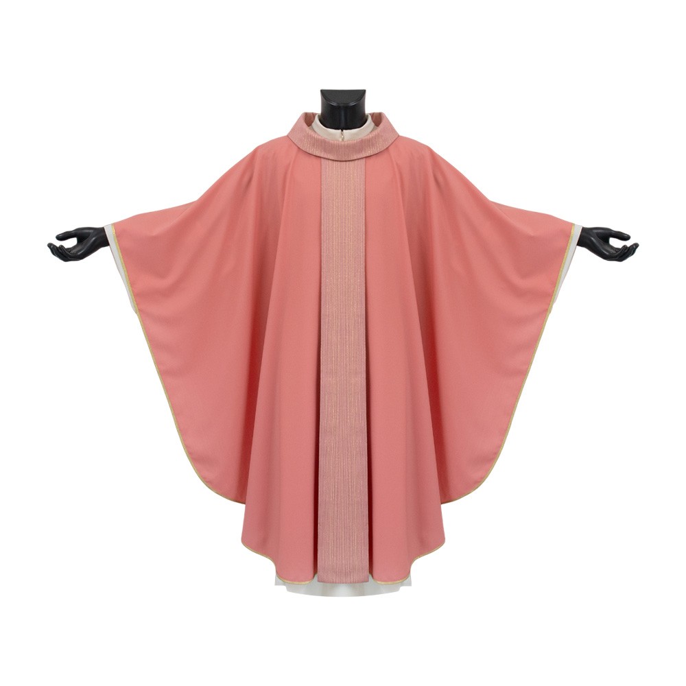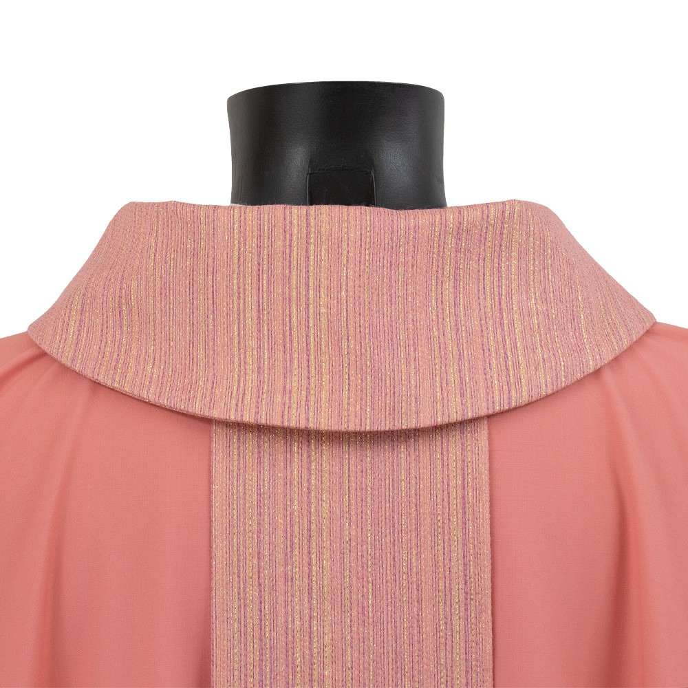 Pink priest's chasuble with a ring collar and striped fabric stole.