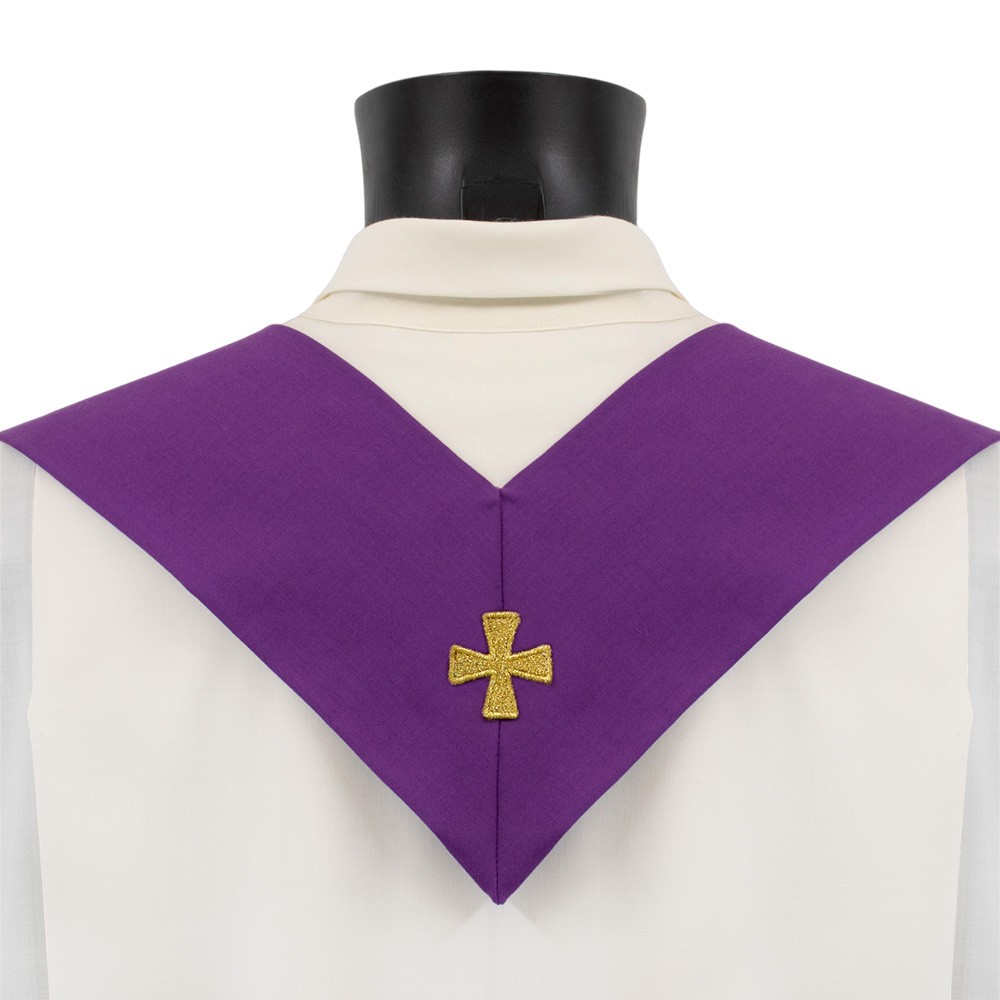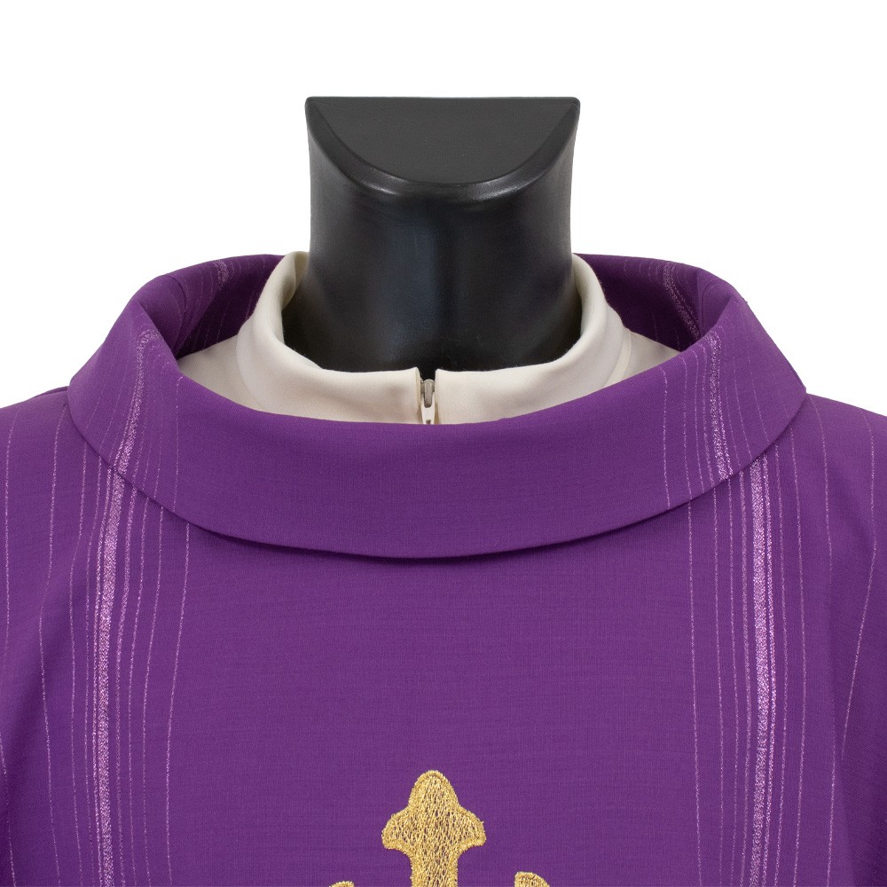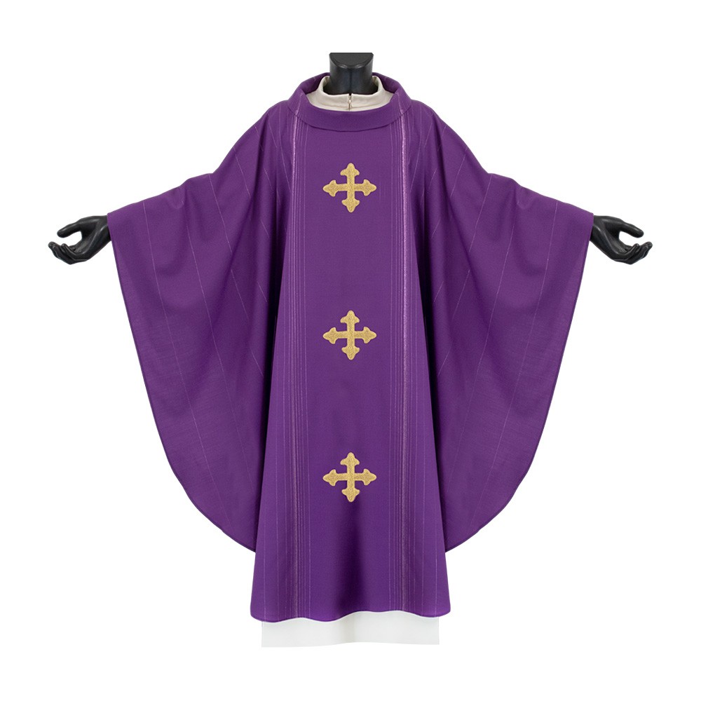 Chasuble made of blended fabric with gold embroidered crosses. Model with roll collar and matching stole included.