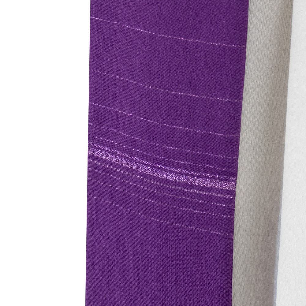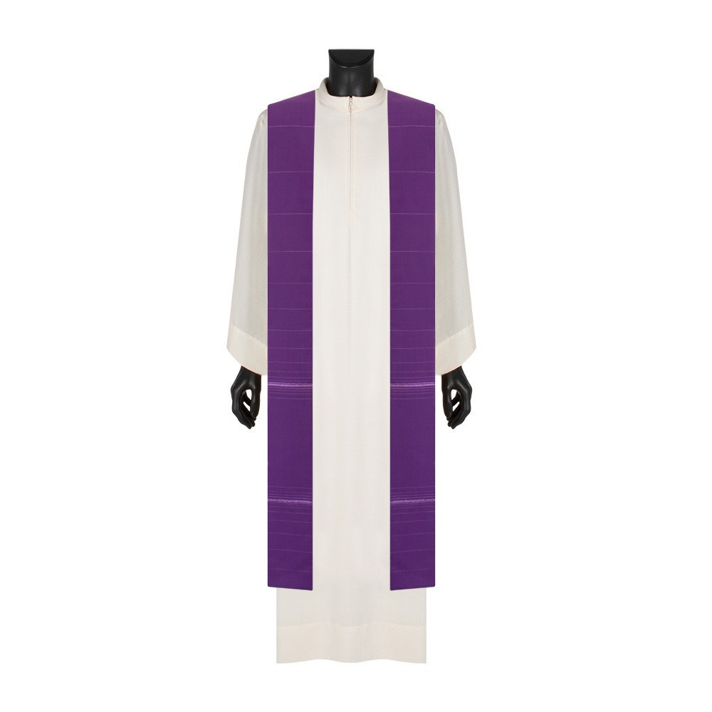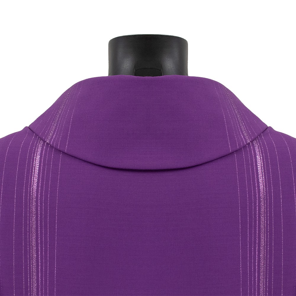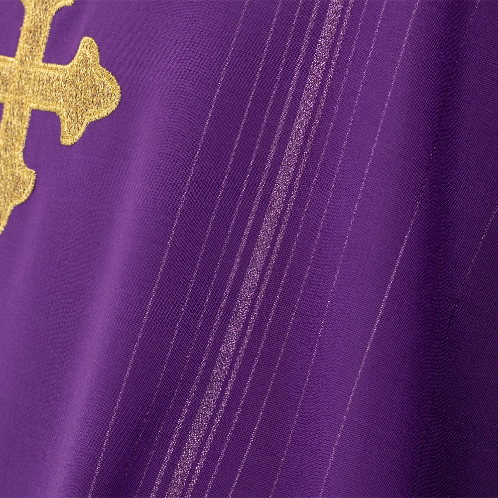 Purple priest's chasuble in elegant striped wool blend fabric with decorative crosses.