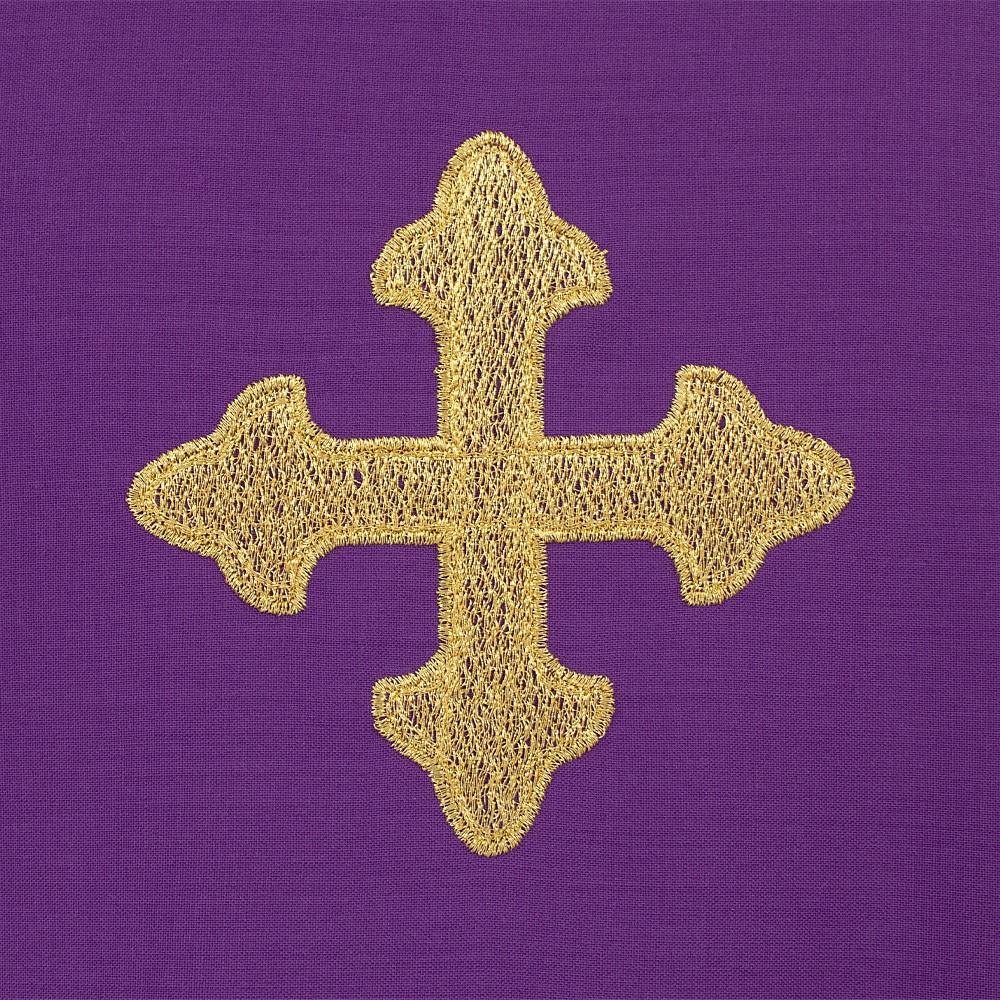 The entire vestment is finished with a purple perimeter bias trim.