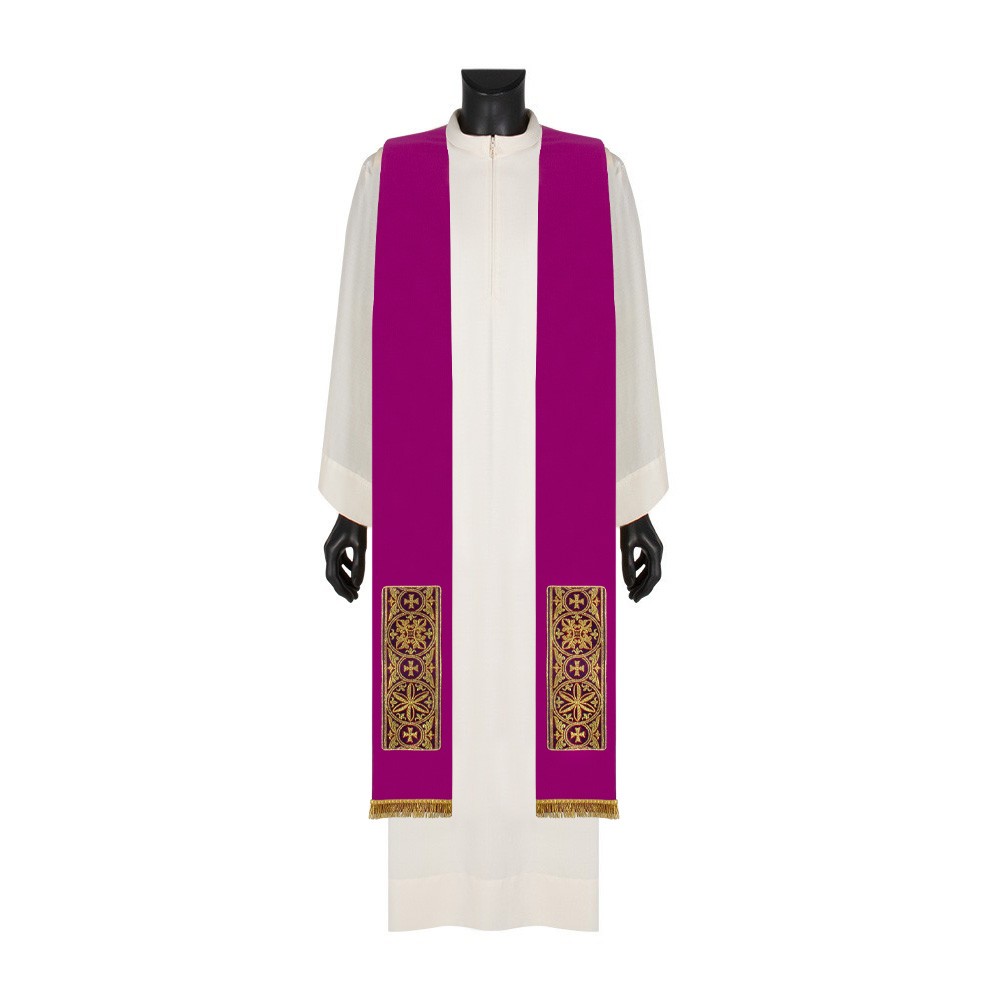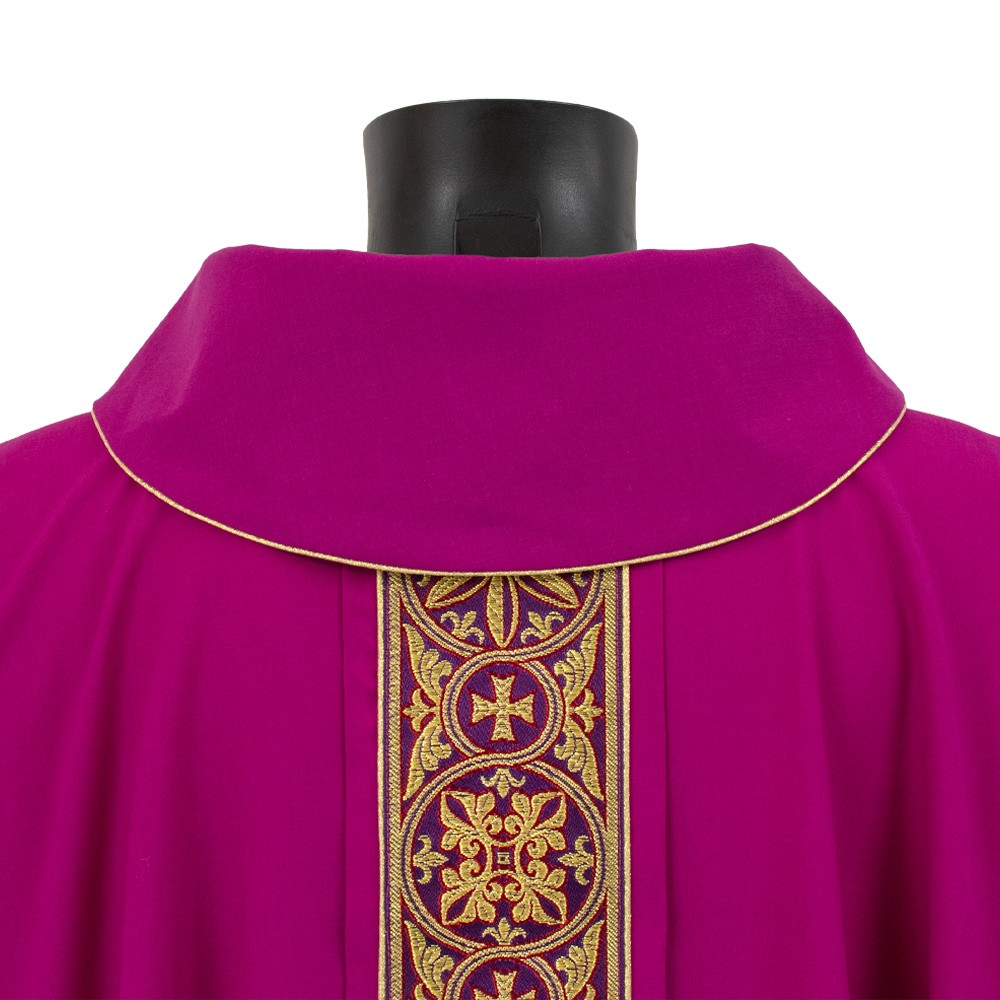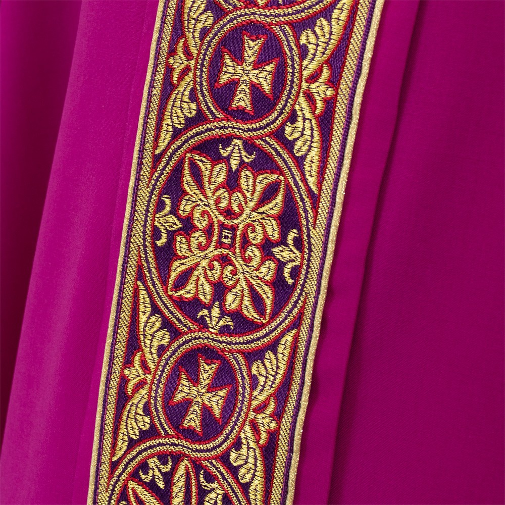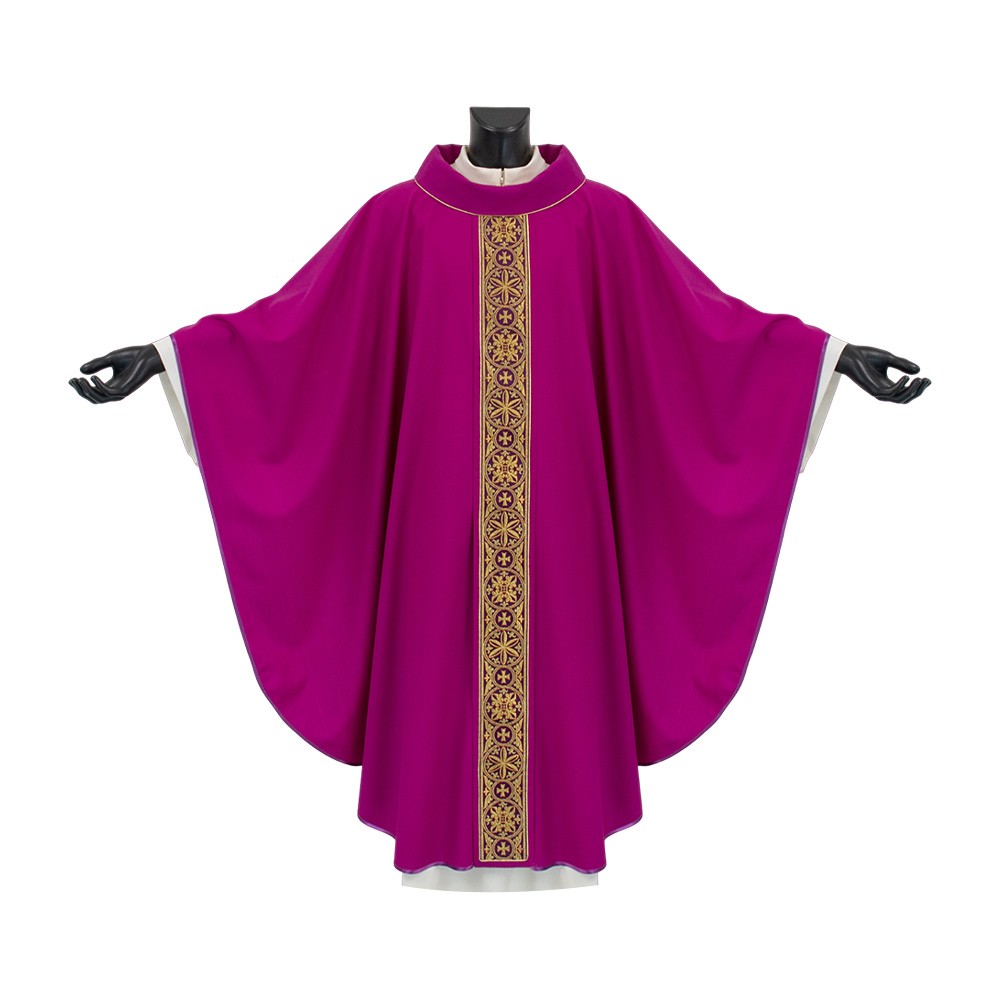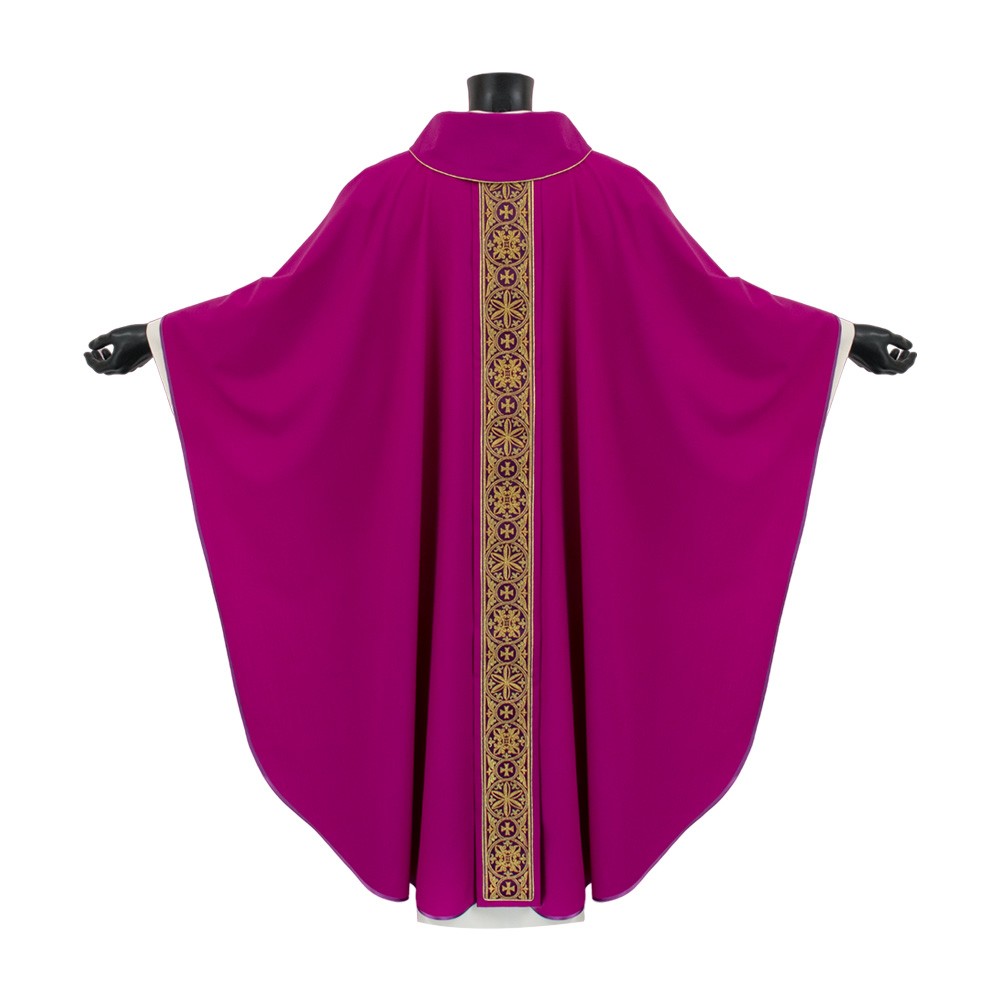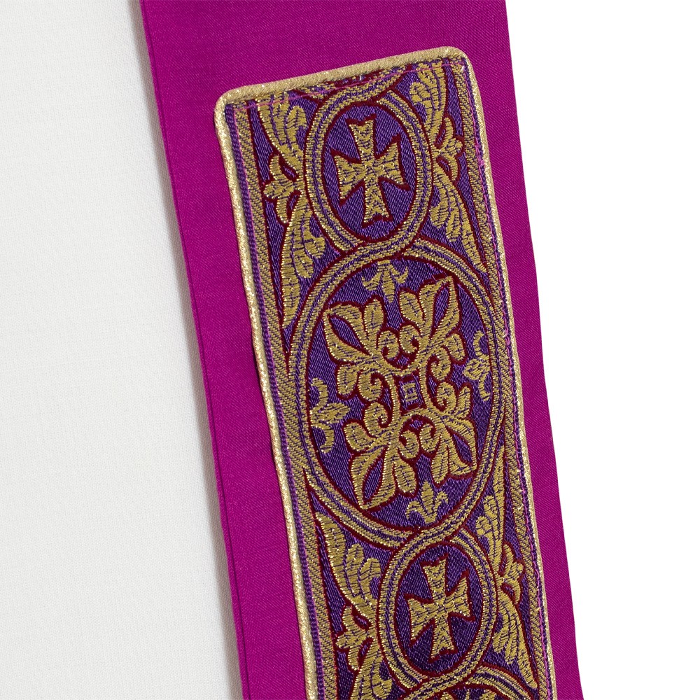 The vestment is fully finished with a violet perimeter bias and comes with a matching stole, embellished with a golden fringe.