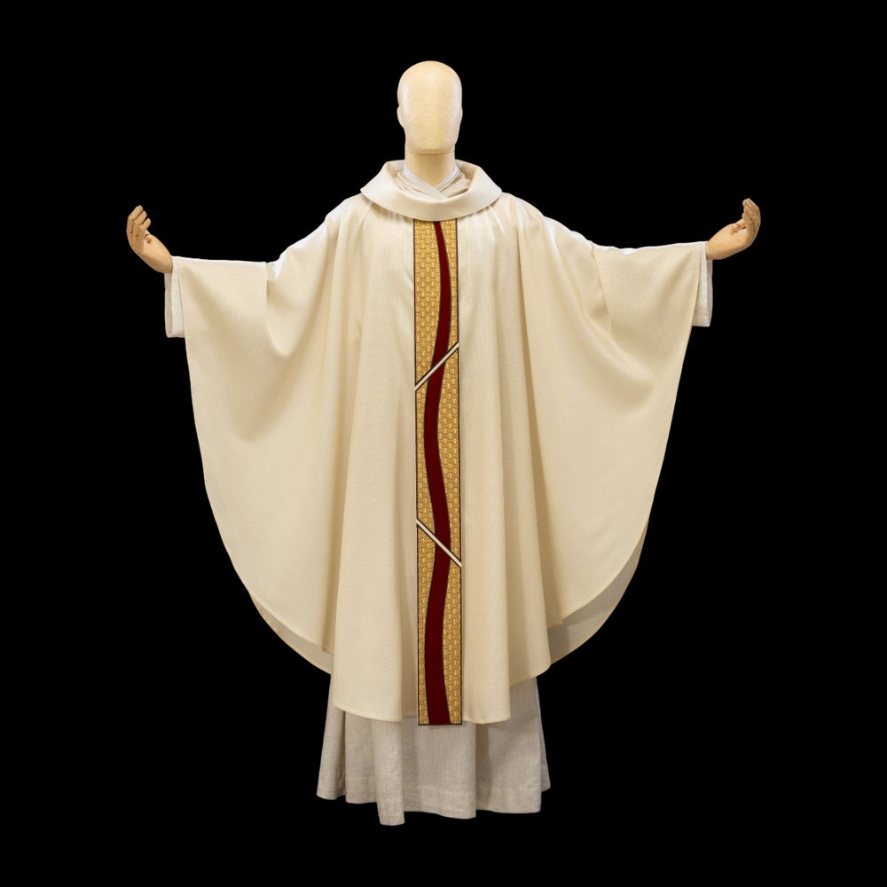 Ivory liturgical chasuble with a round collar made of 95% wool.