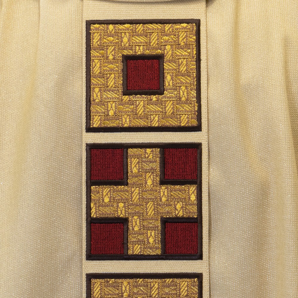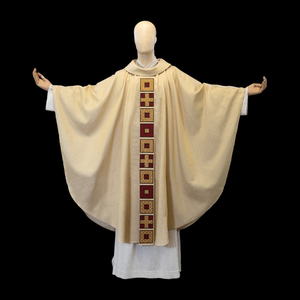 The chasuble is made from a cotton and viscose blend, while the orphrey is finely handcrafted with red velvet inlay, decorated with crosses and squares.