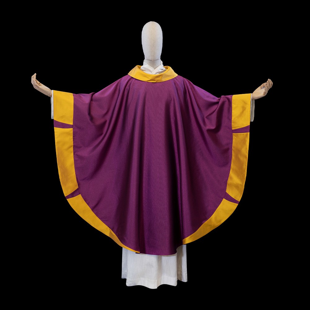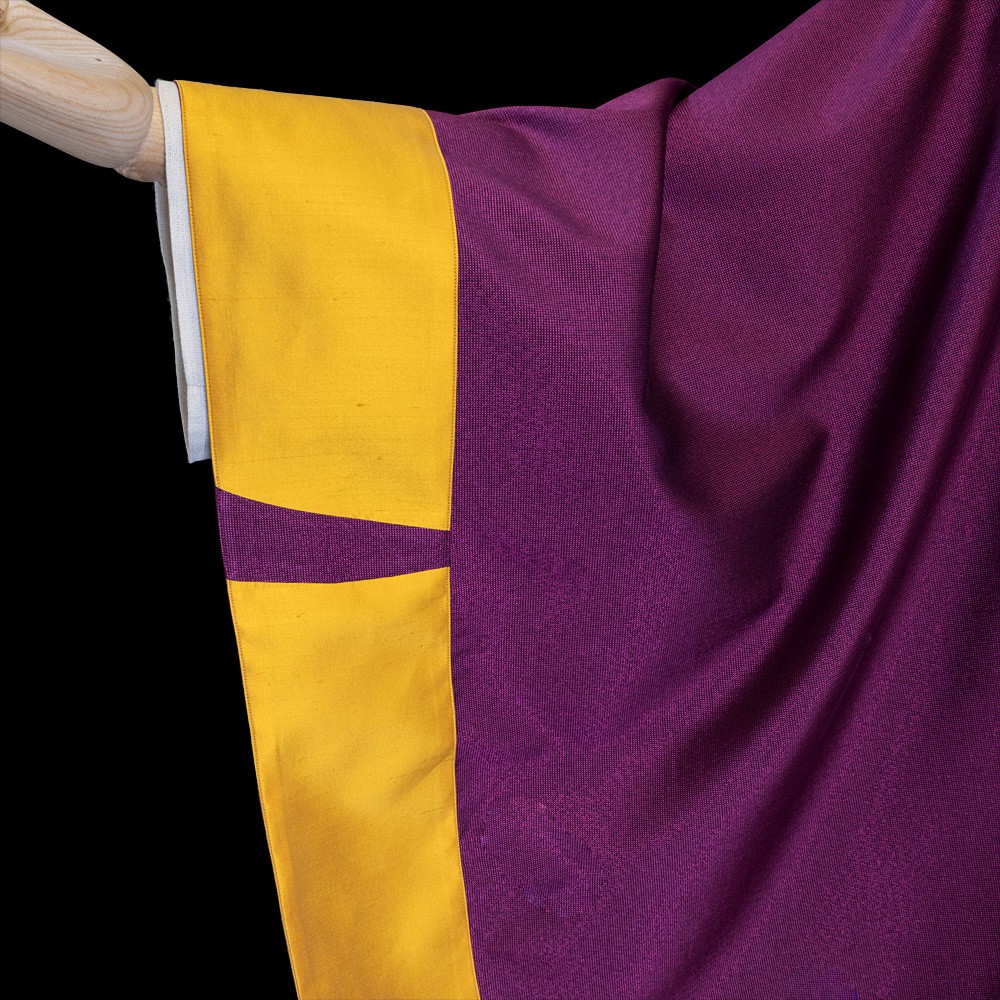 Elegant purple and gold priest chasuble, crafted in cotton and viscose blend. Modern design enriched with golden evening shantung bands, adding brightness and refinement to the liturgical vestment.