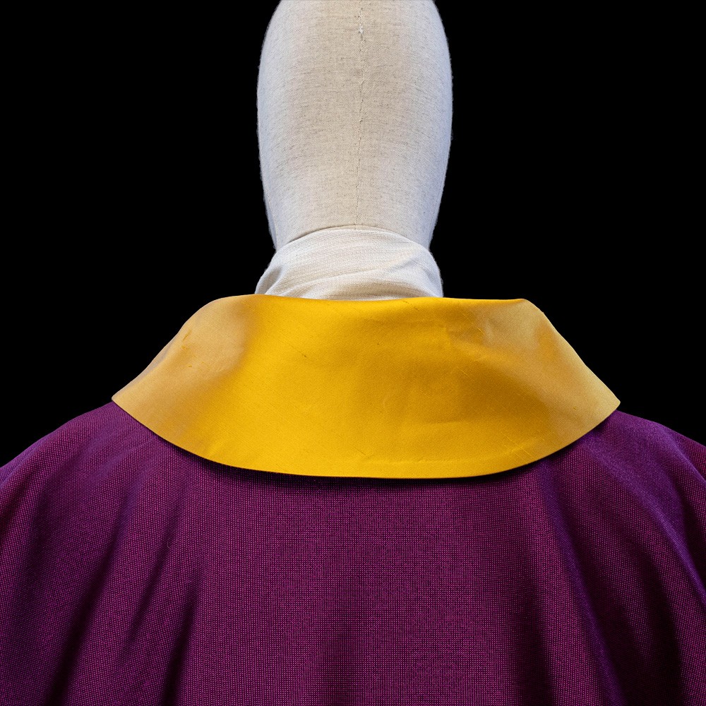 Purple priest chasuble from Atelier Sirio, made of cotton blend fabric with side bands in golden shantung.