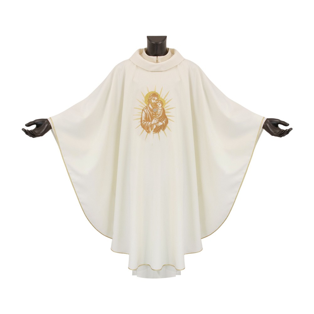 This chasuble is adorned with refined machine embroidery in gold and blue threads, depicting St. Joseph with delicate and harmonious details. A simple cross is embroidered on the back.