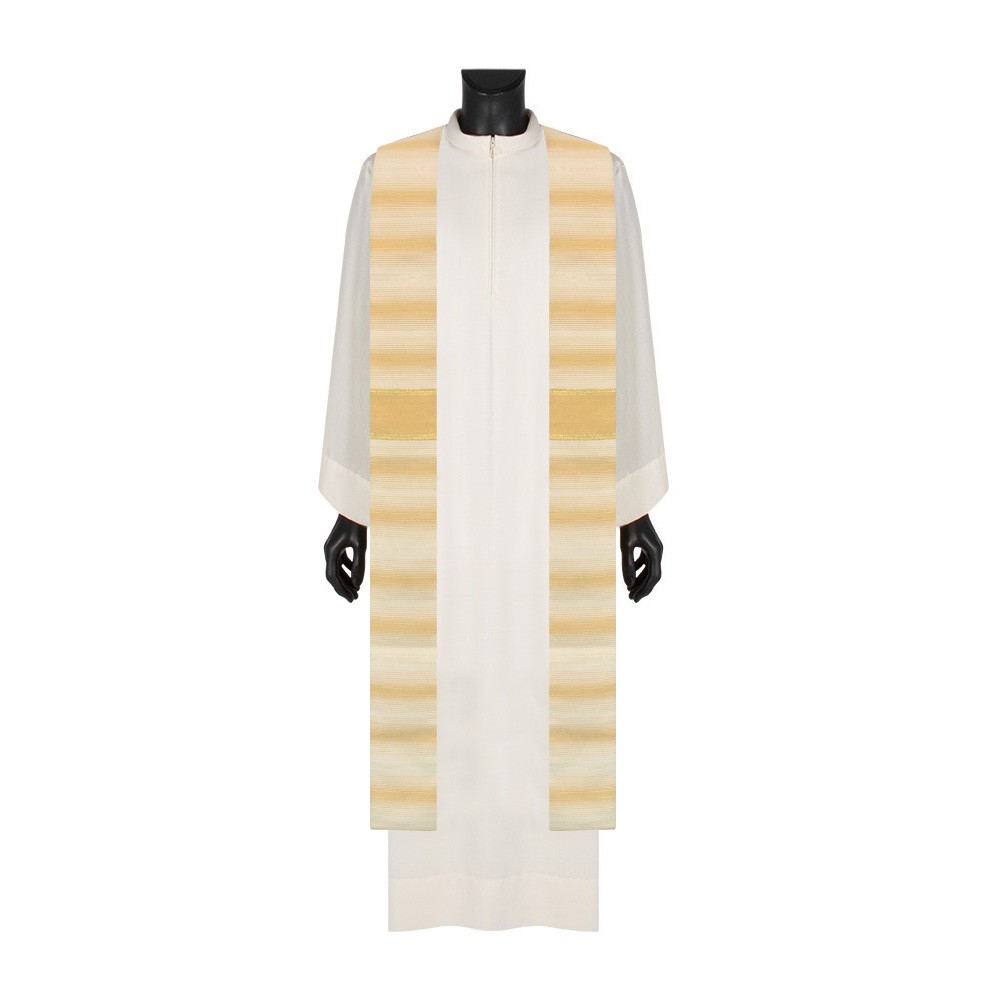 This priestly chasuble is made from a blended fabric and features gold embroidered crosses. Designed with a ring collar and includes a matching stole.