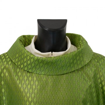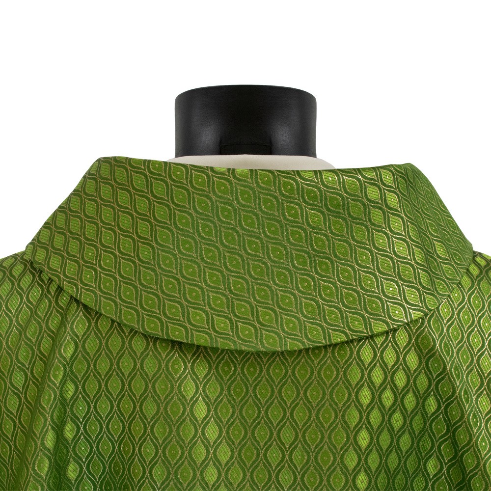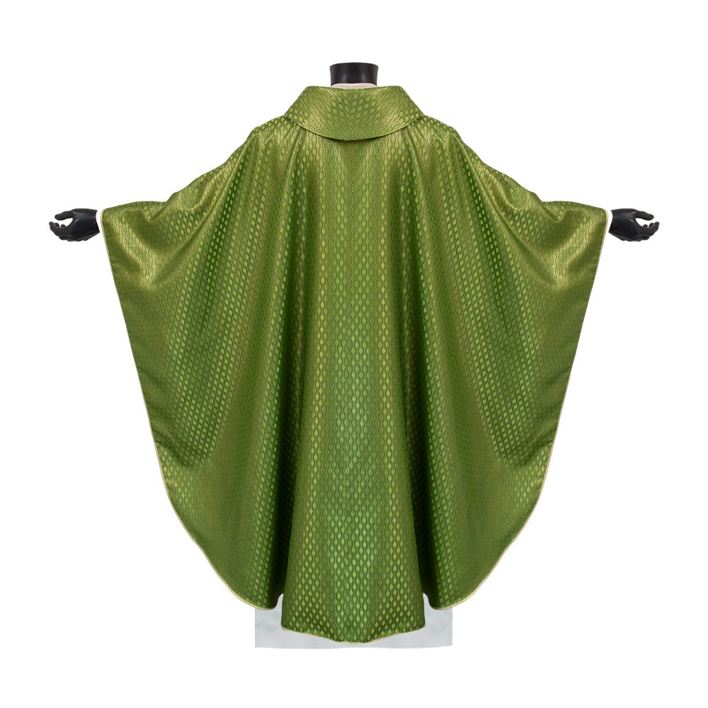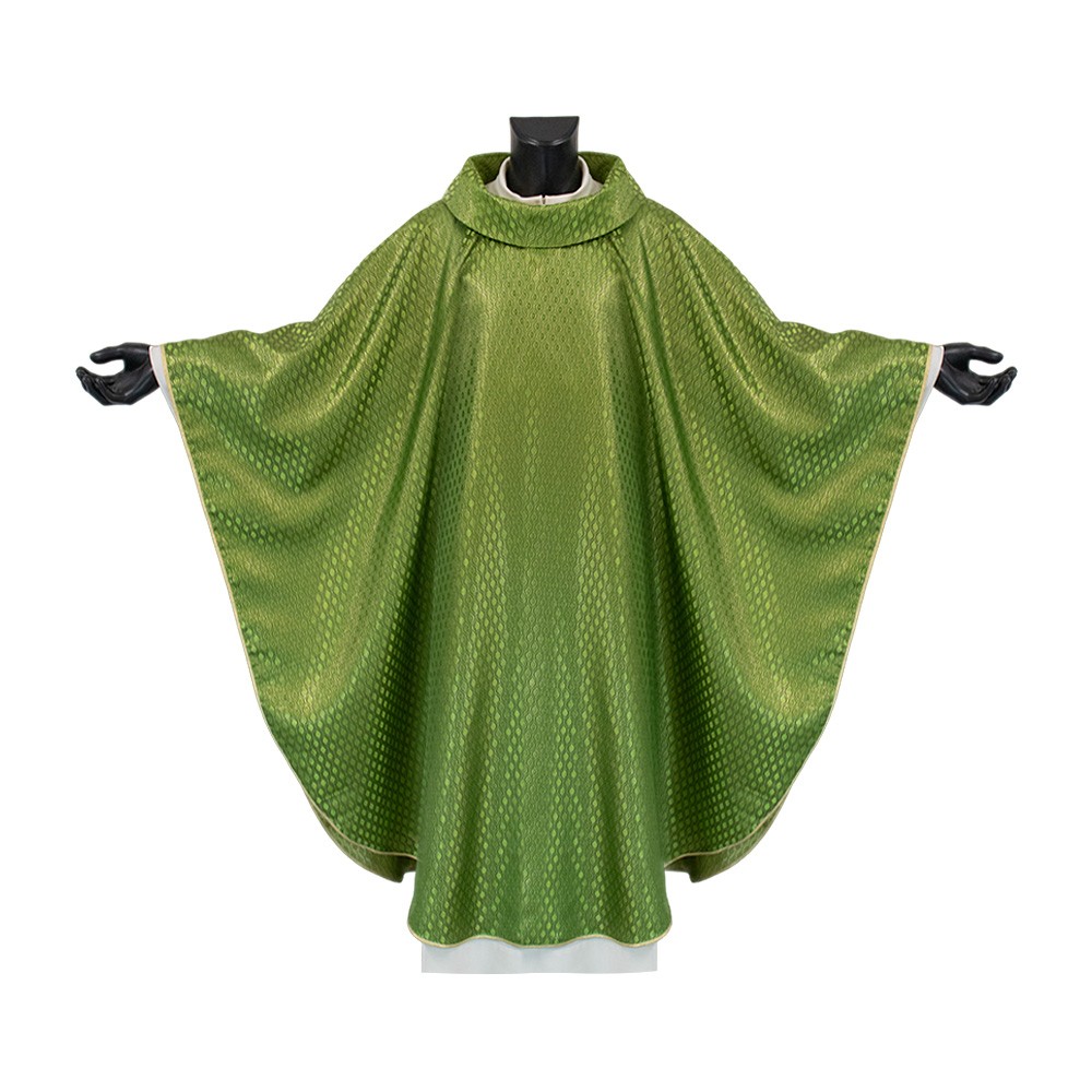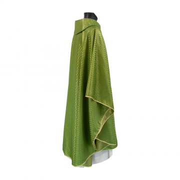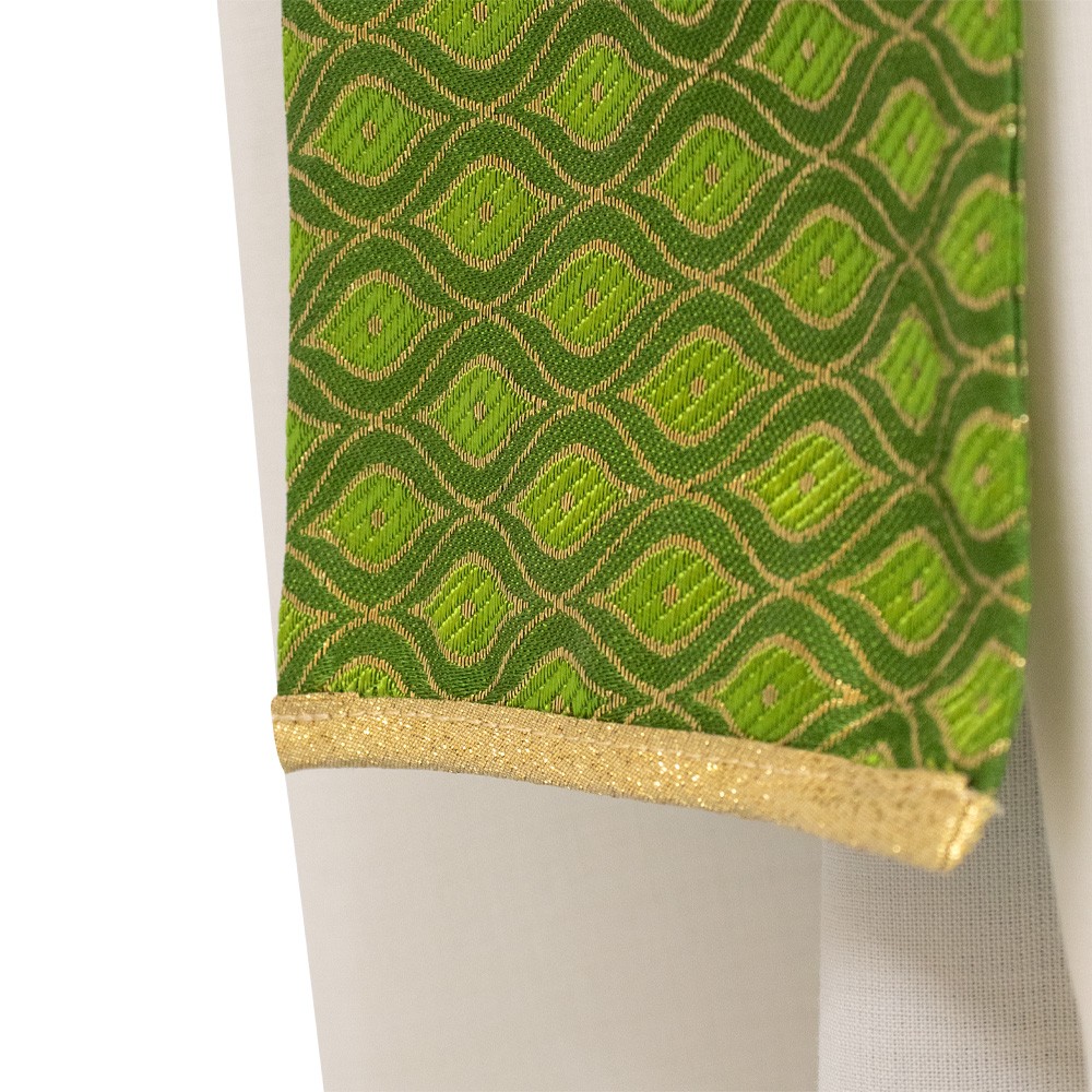 Beautiful priest chasubble in sophisticated silk fabric featuring golden embroideries. Lightweight and elegant chasuble with classic cut and cowl neck. It comes complete with garment cover and stole.