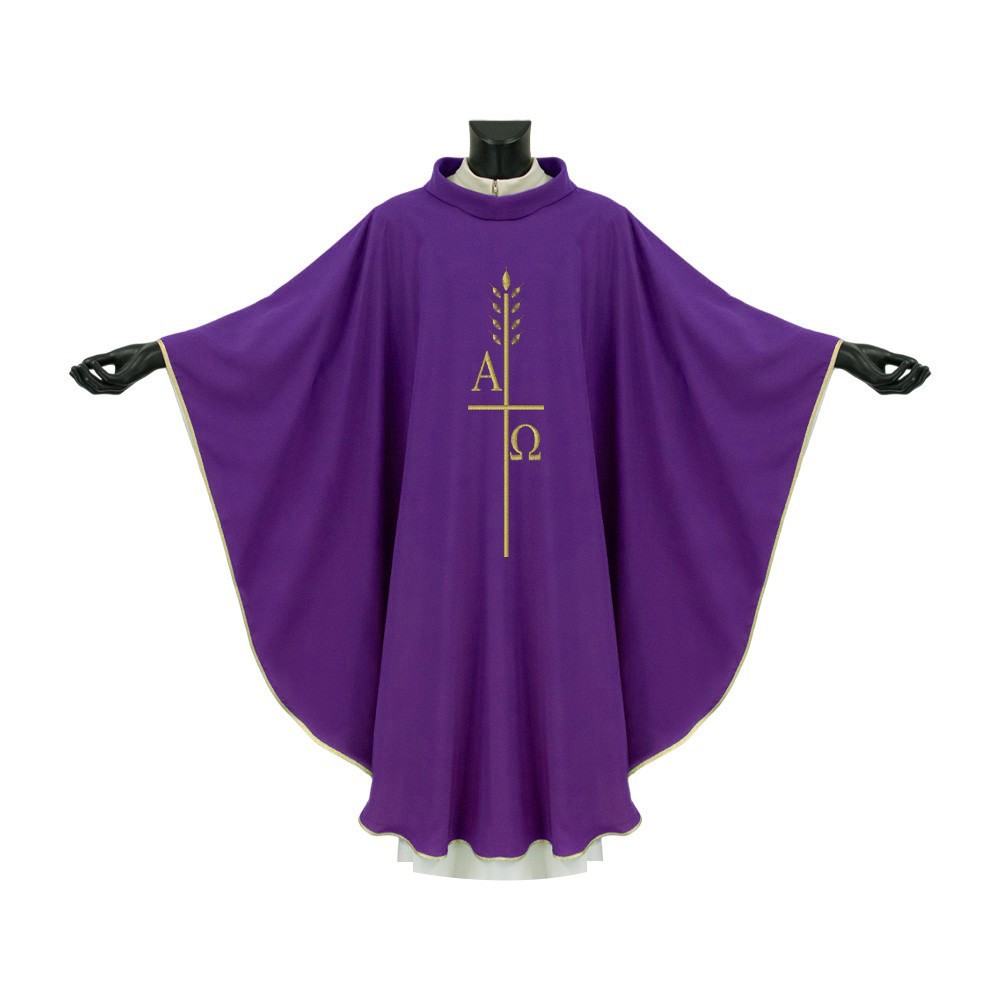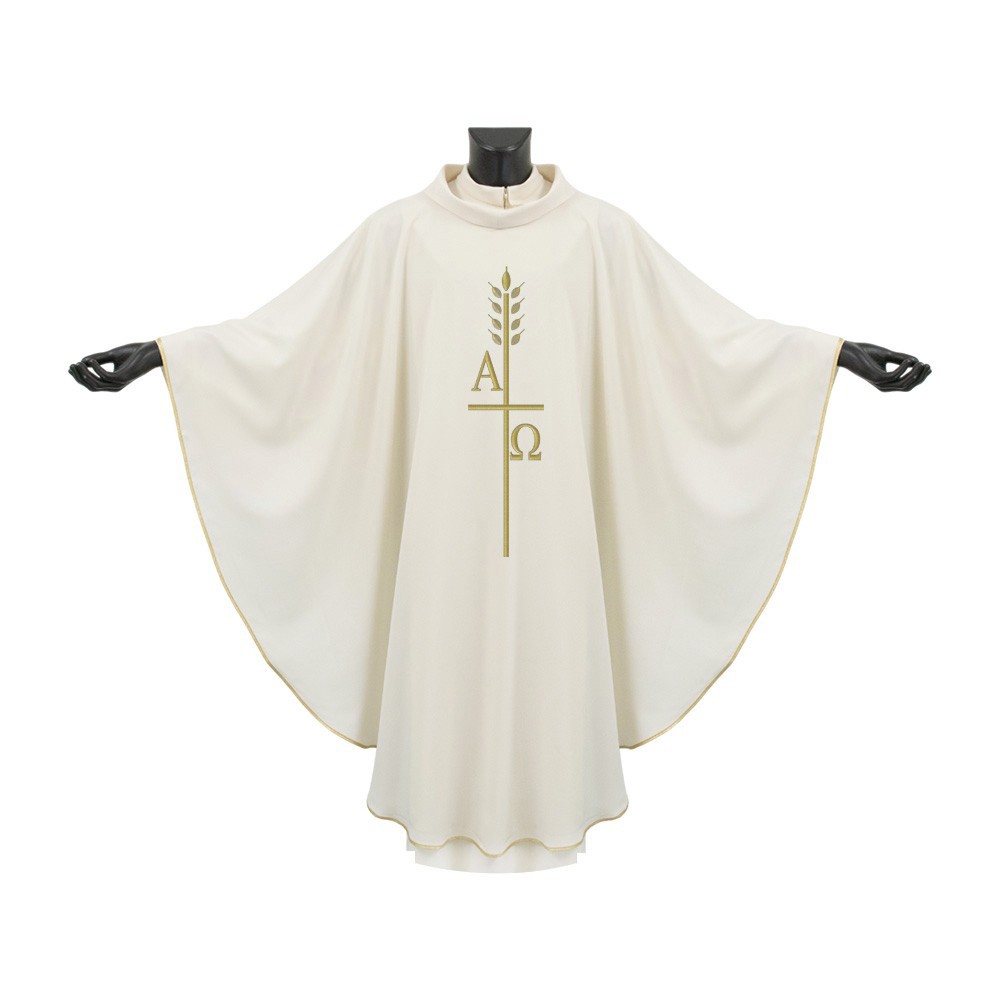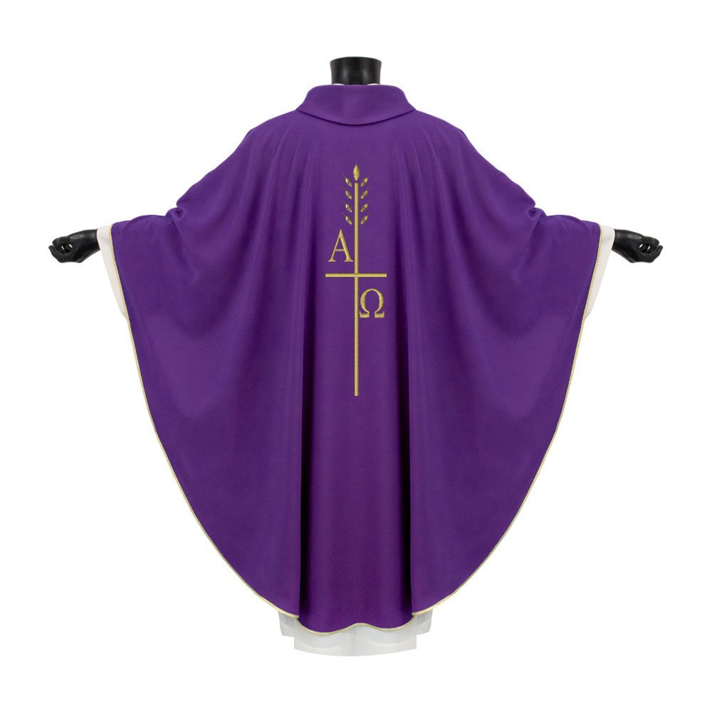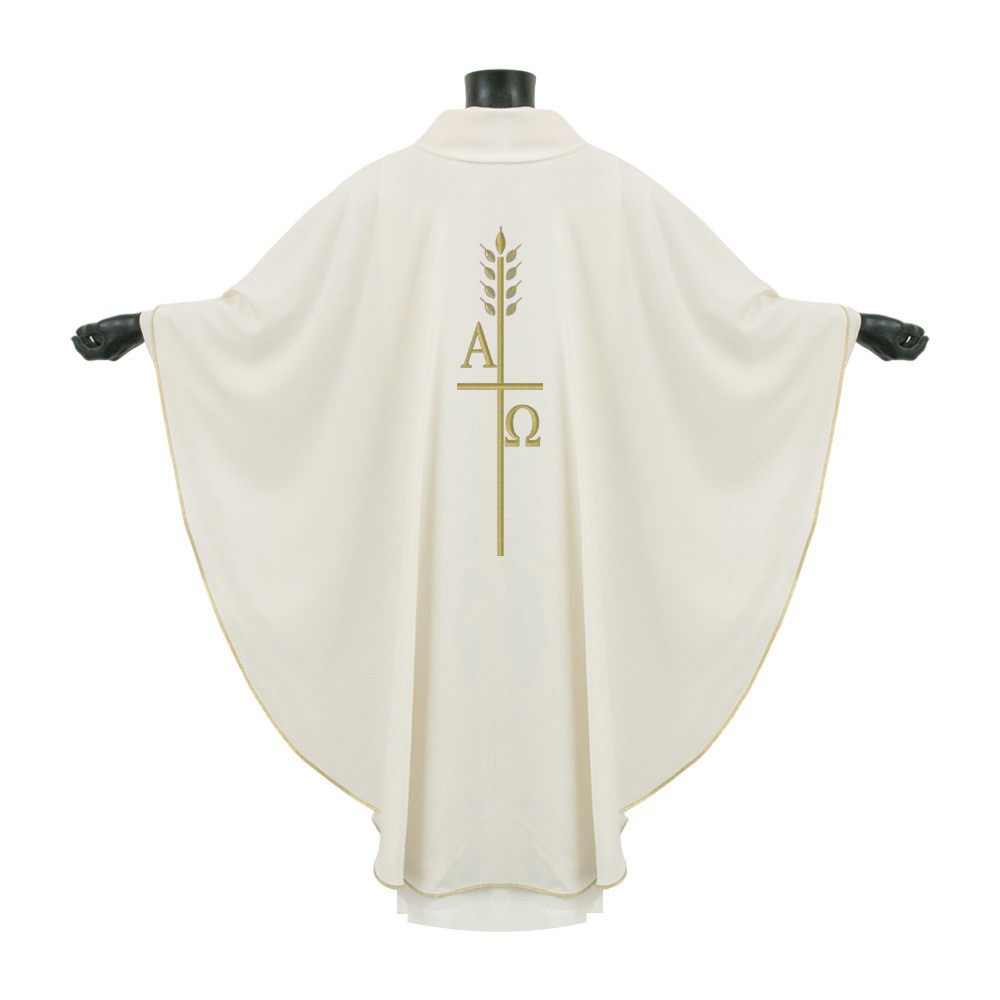 Chasuble for priest in 100% polyester fabric with embroidered "Cross, wheat, and Alpha and Omega symbols."