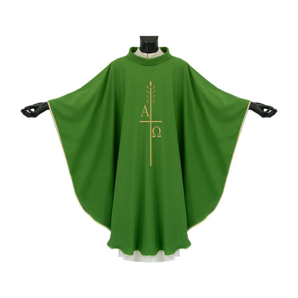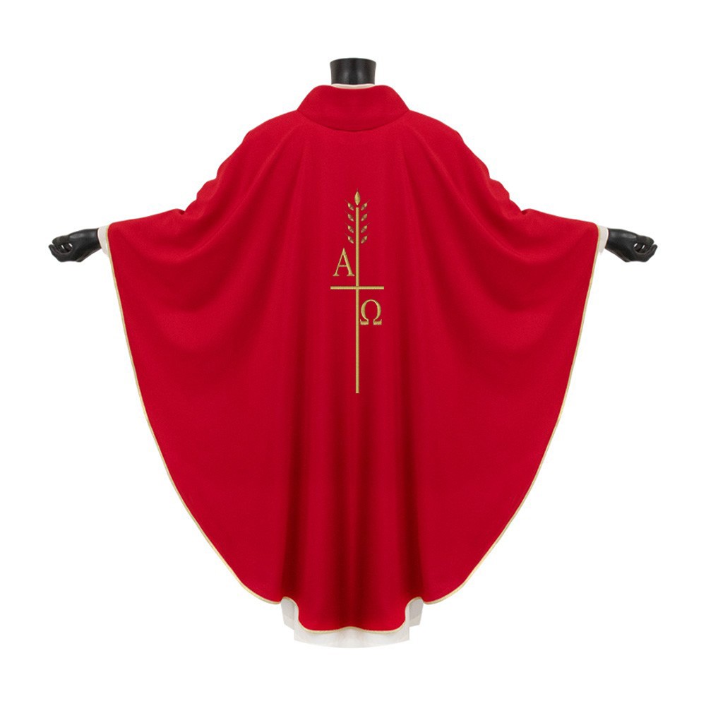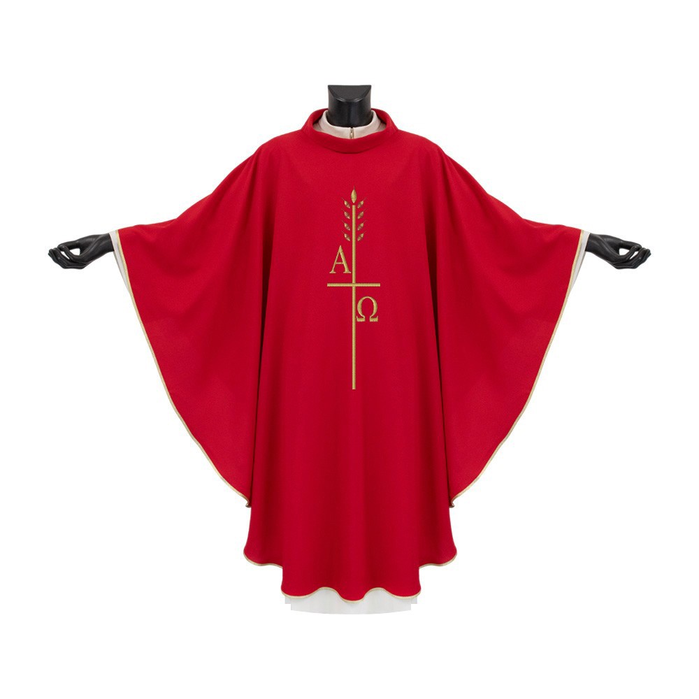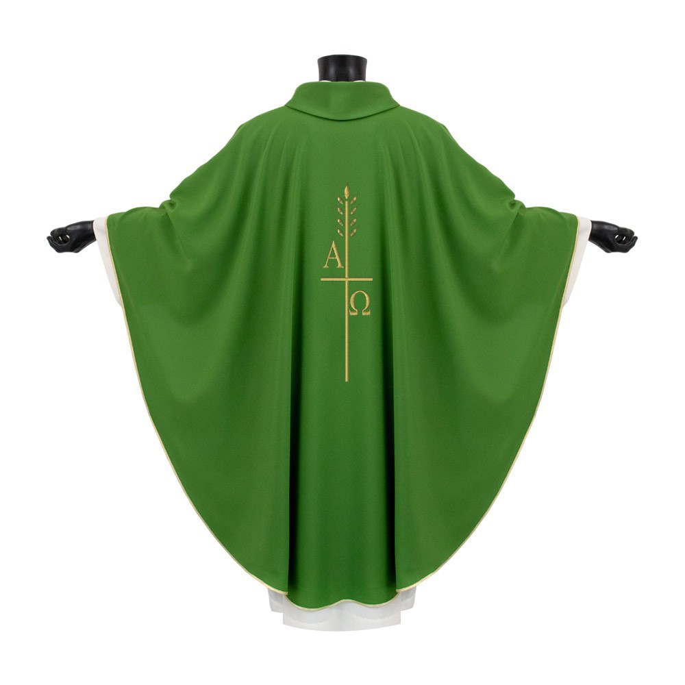 Chasuble for priest in 100% polyester fabric with embroidered "Cross, wheat, and Alpha and Omega symbols."