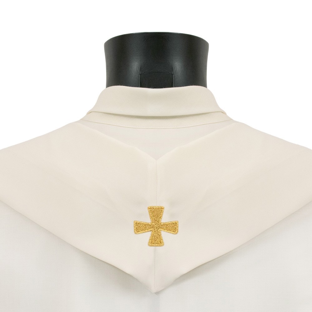 This elegant liturgical vestment was designed, studied, and entirely crafted in our tailoring workshop. Our production uses high-quality fabrics and threads, enriched with inserts and applications in various shapes and colors to ensure comfort and refinement.