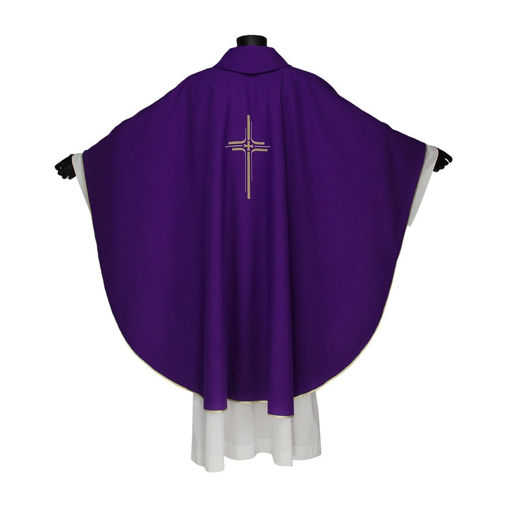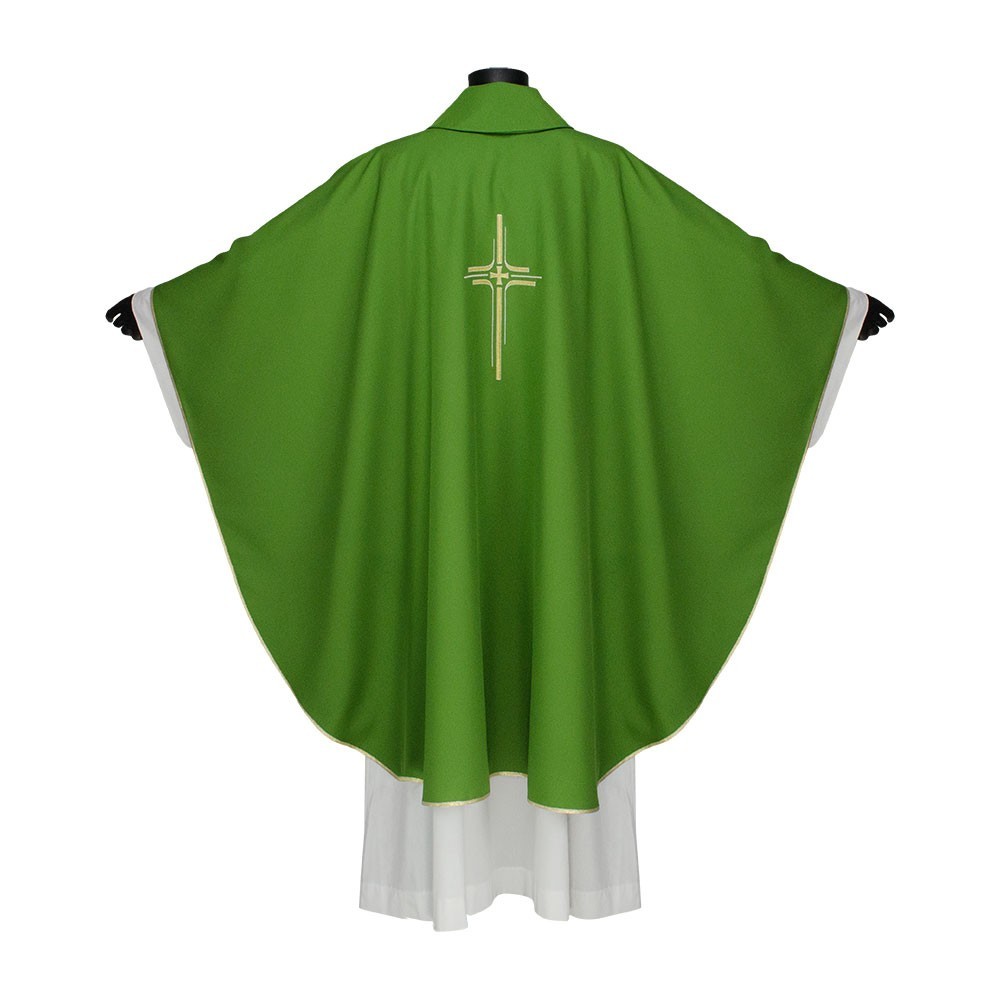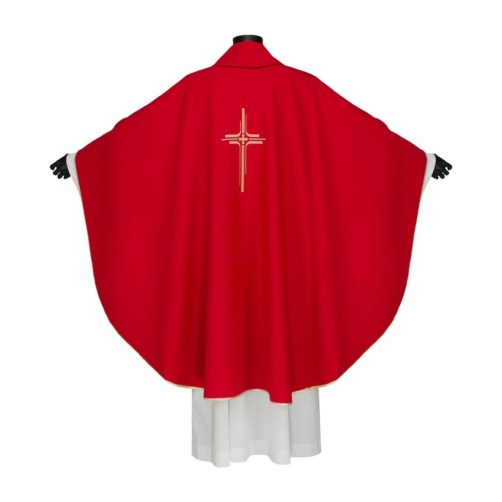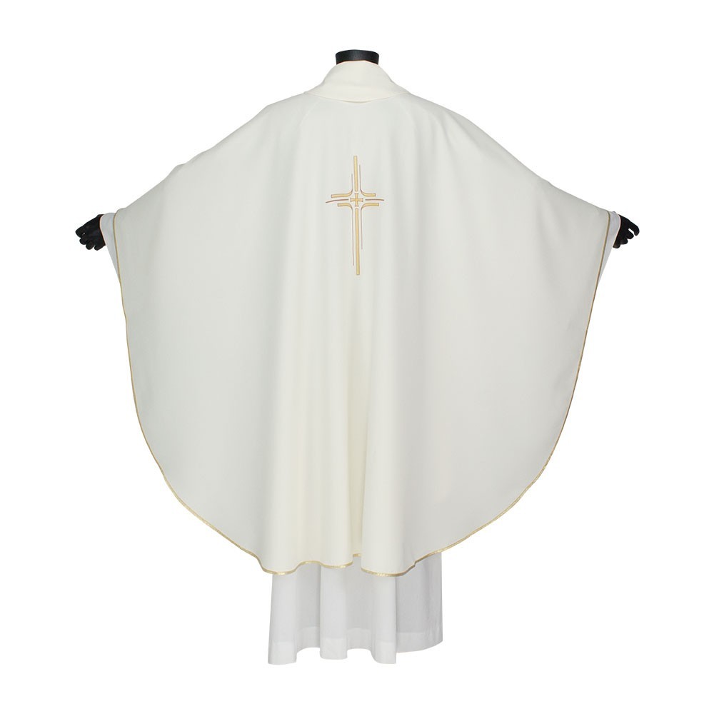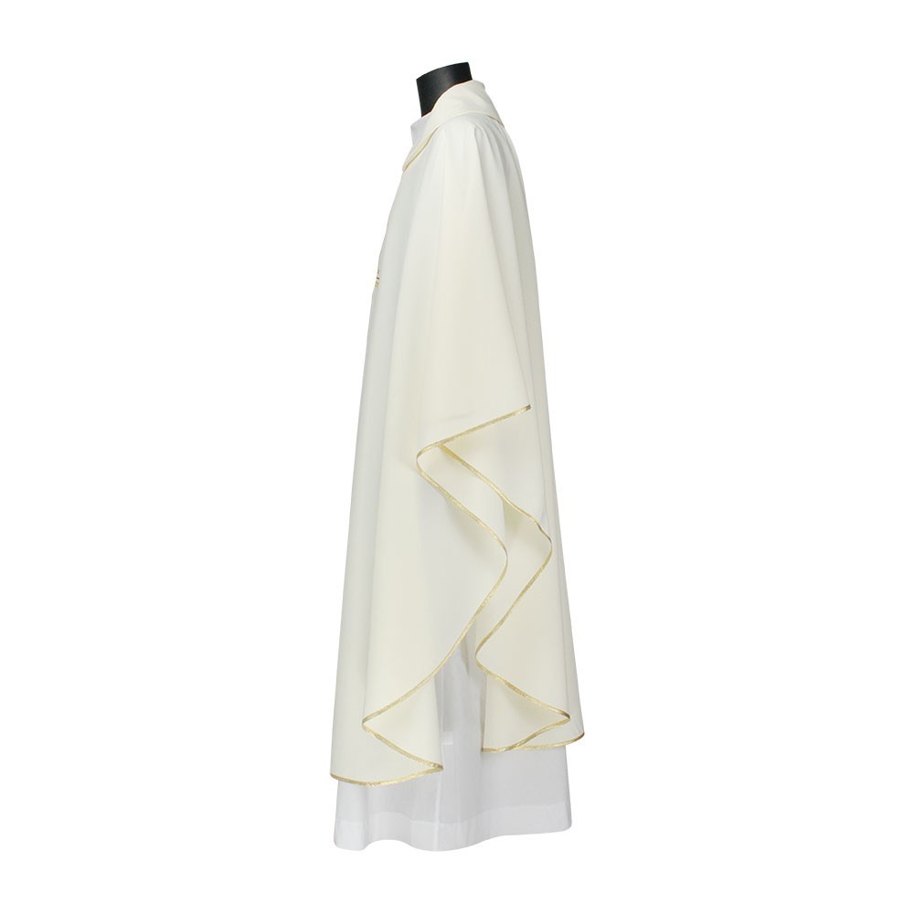Finely embroidered chasuble made of light and resistant polyester fabric, finished with golden trimmings. The embroidery is made by machine and applied both on the front and back side. Supplied with stole. Suitable also for everyday use.