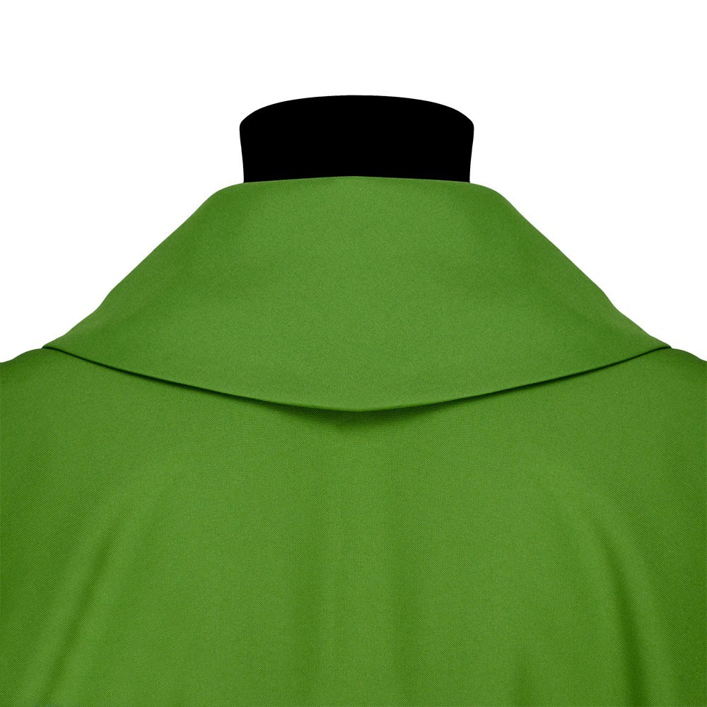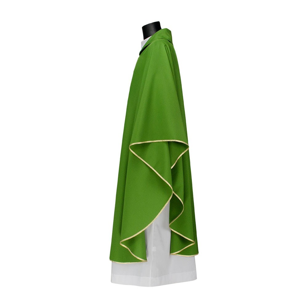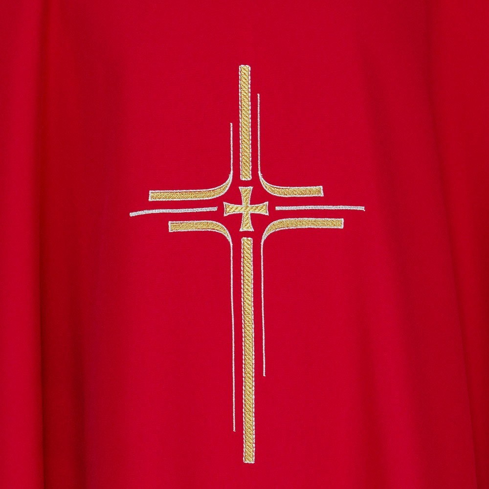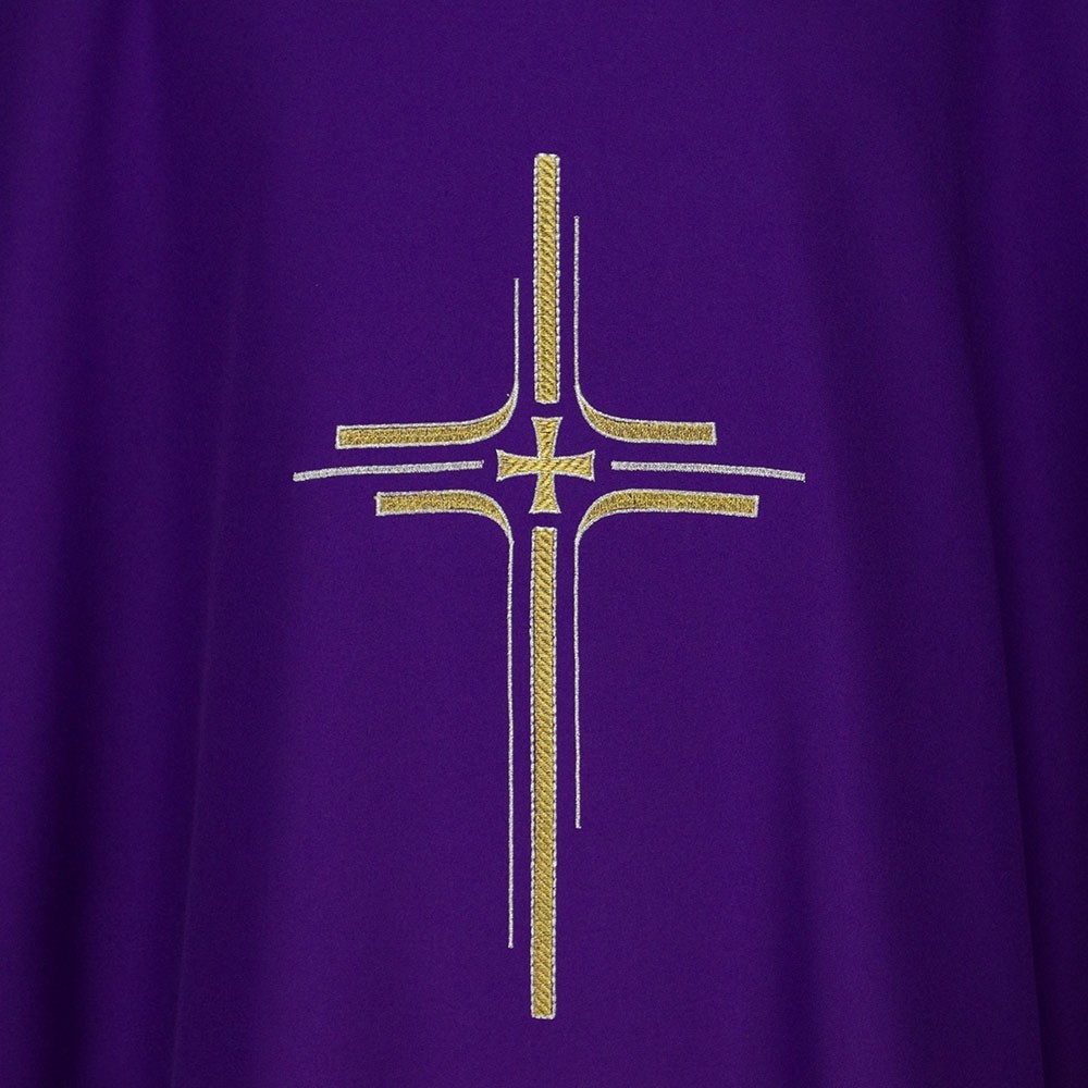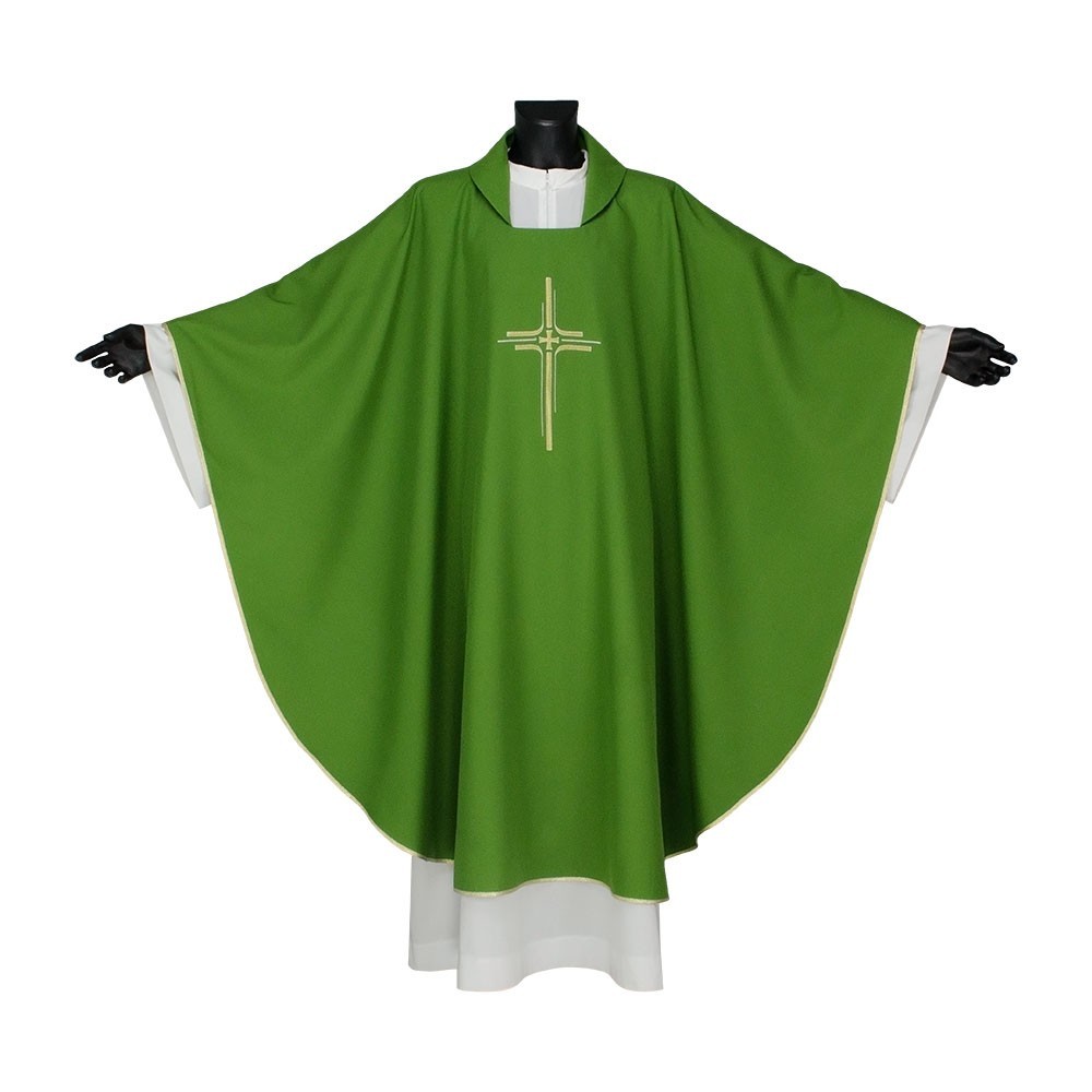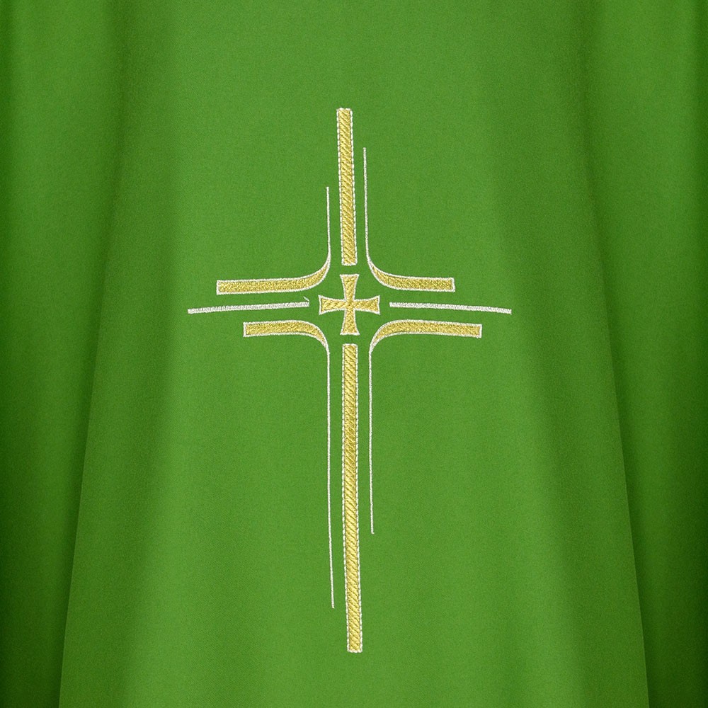 Finely embroidered chasuble made of light and resistant polyester fabric, finished with golden trimmings. The embroidery is made by machine and applied both on the front and back side. Supplied with stole. Suitable also for everyday use.