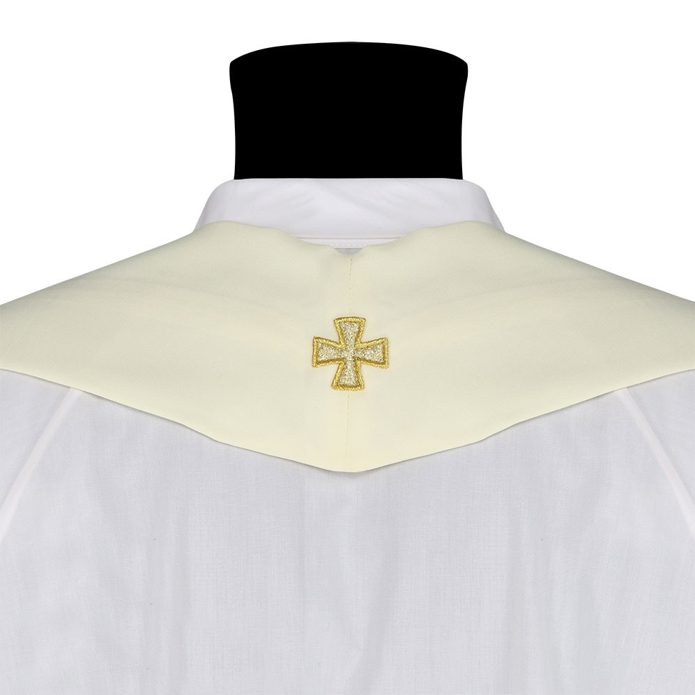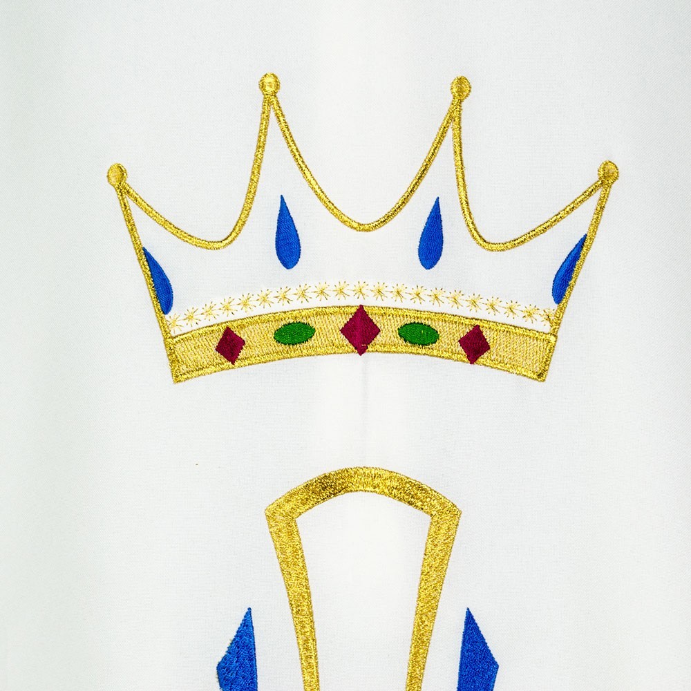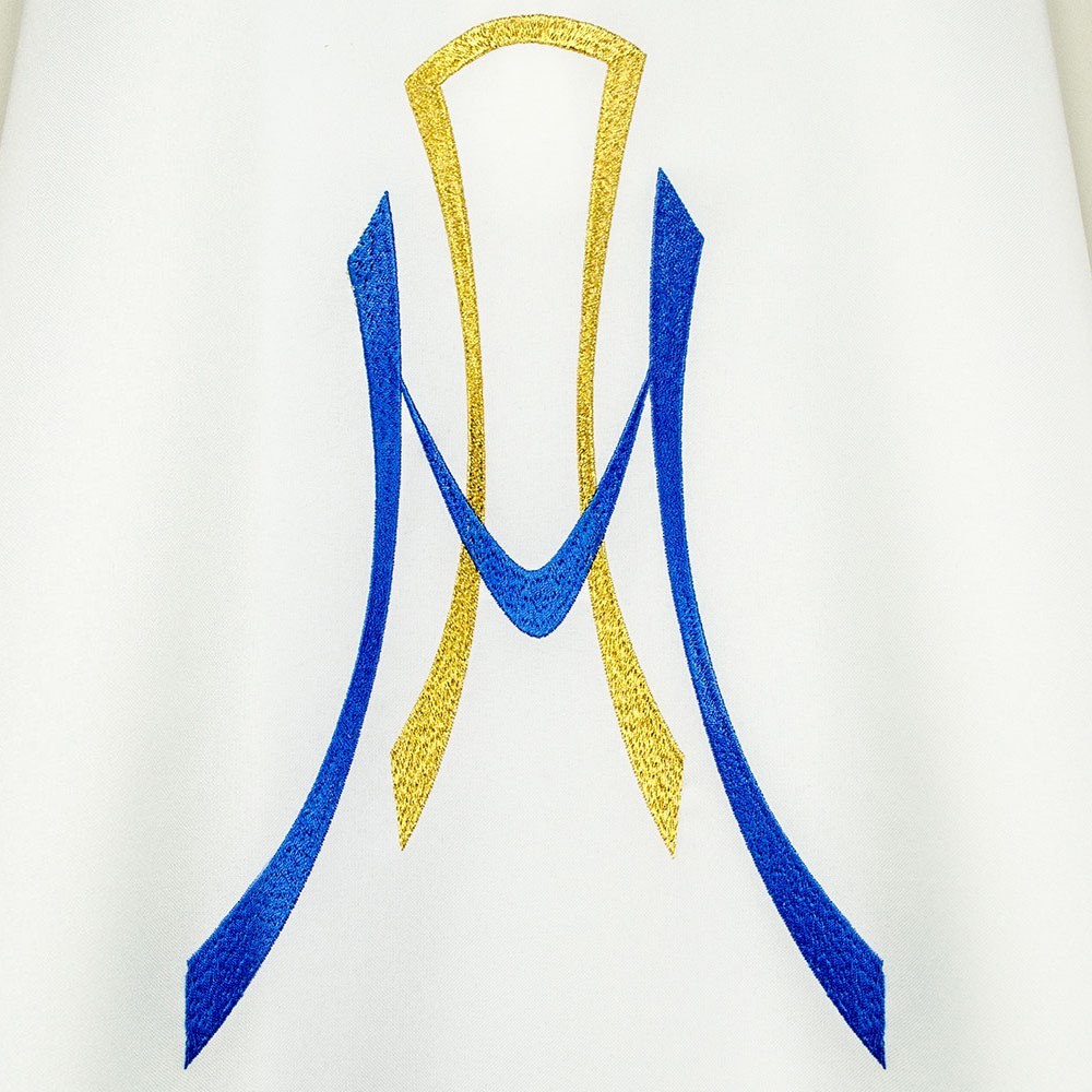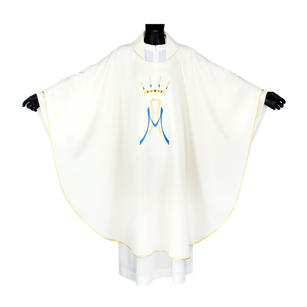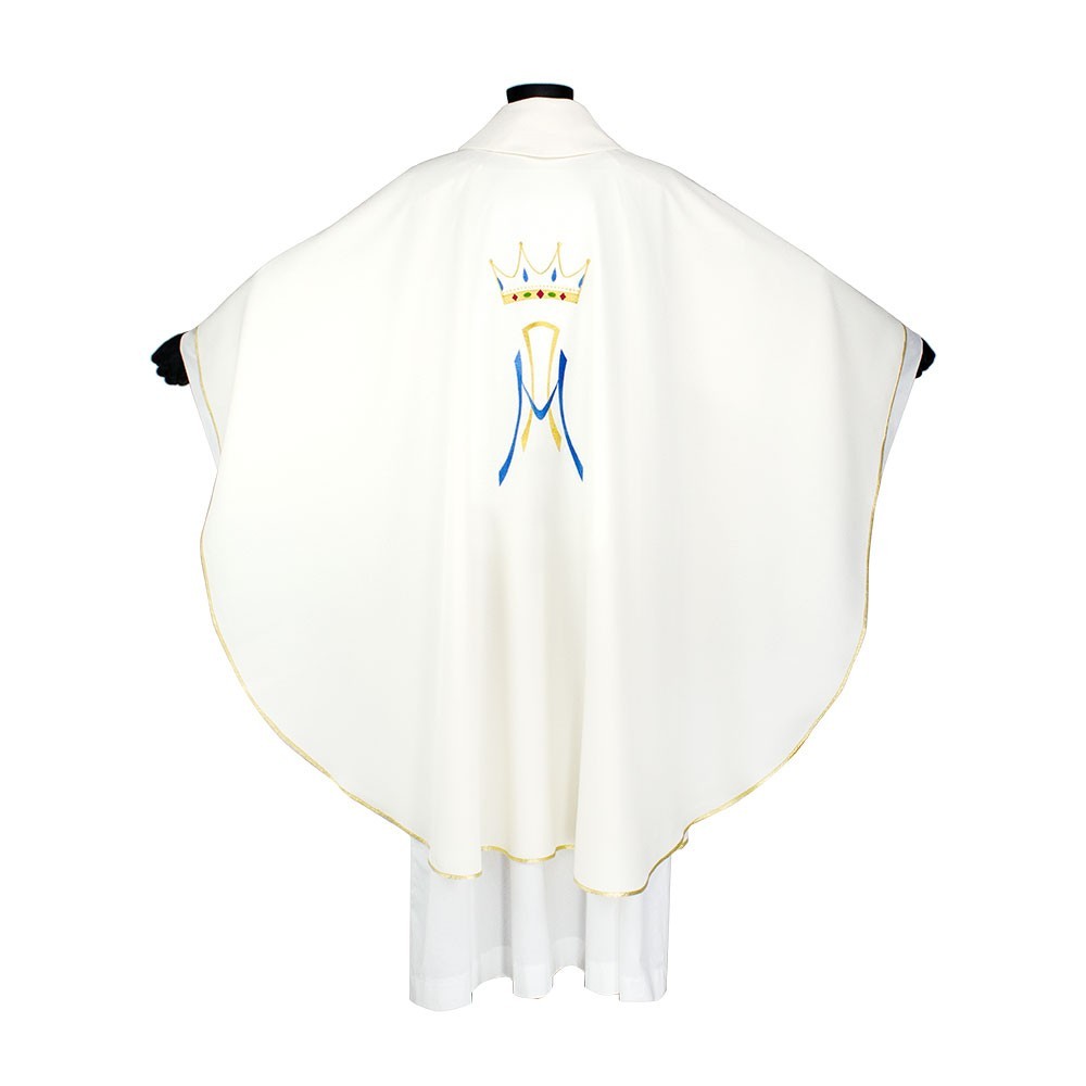 Marian chasuble made of durable polyester fabric. The embroidery depicts Marian liturgical symbols, is machine-stitched, and is featured on both the front and back.