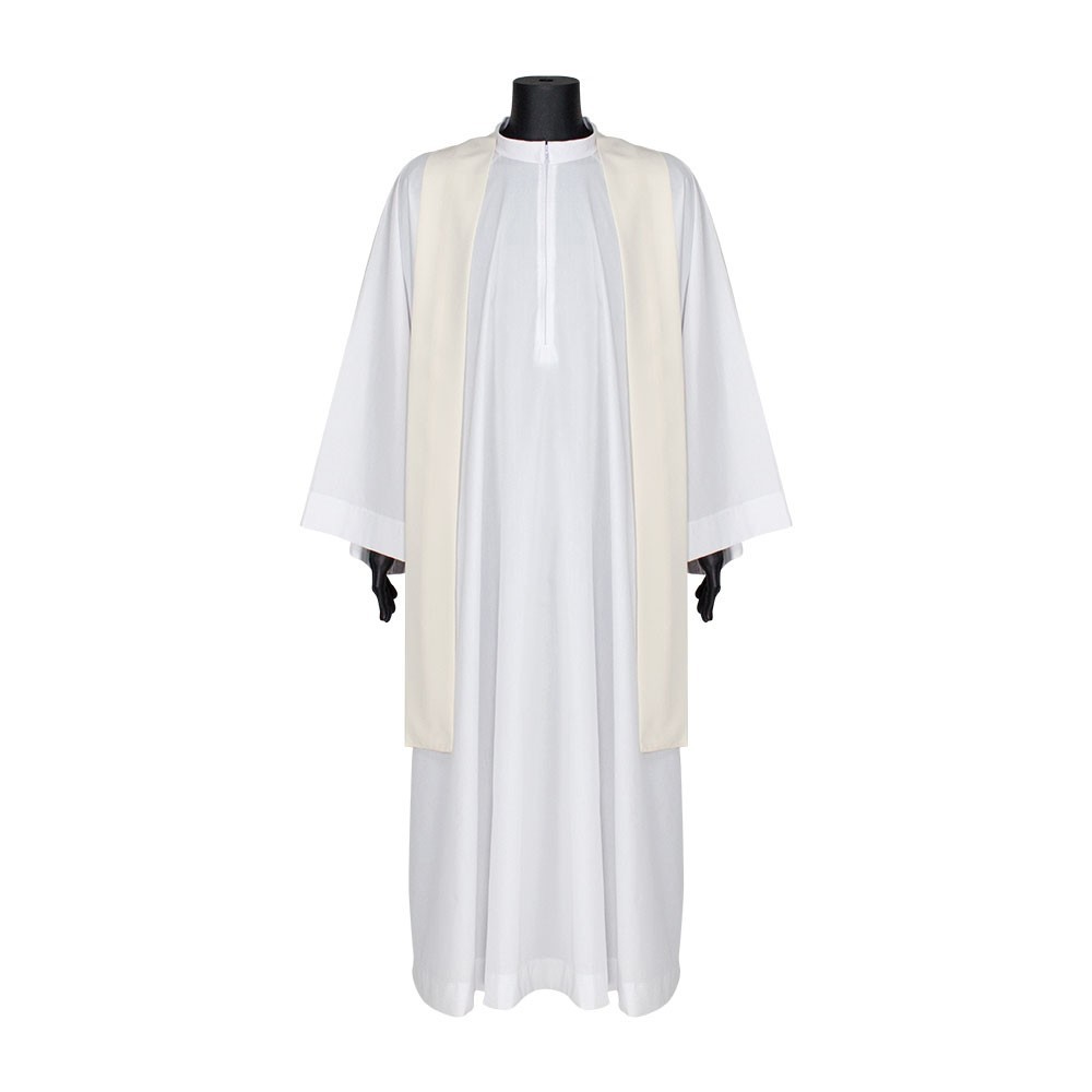 Made from pure wool, while the stole and collar are a blend of wool and polyester.
