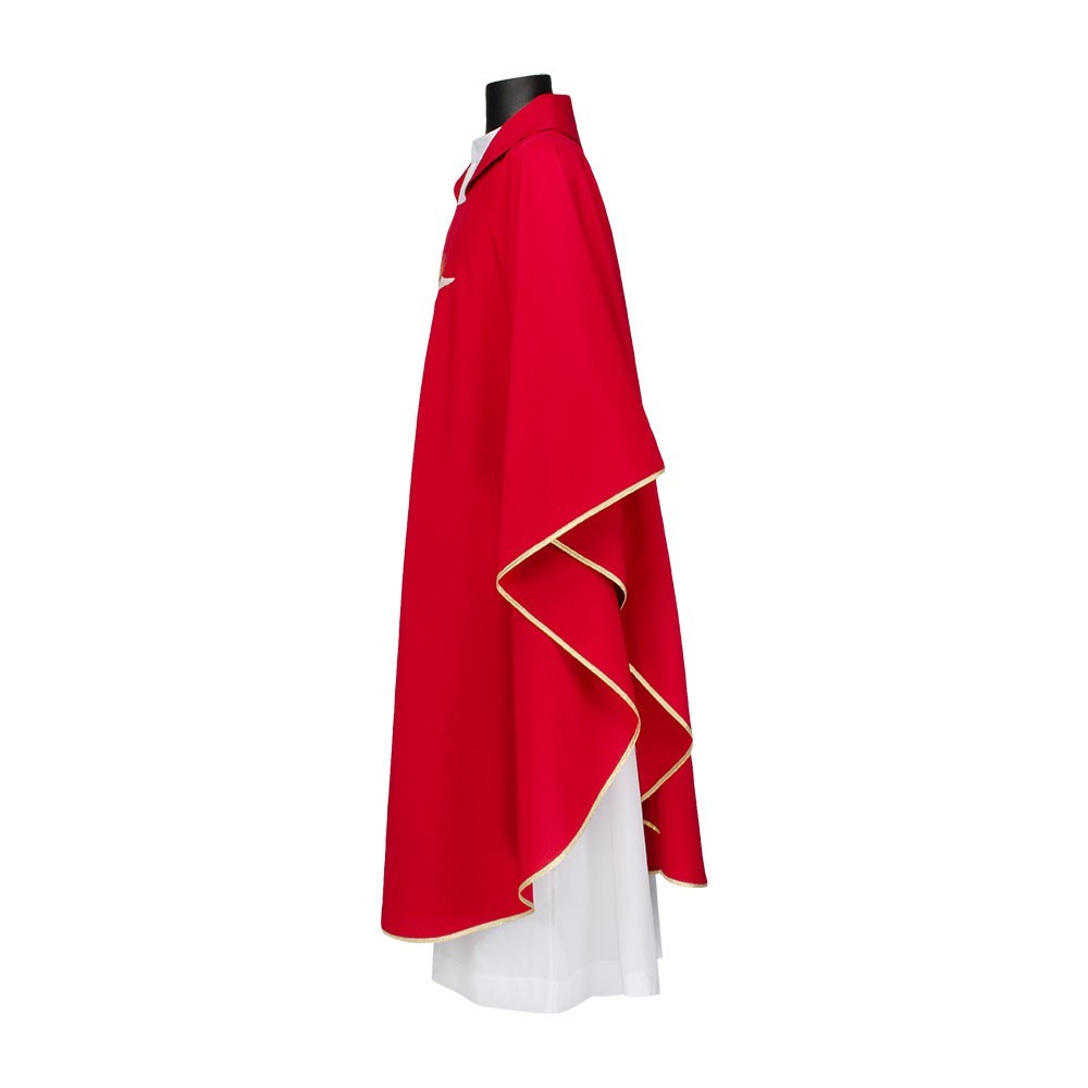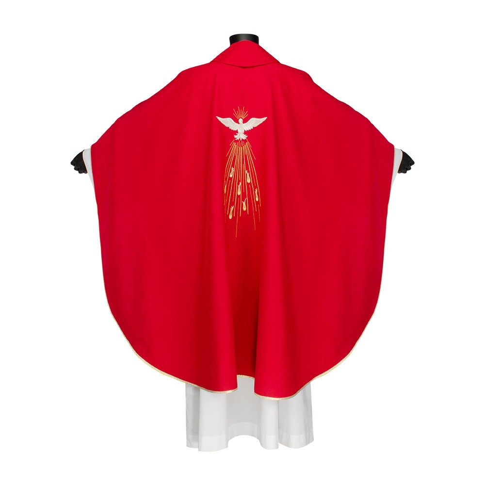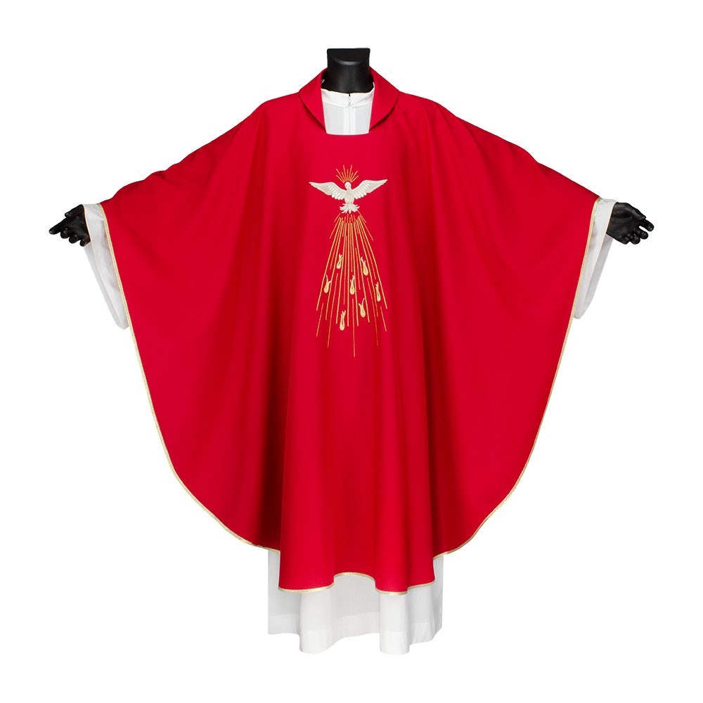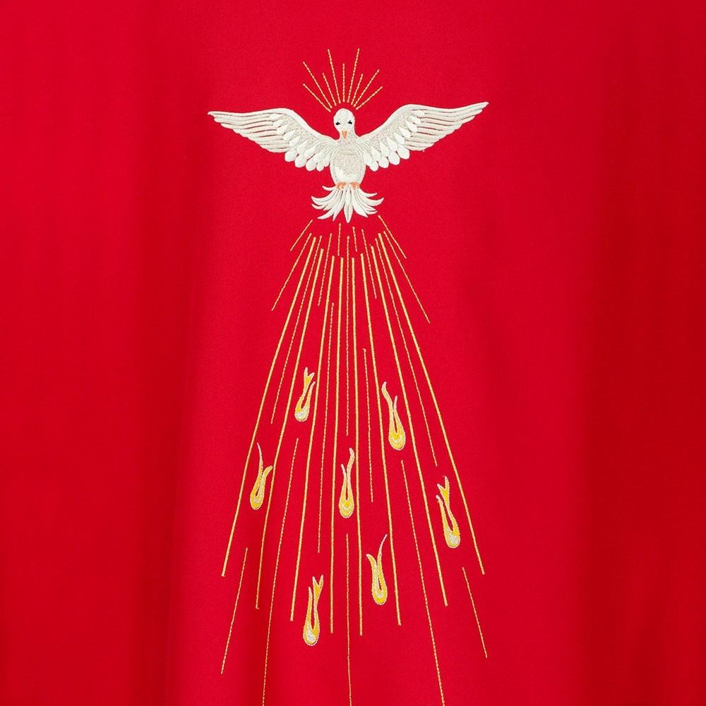 Red Chasuble for Priest with Holy Spirit Embroidery. Made of lightweight and breathable polyester fabric. The embroidery depicts the Holy Spirit (Dove) and flames, featured on both the front and back. Comes with matching stole.