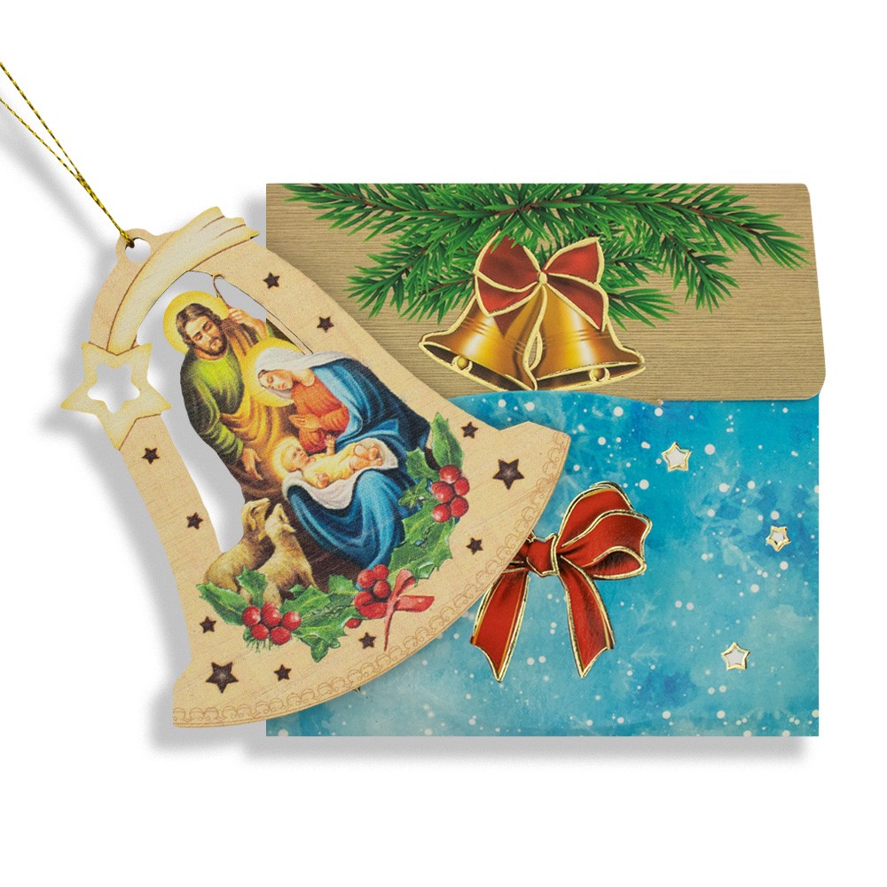 This ornament is made of fretwork wood and is shaped like a bell with printed image of the Nativity scene in the center.