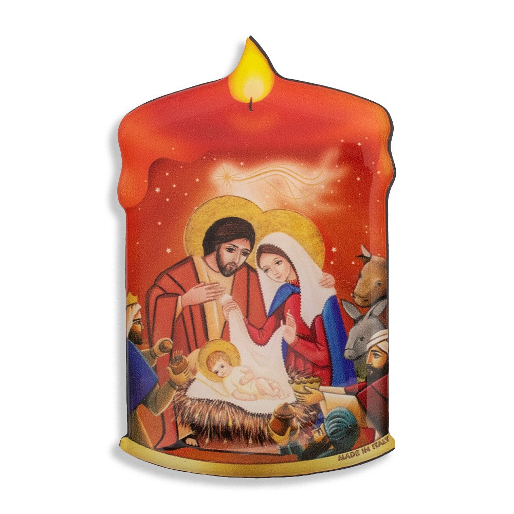 Candle-shaped magnet in resin with image of the Nativity.