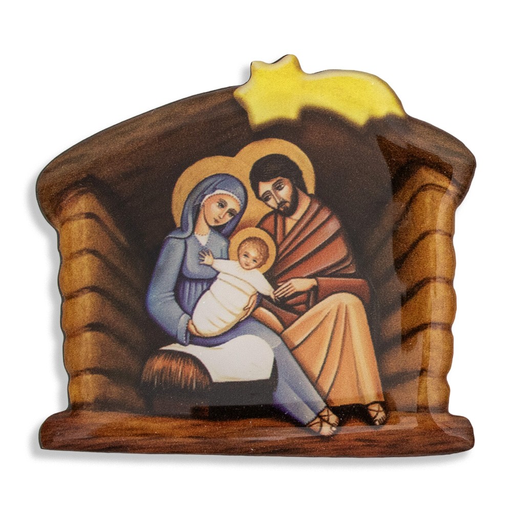 Magnet shaped like a stable with printed image of the Nativity.