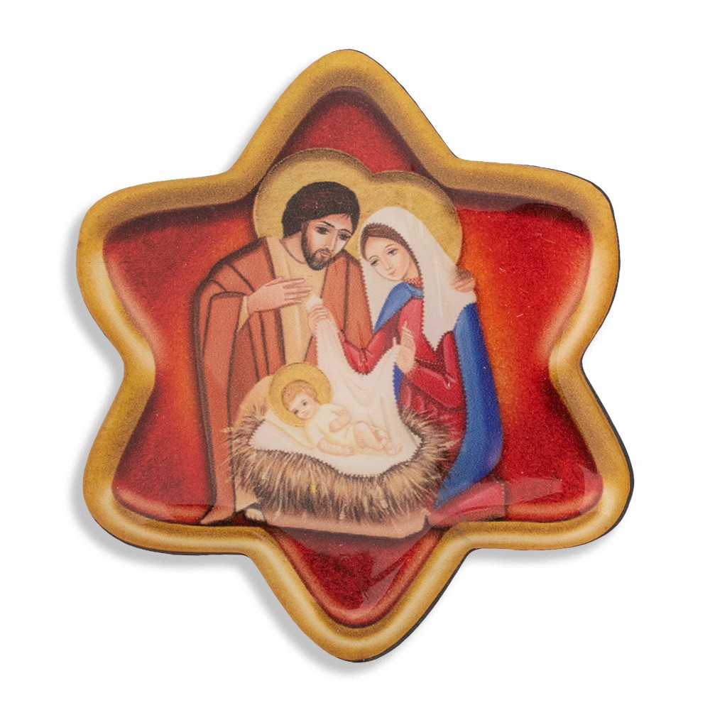 Christmas magnet shaped like a star with image of the Nativity.
