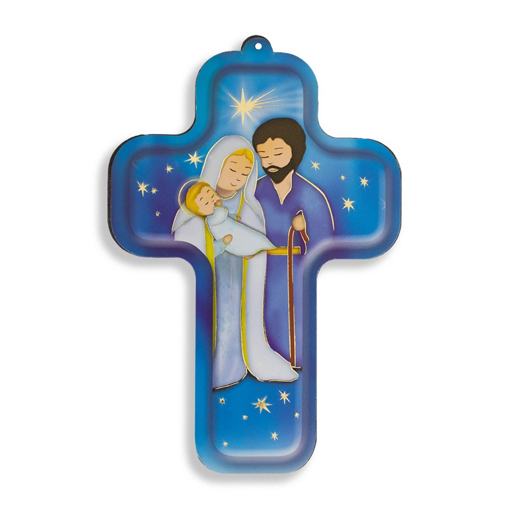 This cross is made of MDF wood with blue background and printed image of the Nativity. It also has a small hole for hanging it.