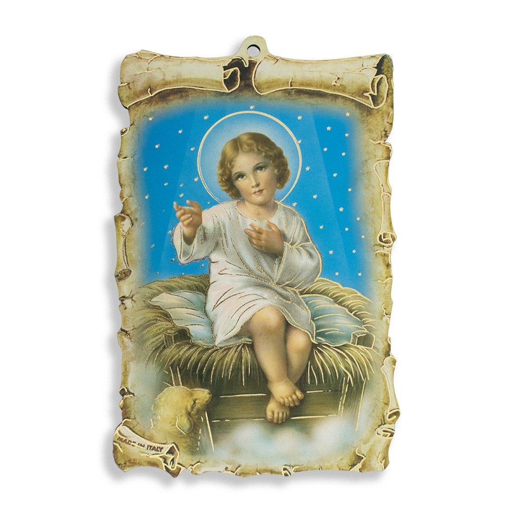This picture shaped like a scroll is made of MDF wood with image of Baby Jesus and hot foil stamped decorations. Complete with hole for hanging it.