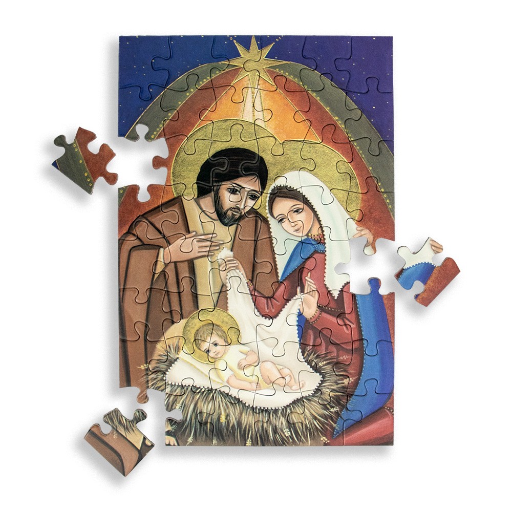 Puzzle-shaped Christmas card with printed image of the Nativity.